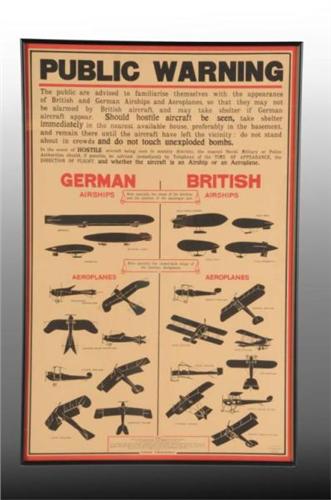 Description Dated 1915. By Sr. Joseph Canston of London. Depicts British and German airships and airplanes. Framed under glass. Condition (Excellent). Size 23" x 36".