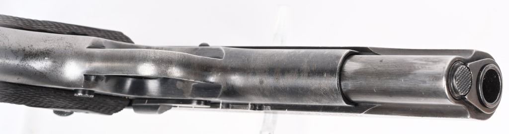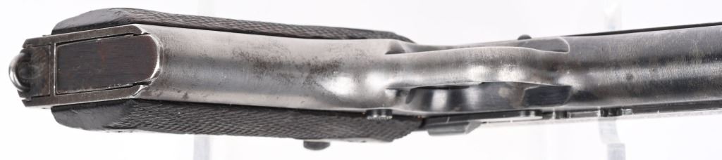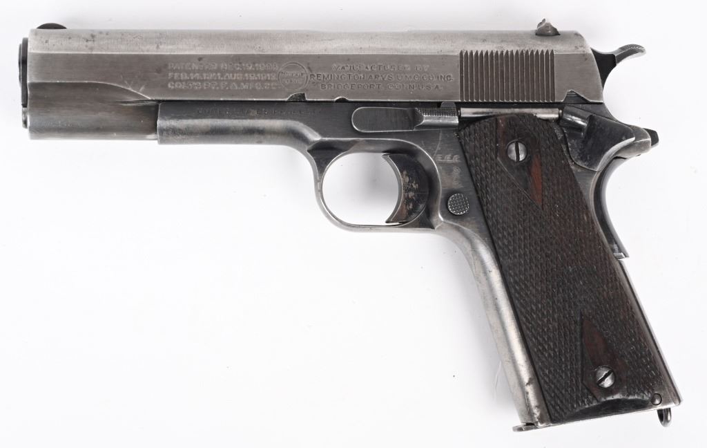 SERIAL NUMBER 10342 BARREL 5" CALIBER .45 ACP MANUFACTURED 1917.Produced only in 1917 by The Remington UMC company. Brushed blue finish with diamond pattern checkered walnut grips, flat mainspring housing, short early grip safety and long wide checkered hammer. Inspected on left side of frame "E.E.C." as well as marked "UNITED STATES PROPERTY" Blue finished barrel with simple "P" proof at top. Slide marked with 3 line patent markings and Remington Arms address as well as "REMINGTON UMC" monogram. Fitted with unmarked 2 tone magazine. CONDITION. Good with slide having toned to dove grey and frame retrains 50% thinning blue. All markings and legends are crisp. Action operates properly. Grips are good with moderate wear. Bore is worn with oxidation in grooves. C&R