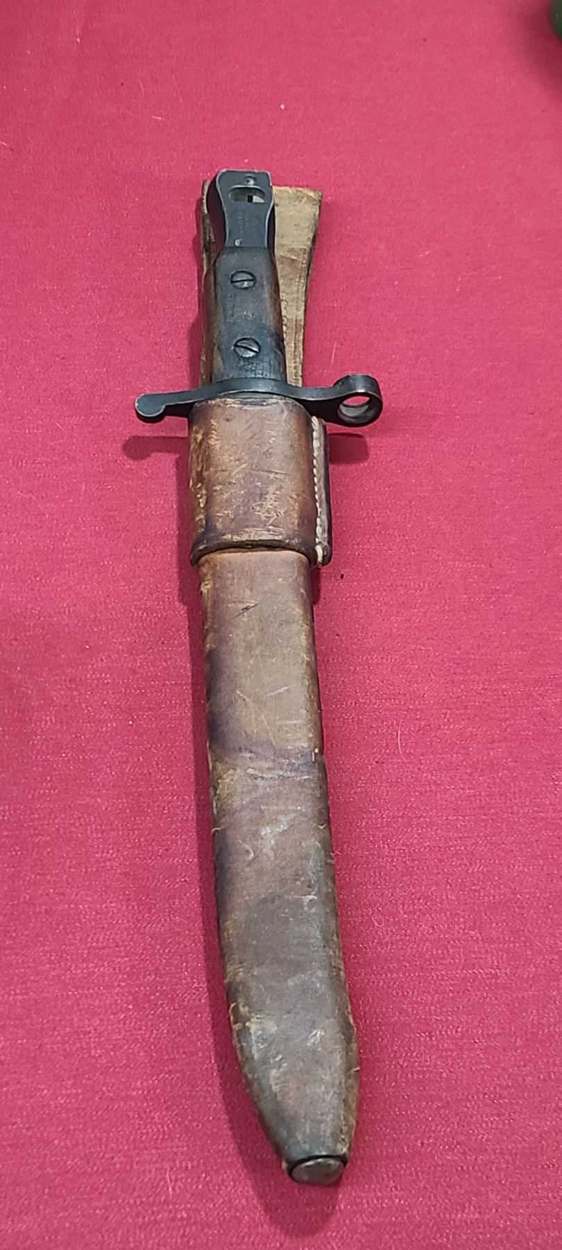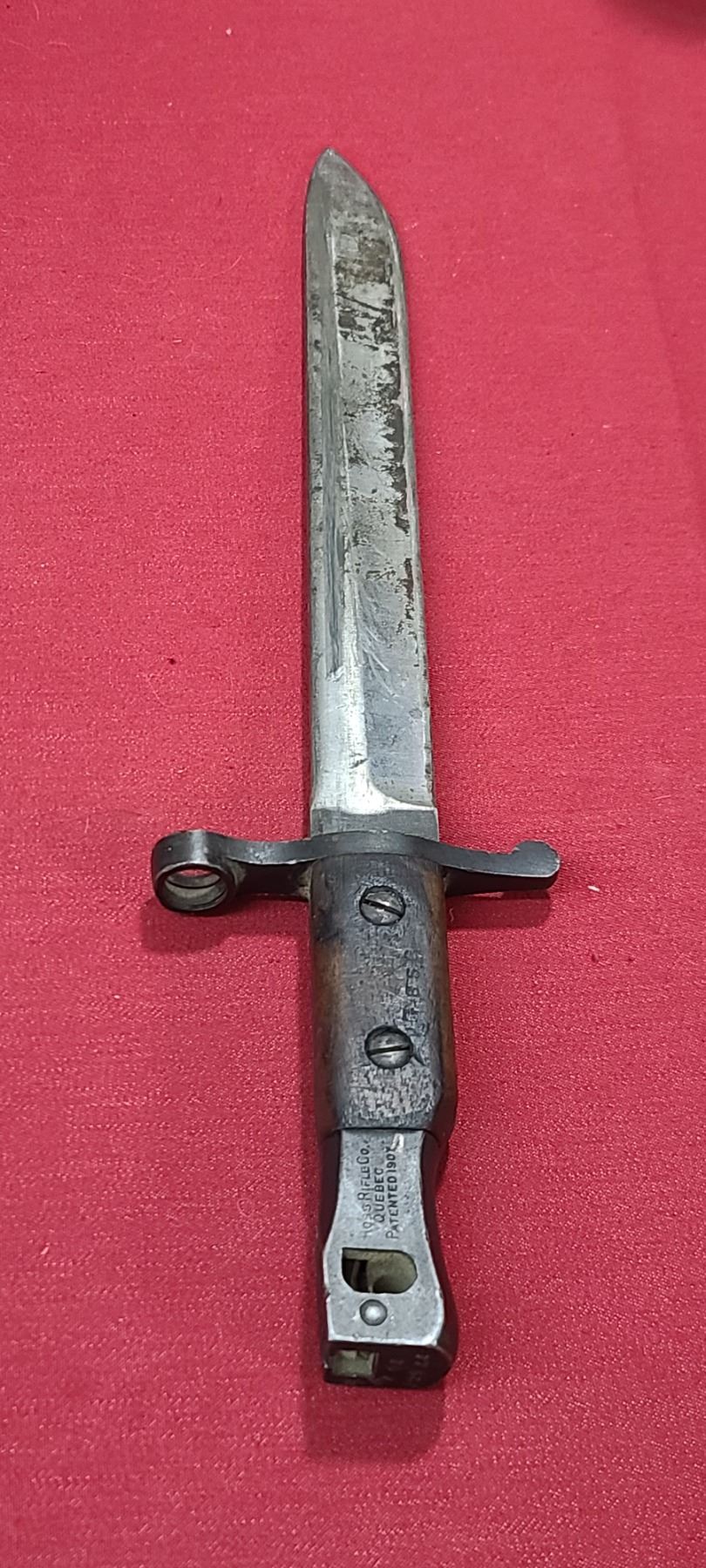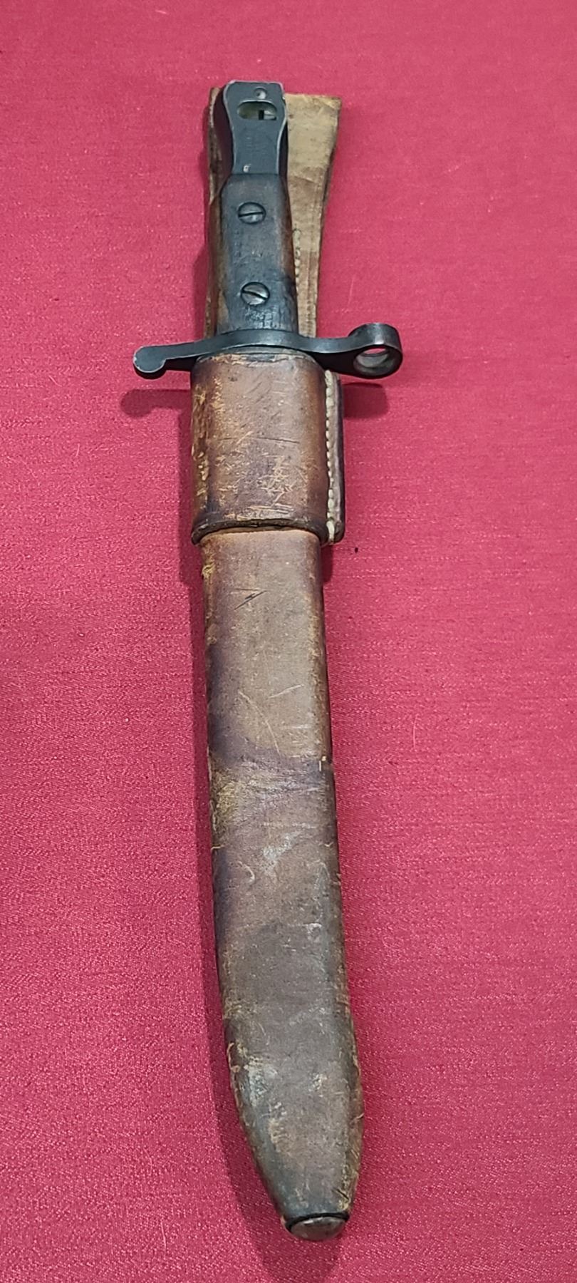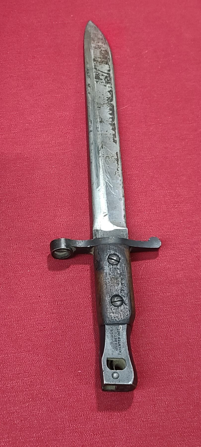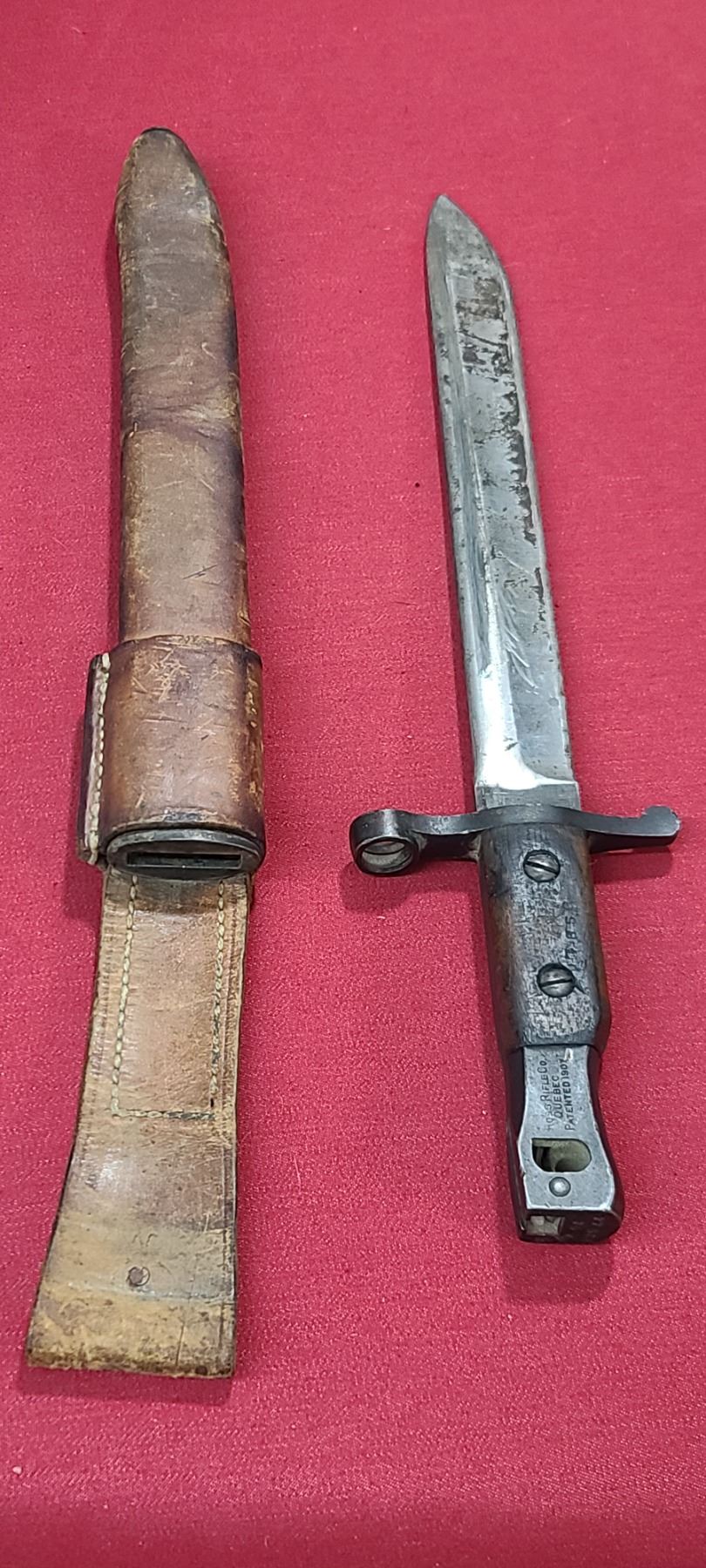 WW1 ROSS RIFLE CO BAYONET FOR ROSS MKIII COMES WITH ORIGINAL SHEATH - MISSING BAYONET LUG BOLS - PLEASE SEE IMAGE - PEN MARKS MISSING PART