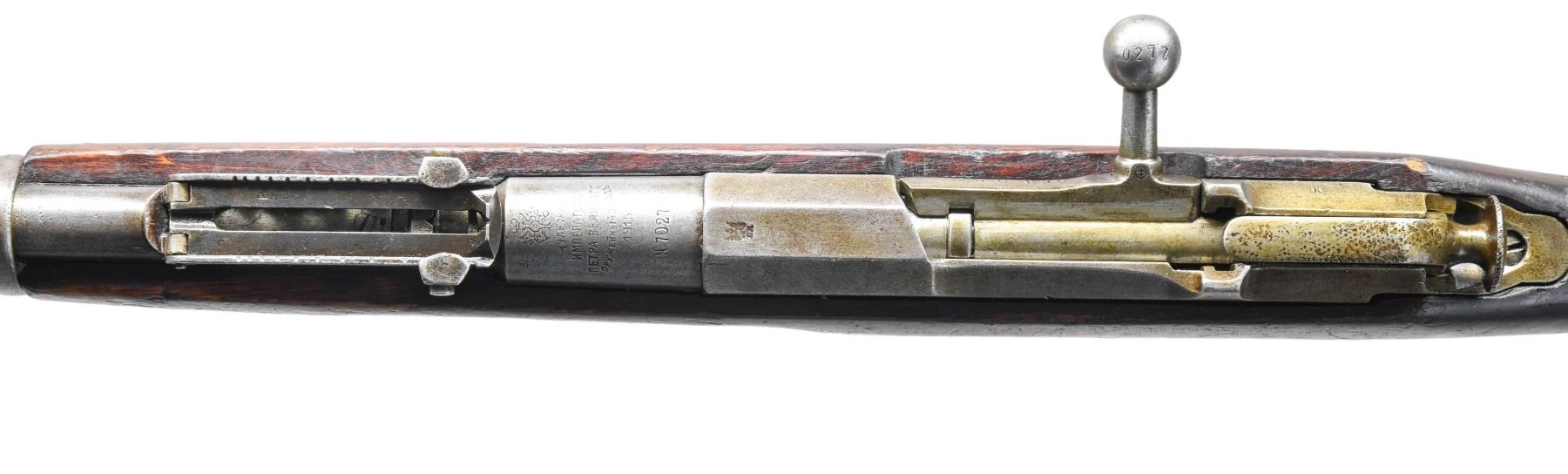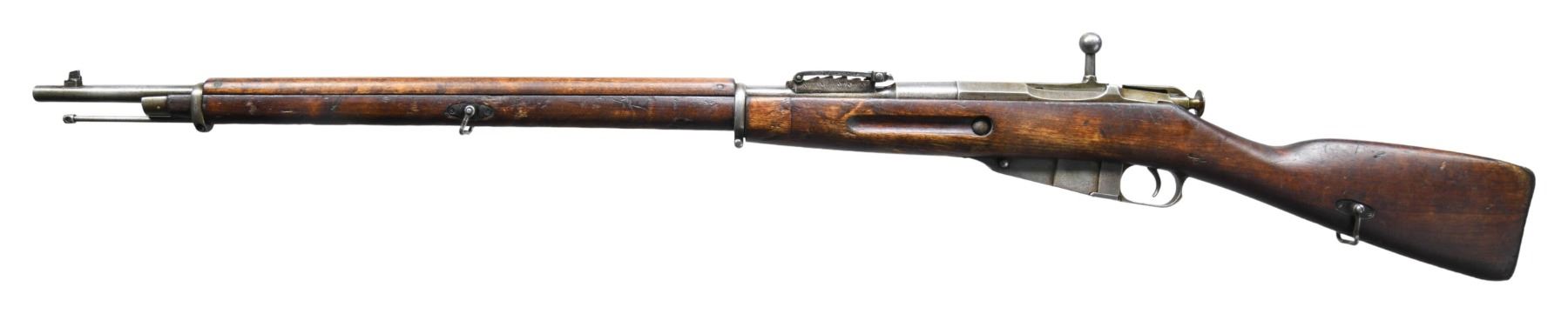 Cal. 7.62x54R. S# N70272. Bbl. 31 1/2" with Century import marking. Blade front sight. Konovalov rear sight with Finnish renumbered graduations. Matching numbers on bolt knob & bbl. shank. Other parts unnumbered or mismatched. Bbl. shank has Tula Peter the Great markings with intact Czarist eagle & 1915 date. Finnish two piece stock set with bottom mounted wire hangers & strong cartouche on right side of butt. Cleaning rod present. CONDITION: stock set shows a light chip behind upper tang, scattered finish loss, dings, scratches & handling marks. Metal is mostly a gray color with scattered light pitting, handling marks, oxidation & scratches. Action functions properly when hand cycled. Bore shows scattered pitting, a counterbore at muzzle & oxidation but evident rifling. (25-2837/MJC). CURIO. $300-500.