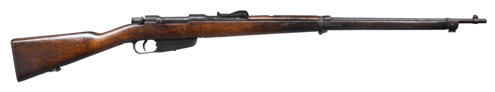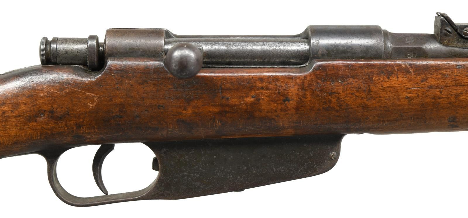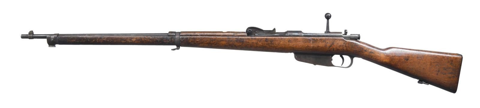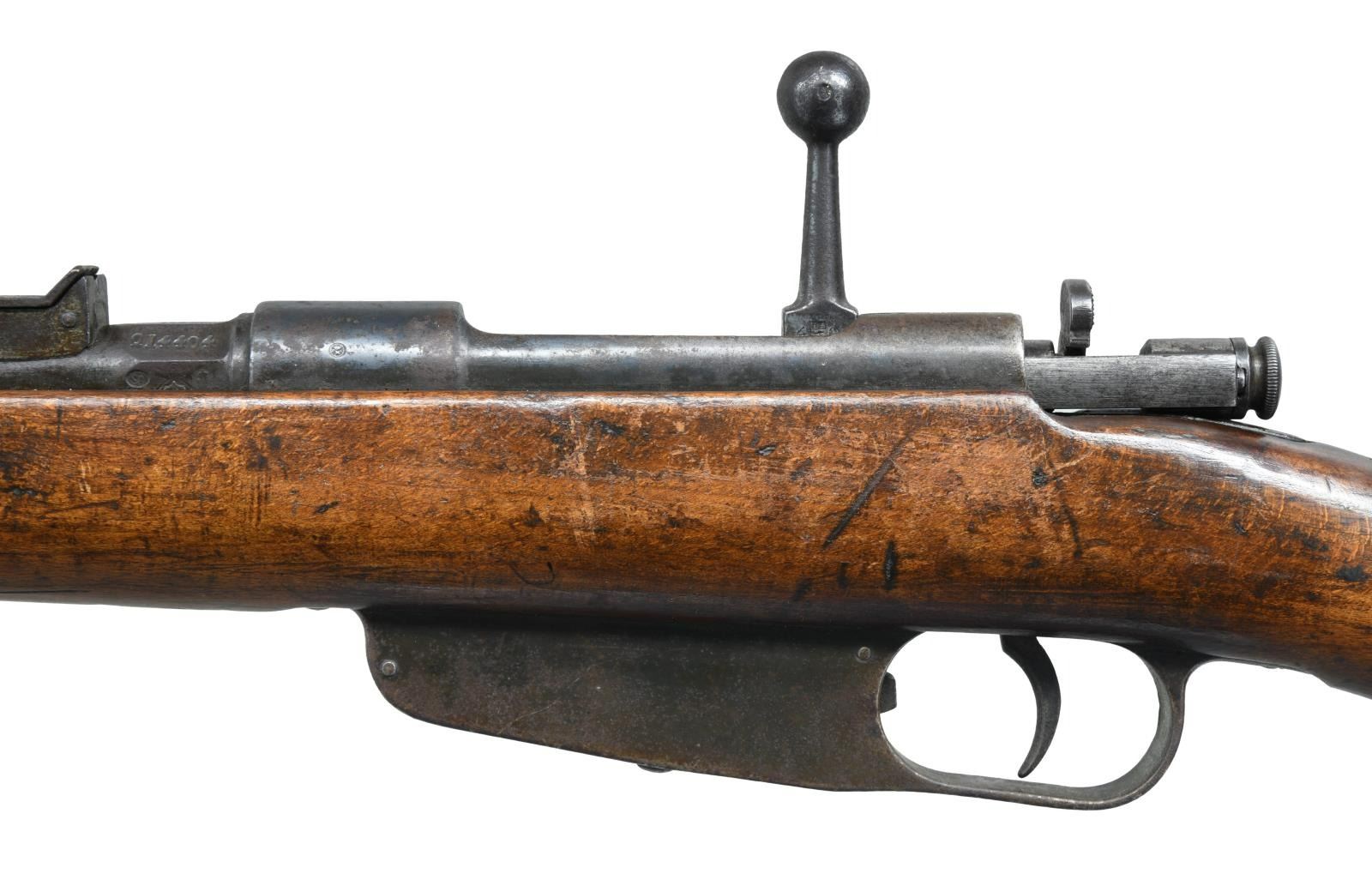 Cal. 6.5 Carc. S# Q14404. Bbl. 30 1/2". Matching number on bolt handle & mismatched number on stock. Bbl. has Terni marking, crossed rifle marking & 17 date denoting 1917 mfg. Tangent rear sight graduated to 2000m. Blade front sight. Hardwood stock set w/ bottom mounted slings swivels. No cleaning rod present. CONDITION: stock set has added finish w/ a small crack behind upper tang, scattered flaking, handling wear & dings. Metal is mostly a dull brown patina w/ scattered oxidation & traces of arsenal blue. Worn dark bore. (23-2484/MJC). CURIO. $150-250.
