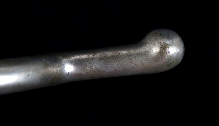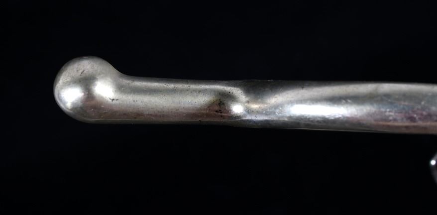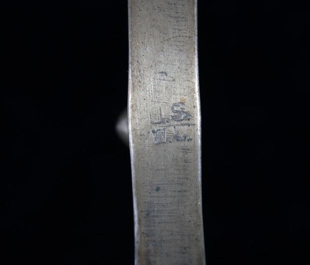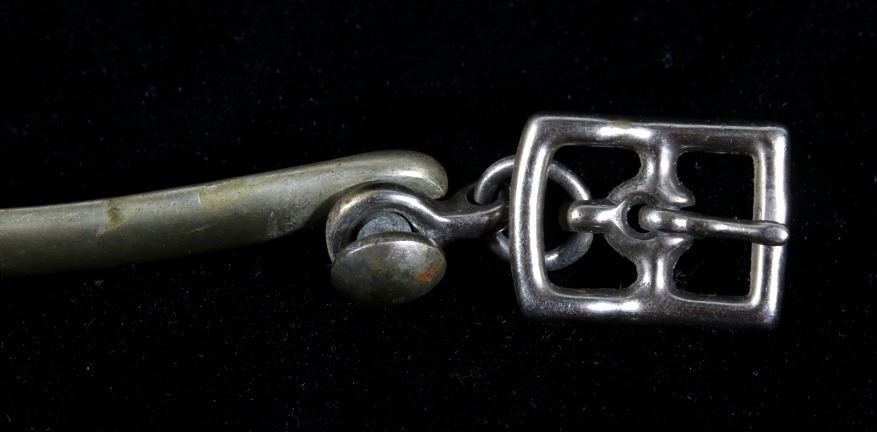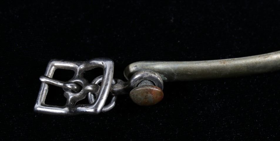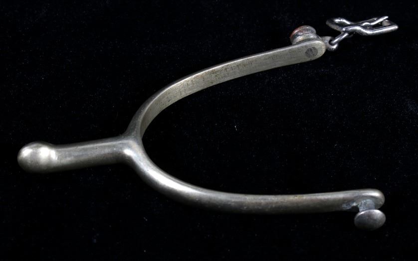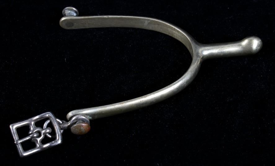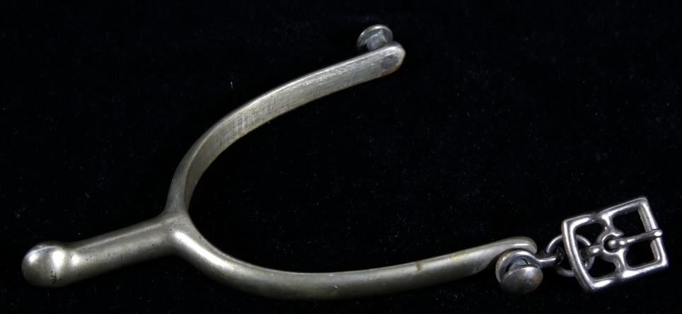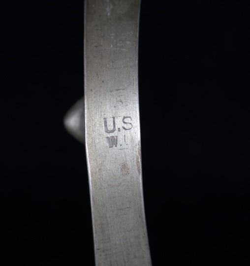 Available in this lot we have a pair of U.S. Cavalry officers spurs by Whitehorse Lecompte originating from the first World War. The spurs show nickel construction with a light brass patina across the piece. The spurs are each marked on the interior reading "U.S. W.L" indicating that the spurs where made by Whitehorse Lecompte. The spurs come with the nickel buckles, but are missing the leather straps themselves. The pieces show a clean and straight forward design with a shank, but no rowel. The spurs show good condition overall with some minor wear due to age. The pieces measure 5 1/4" long by 4 1/4" wide.