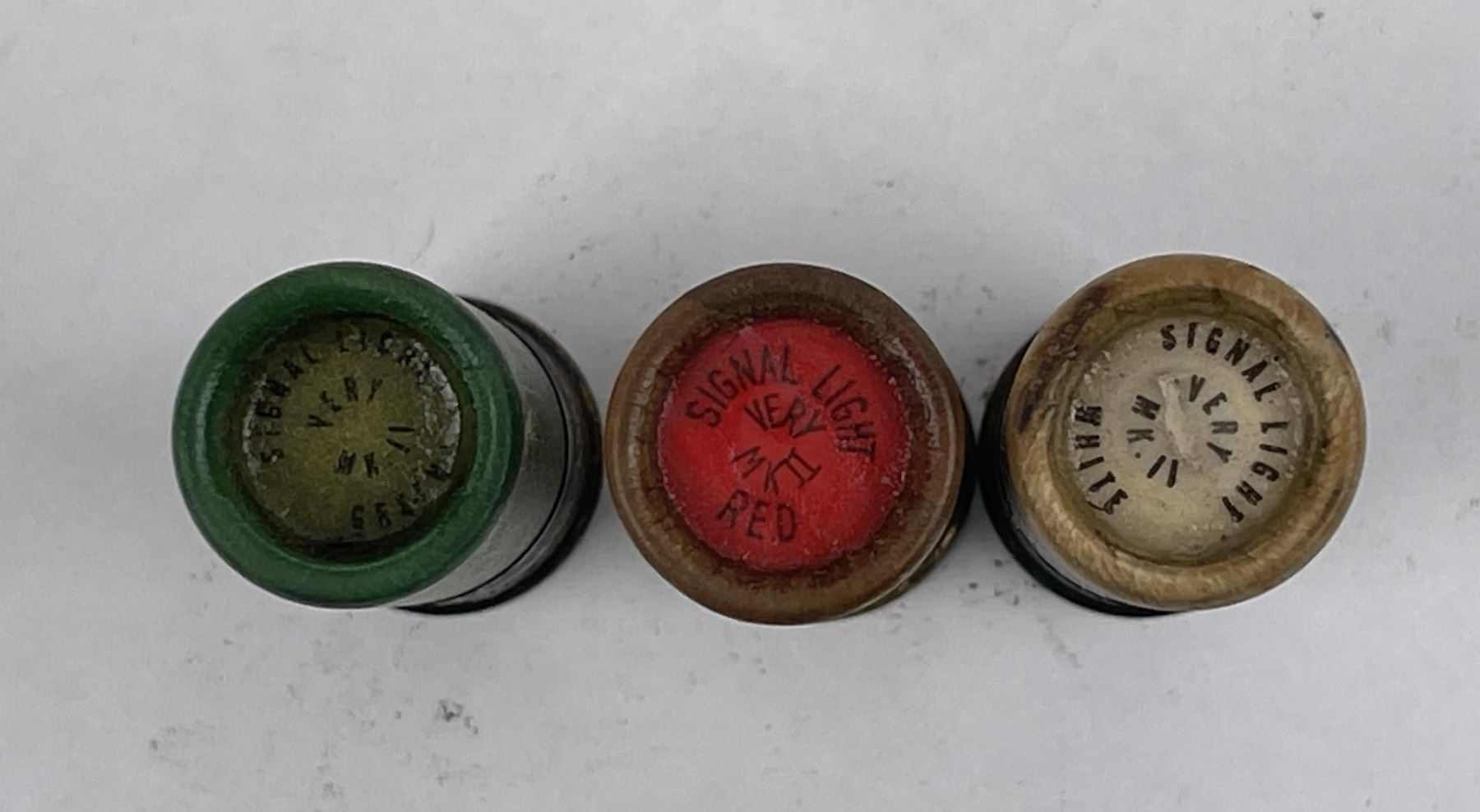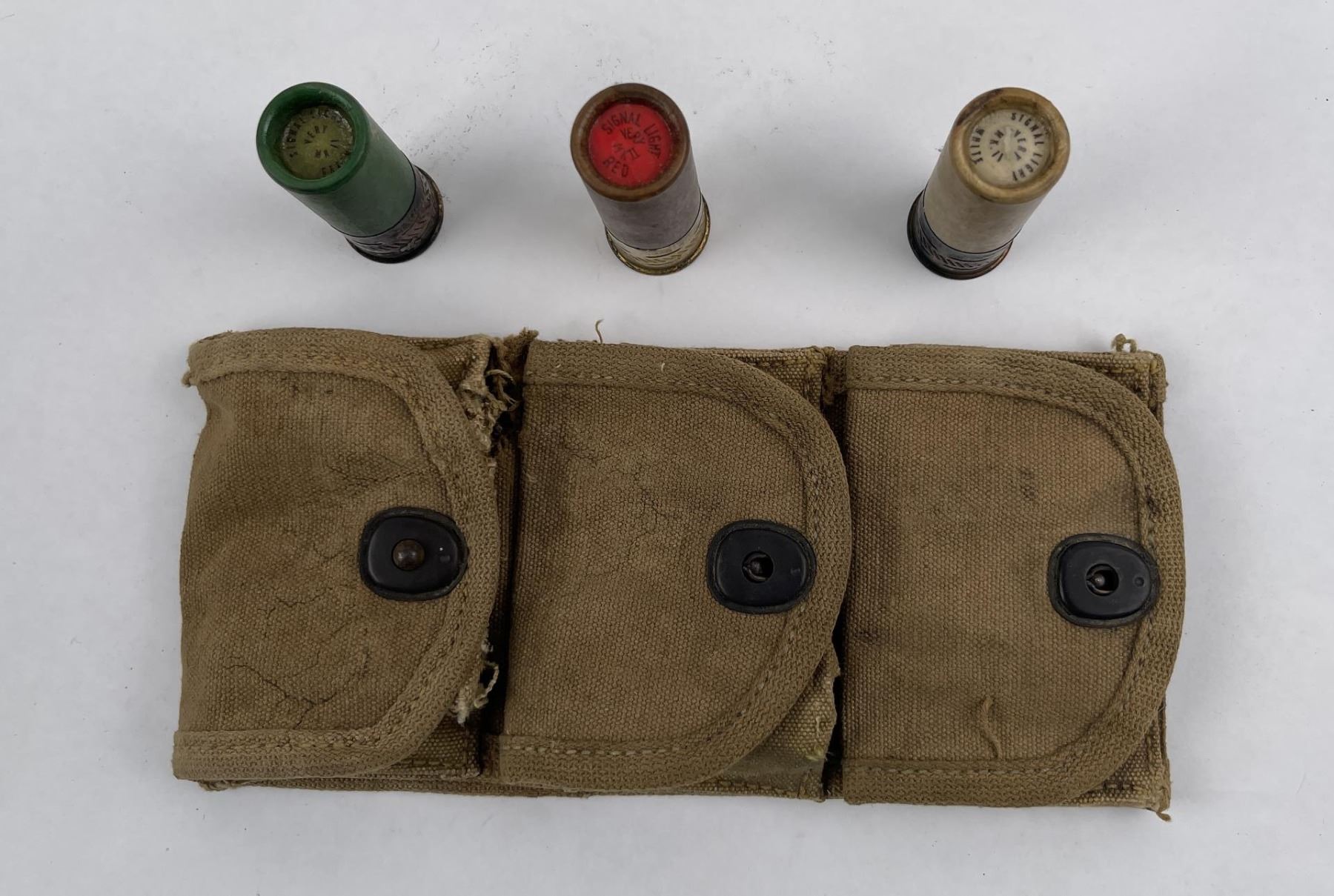 3x WW1 Remington Mk III Very Pistol Rounds. Comes with some shells - Red, White, Green.