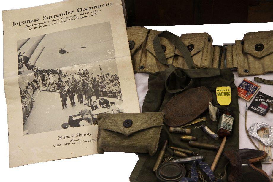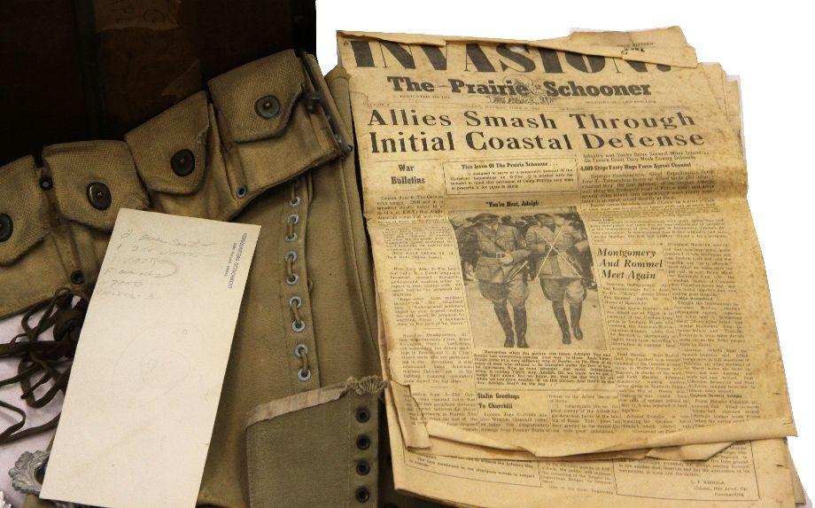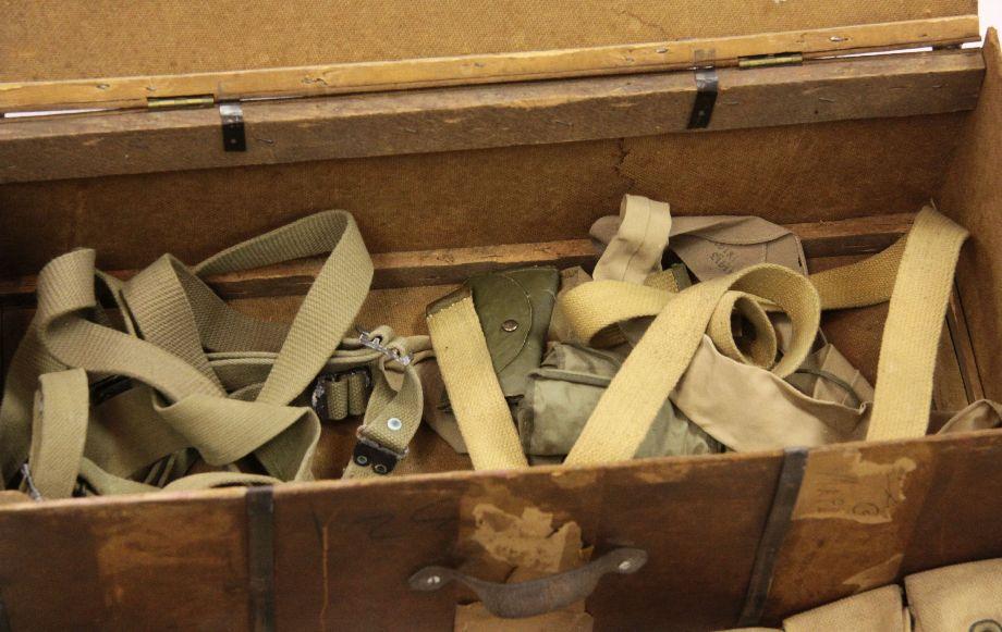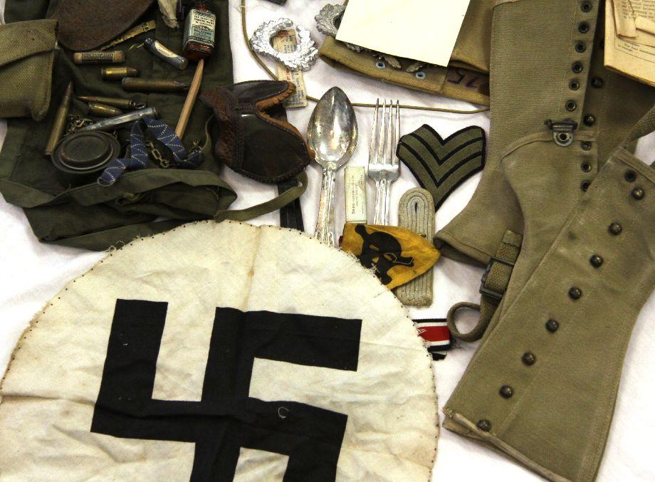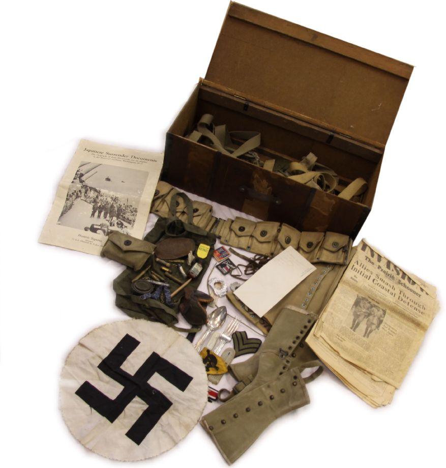 An old trunk full of first and second war gear to include web ammo belt, leggings , and more , a separate plastic bag has a few Nazi items , a WW1 German ribbon, cutlery from WW1 & 2, early war time matchbooks, condoms and more, the trunk has war time newspapers and more even remnants of a third Reich flag.