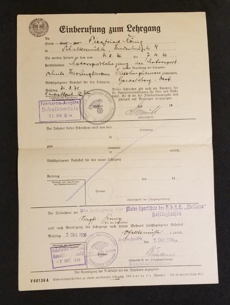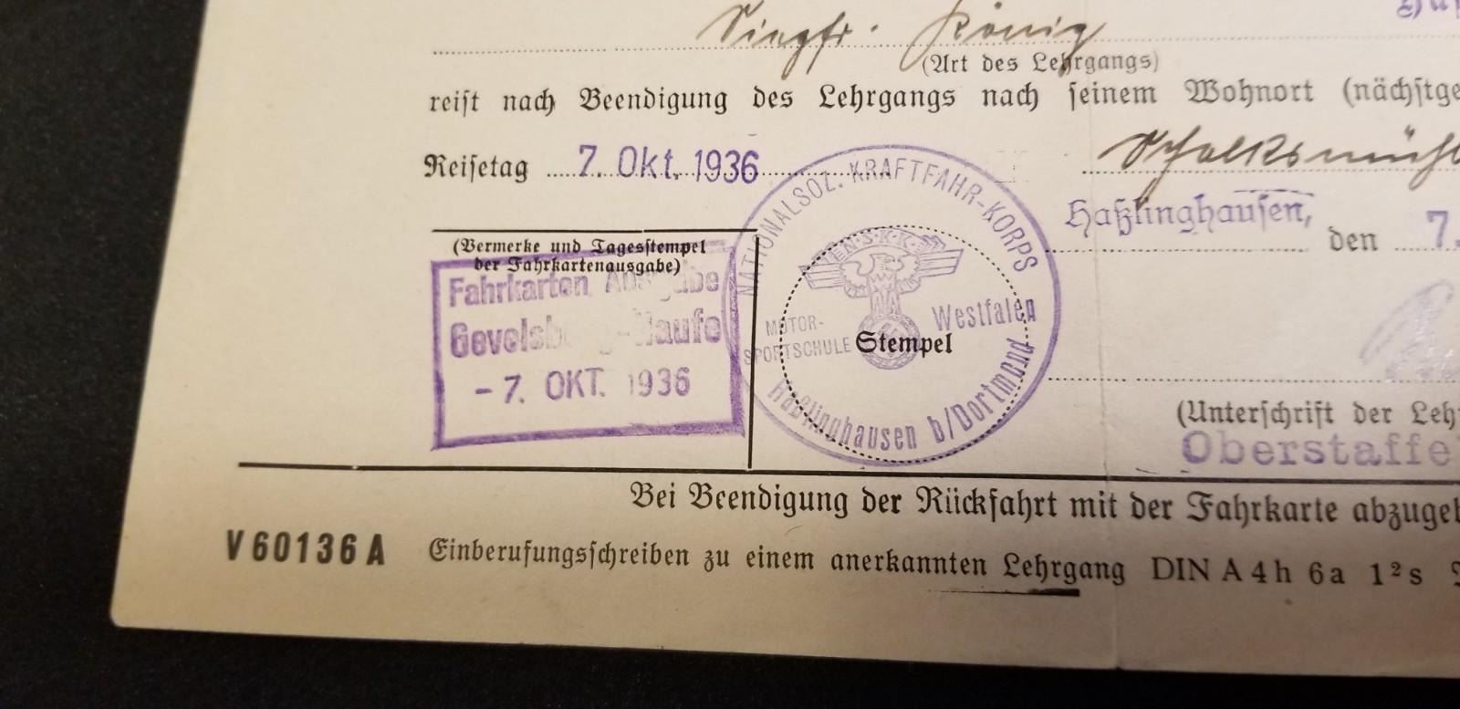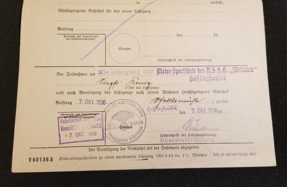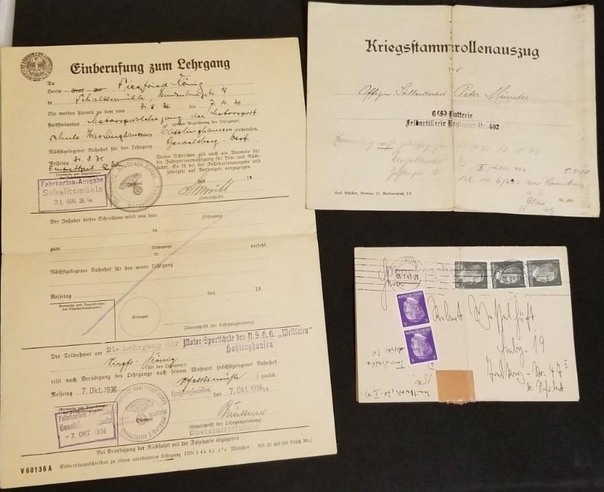 WW1 WW2 Paper documents stamps Third reich NSKK Imperial German paper lot. Nice paper lot of WW1 & WW2 German documents. Includes WW1 German Batterie Feldartillerie regiment # 402. and the NSKK motor sports school document along with the stamped envelope. VG condition lot as shown. Be sure and check out our other militaria and collectibles auctions for more military related items, we always combine shipping!
