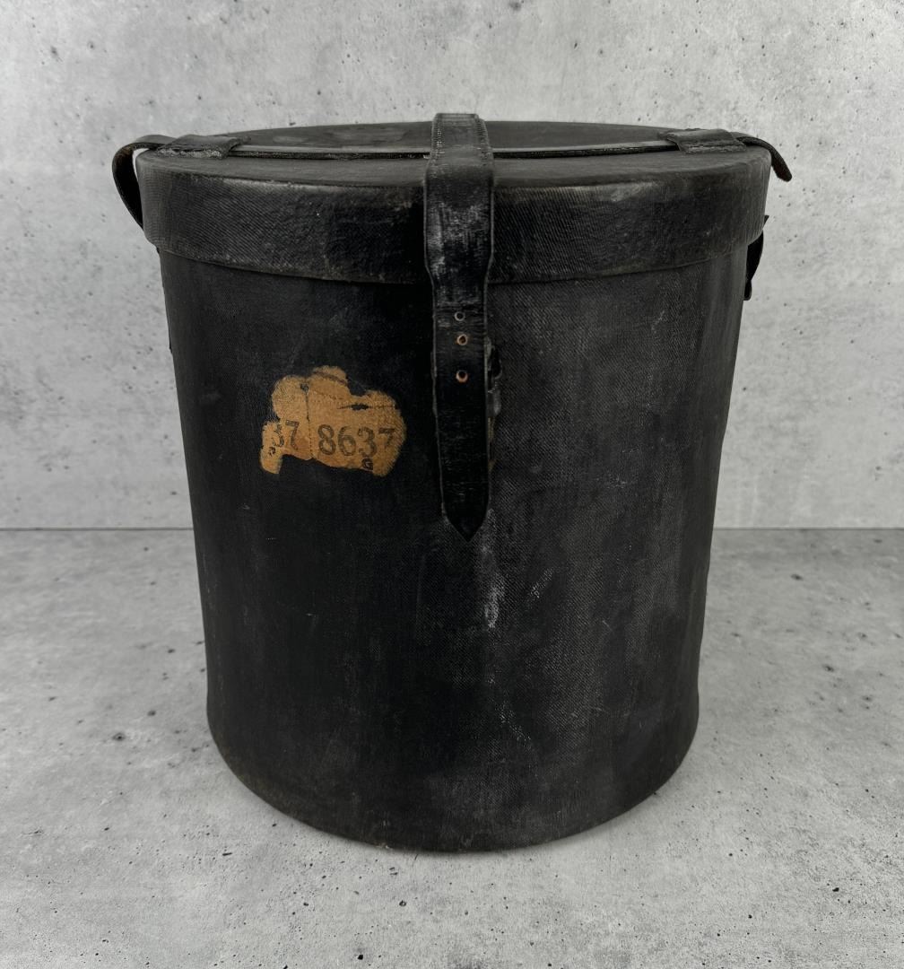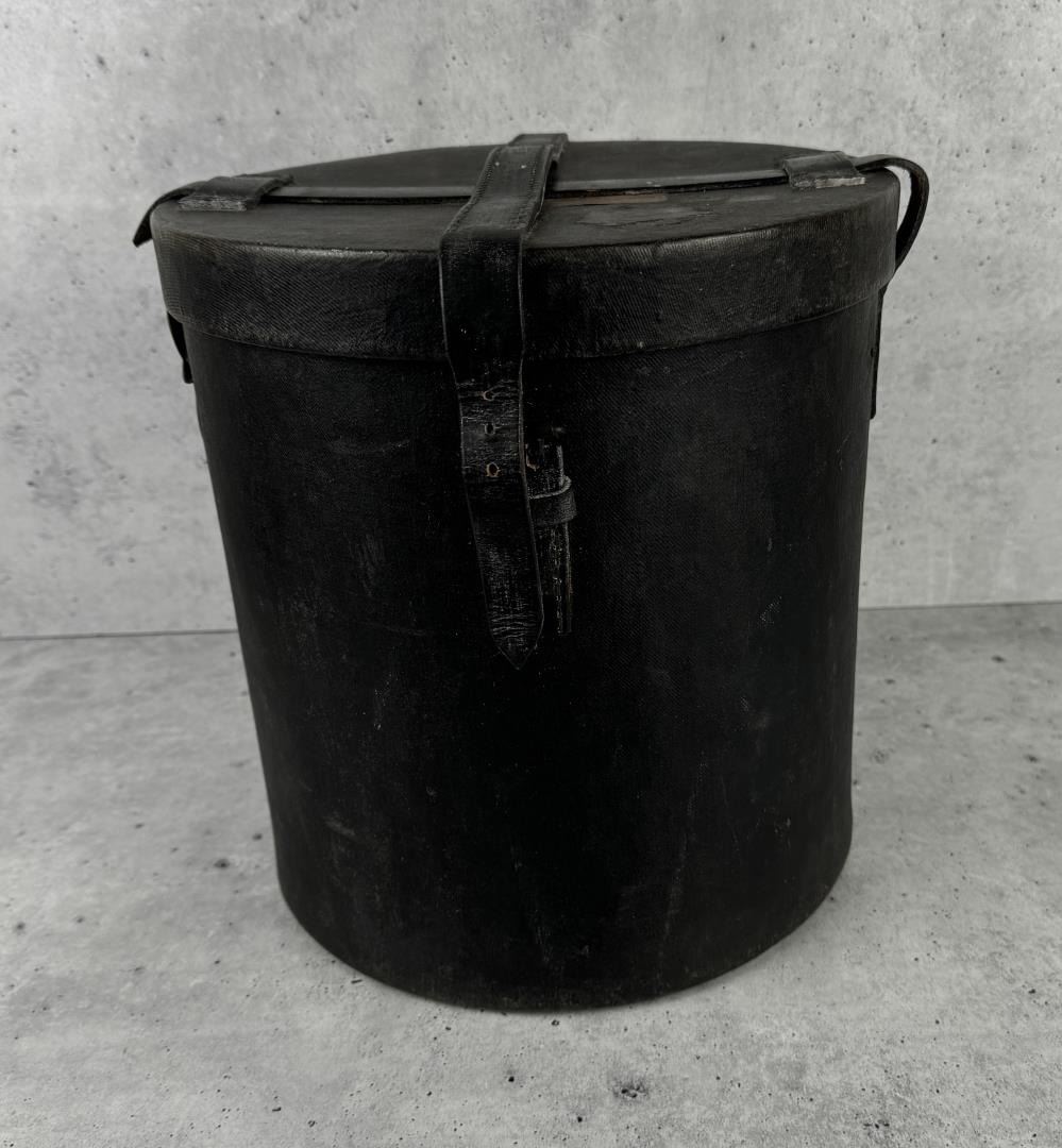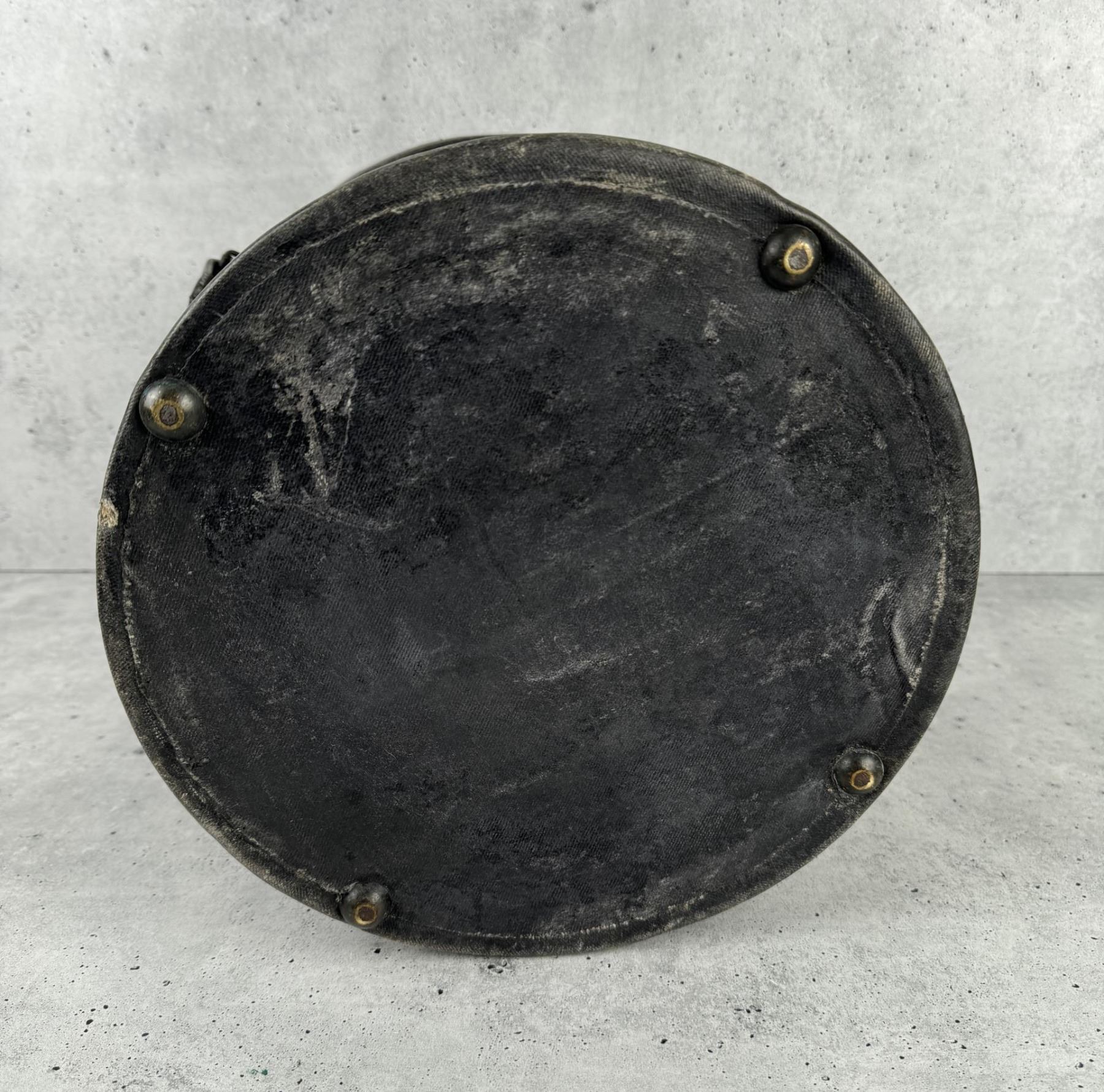 12 3/4" tall by 11 3/4" in diameter. One strap is broken.