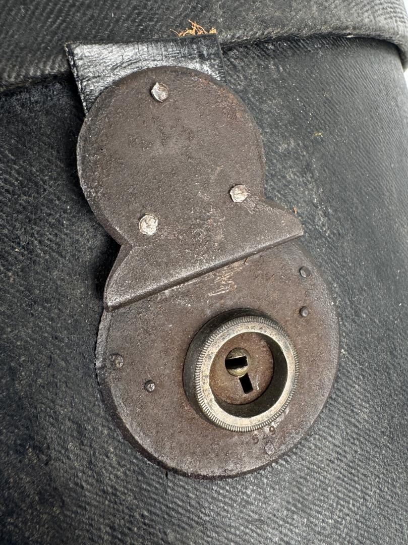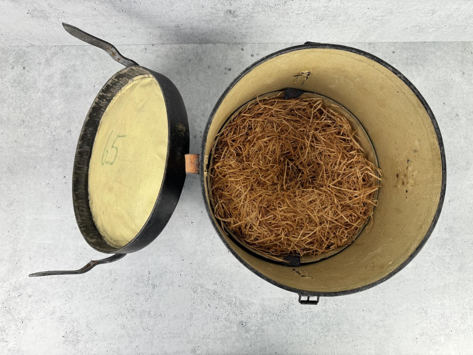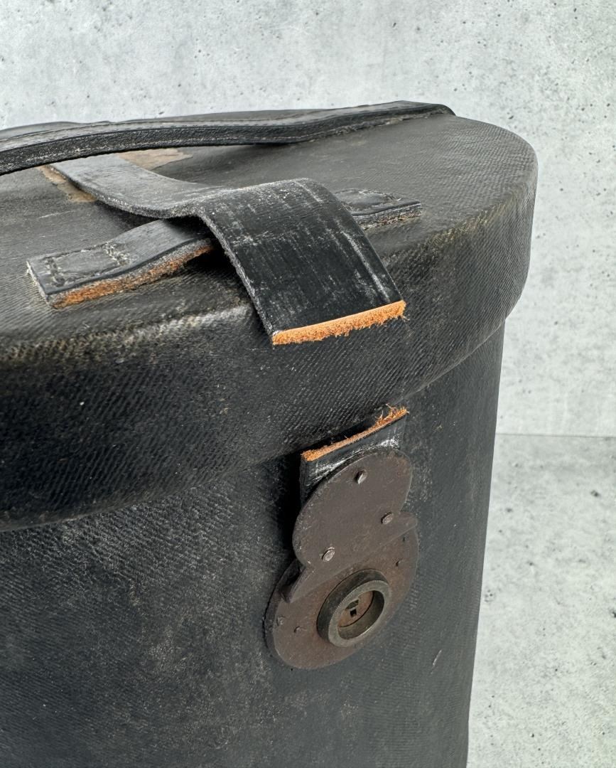 12 3/4" tall by 11 3/4" in diameter. One strap is broken.