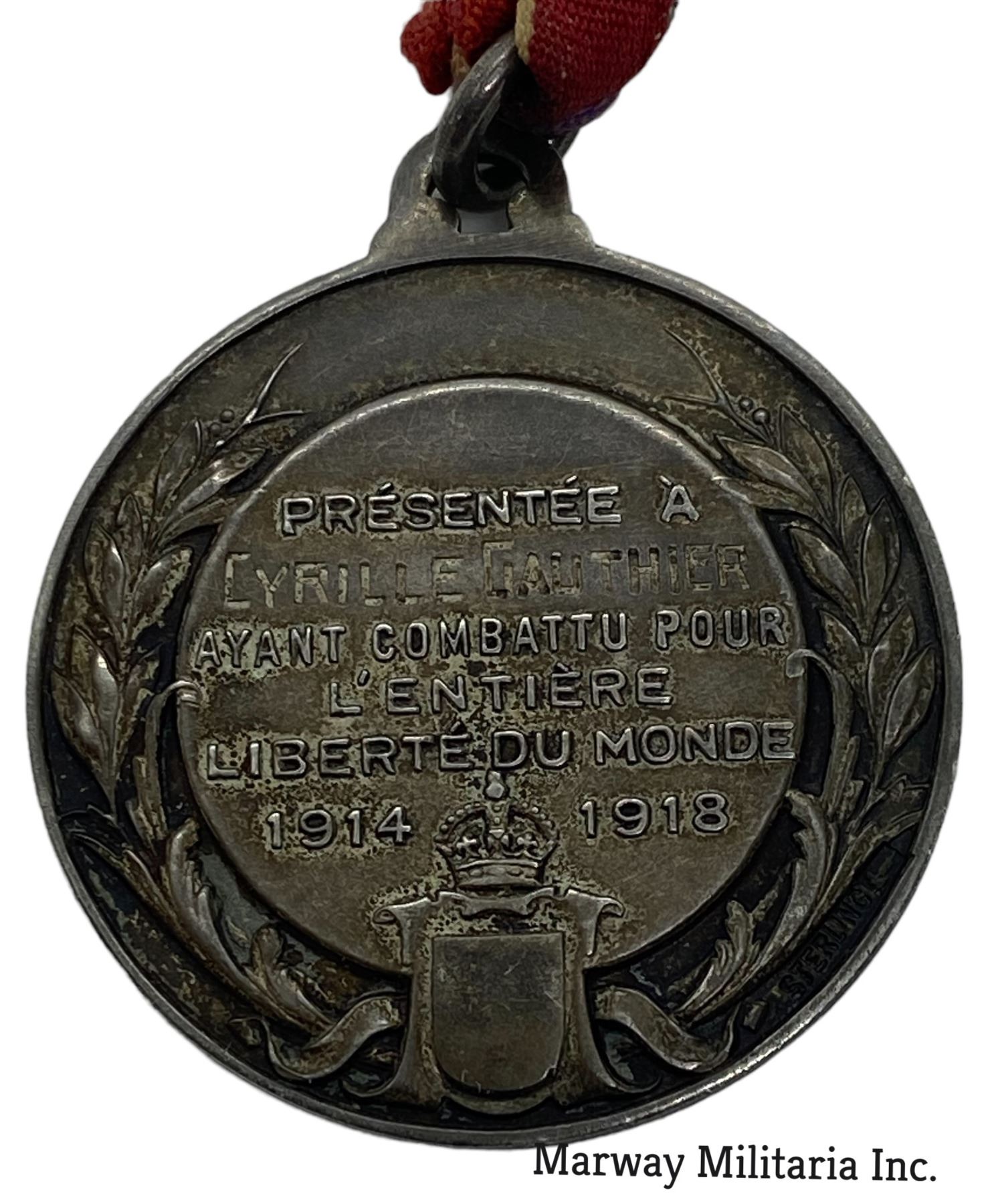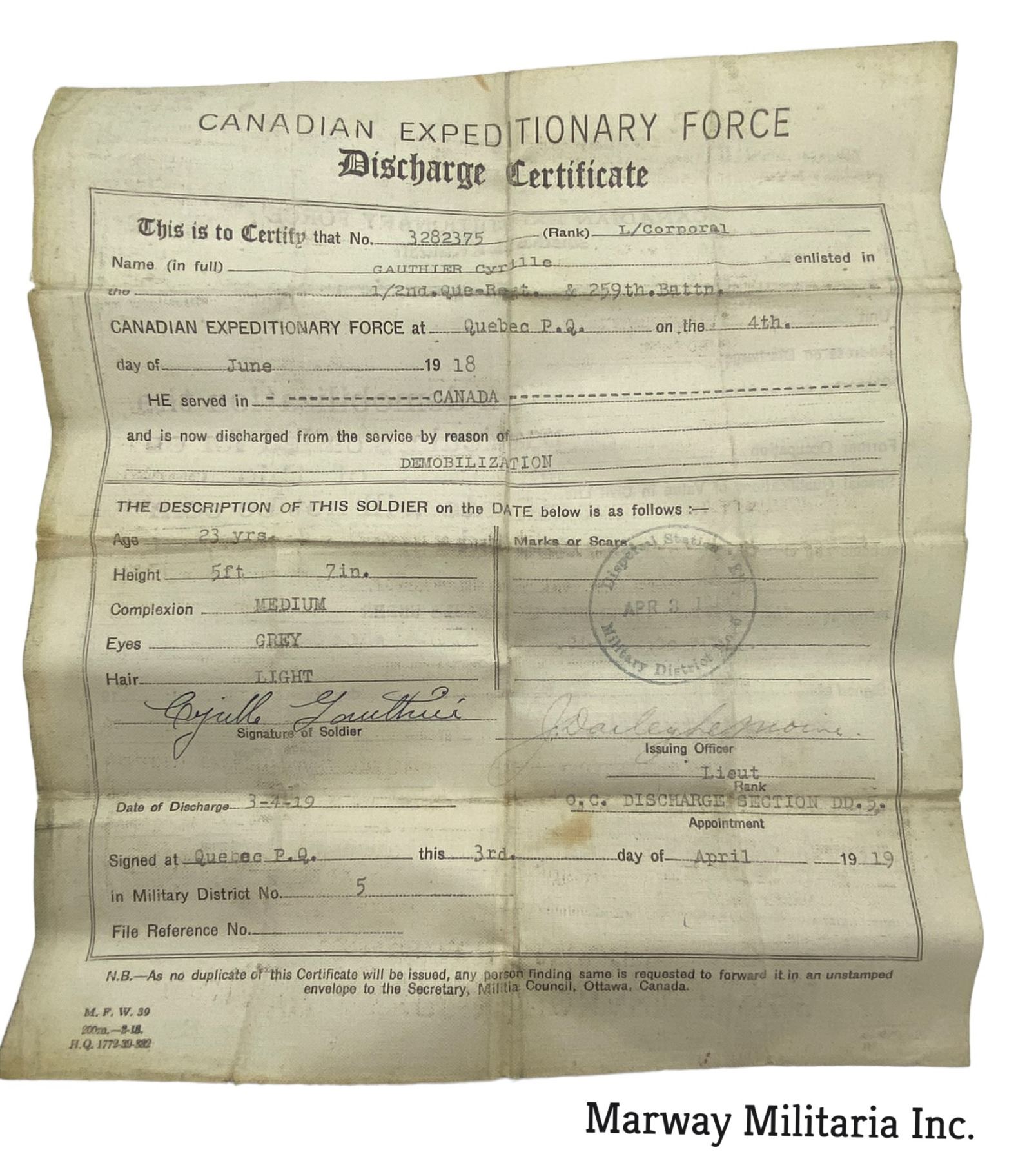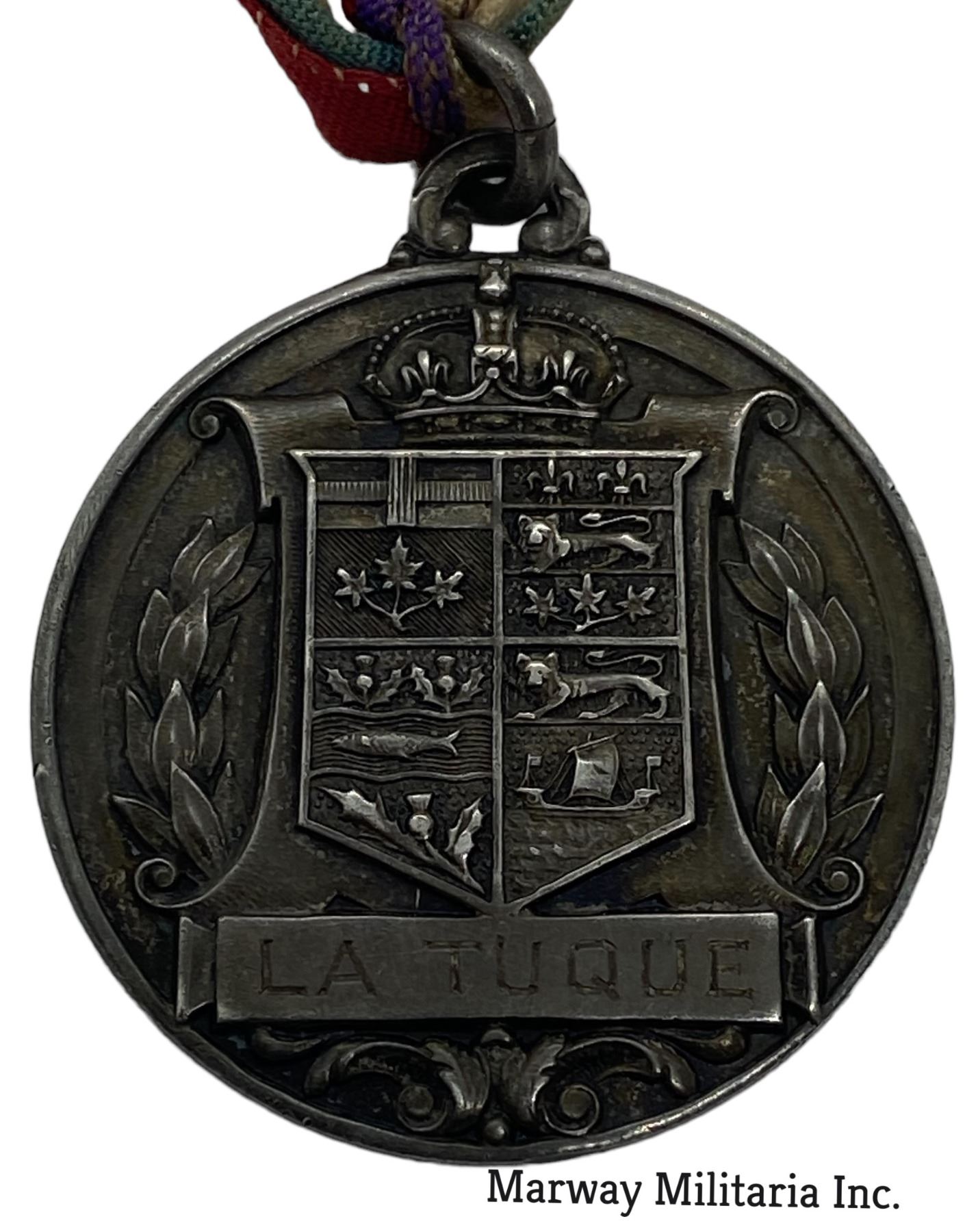 Lot of 2. Engraved on front engraved LA TUQUE, on back CYRILLE GAUTHIER. Suspended from ribbon. Included his lined discharge paper.