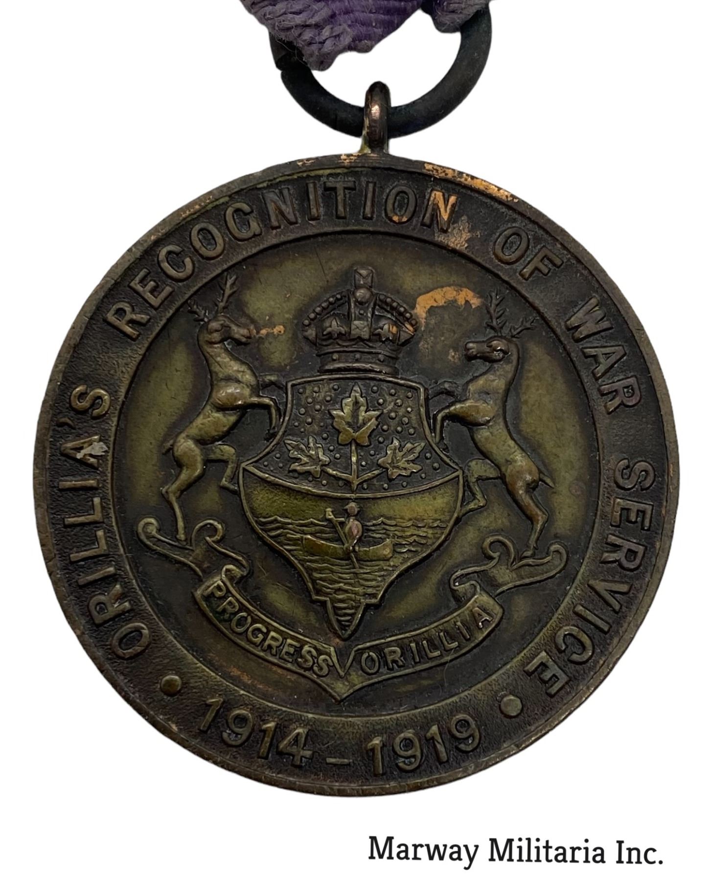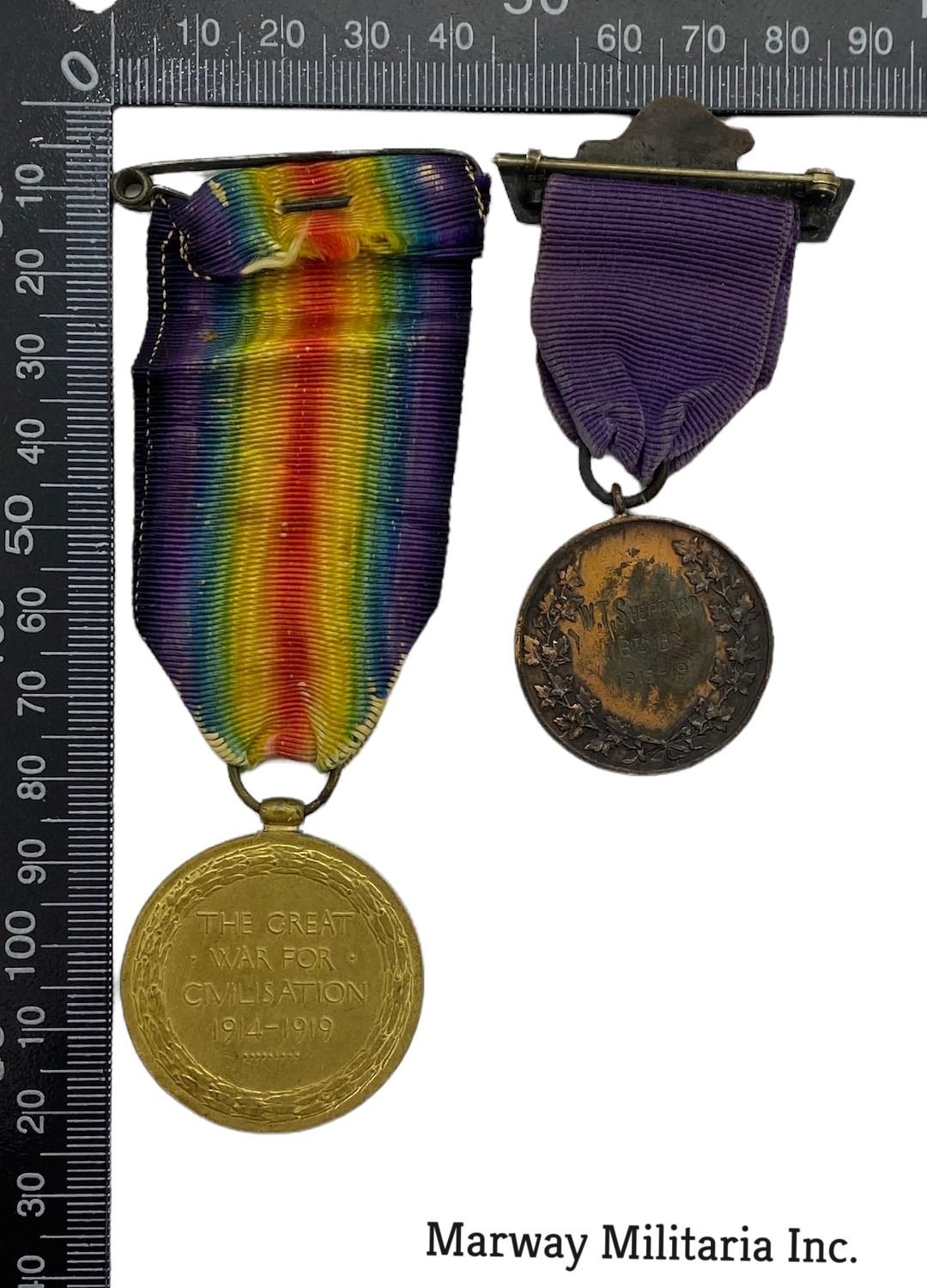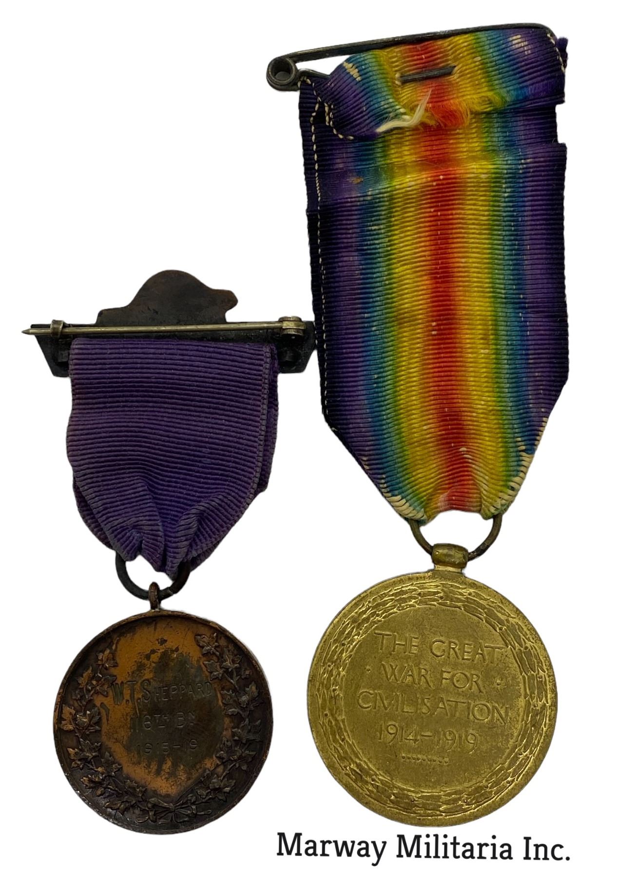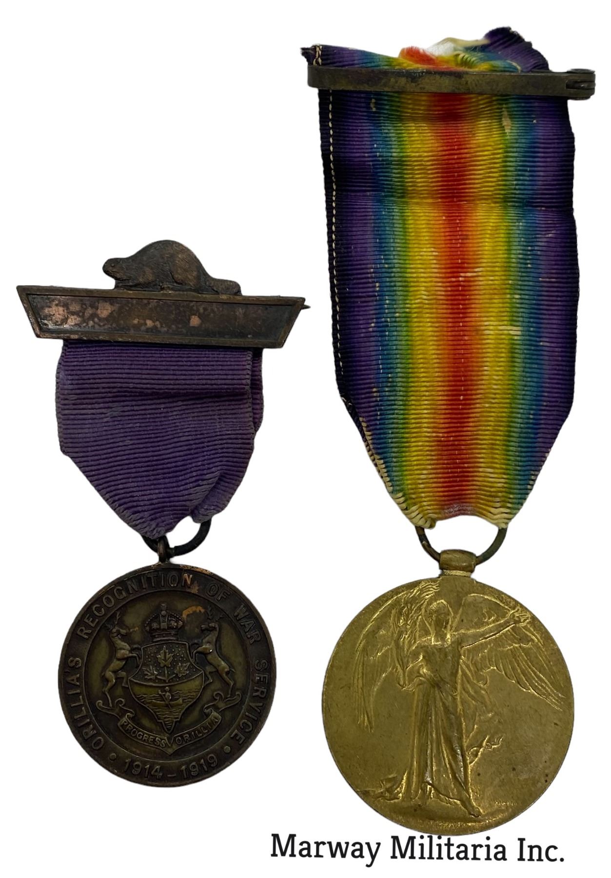 Lot of 2. Welcome home medal from Orillia Ontario engraved on back WT SHEPPARD 116TH BN 1915-19. Enlisted with the 157th. Victory Medal impressed 644103 PTE W T SHEPPARD CFC