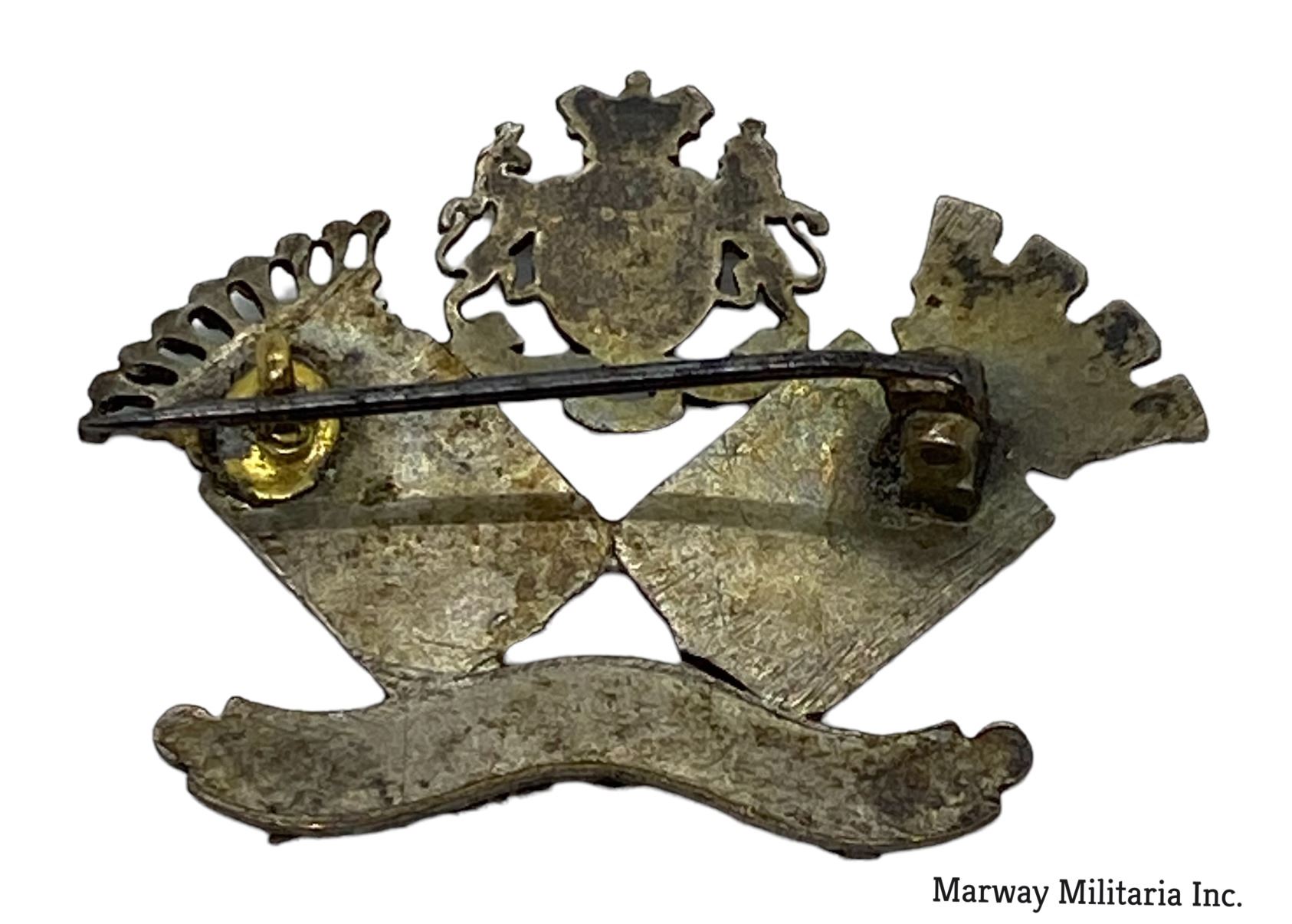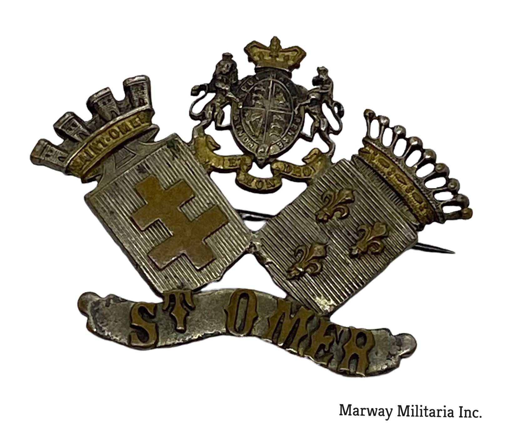 Silver and gold highlights. I believe the lettering are in gold. Pin Back.