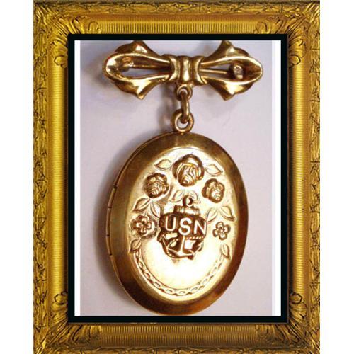 When the war was on, mothers and sweethearts carried these lockets close to their heart, with their loved ones photo inside. A tradition that probably is continuing which makes this locket even more special. To think that this carries the love of someone who fought for our country so many years ago, and to have it continue with a new generation makes this carry karma that so very important . This is one of the larger US Navy lockets that I have seen from that WW11 era ( 1 ¾" long from pin to bottom of locket) and it has the geometric striped etched back from the deco period. This is in such great shape too!! I certainly hope that who ever this goes to, that they are able to carry of a loved one that will grow old with them and know how important they were to them.