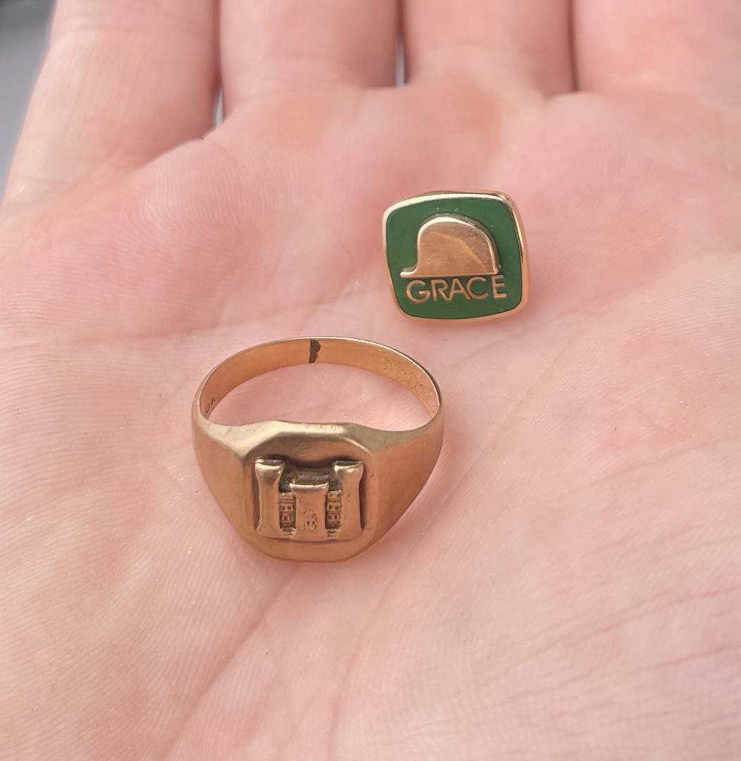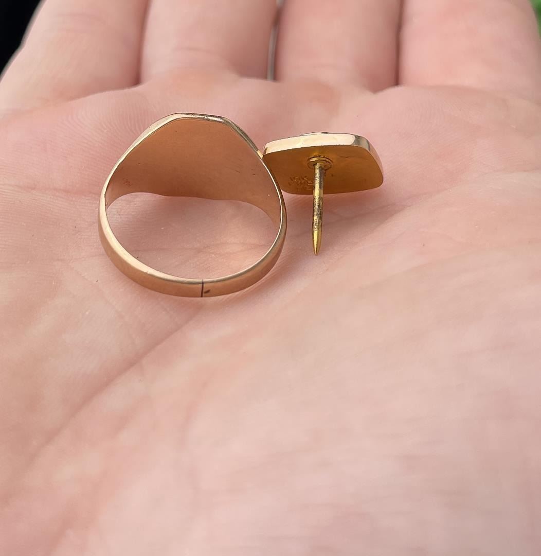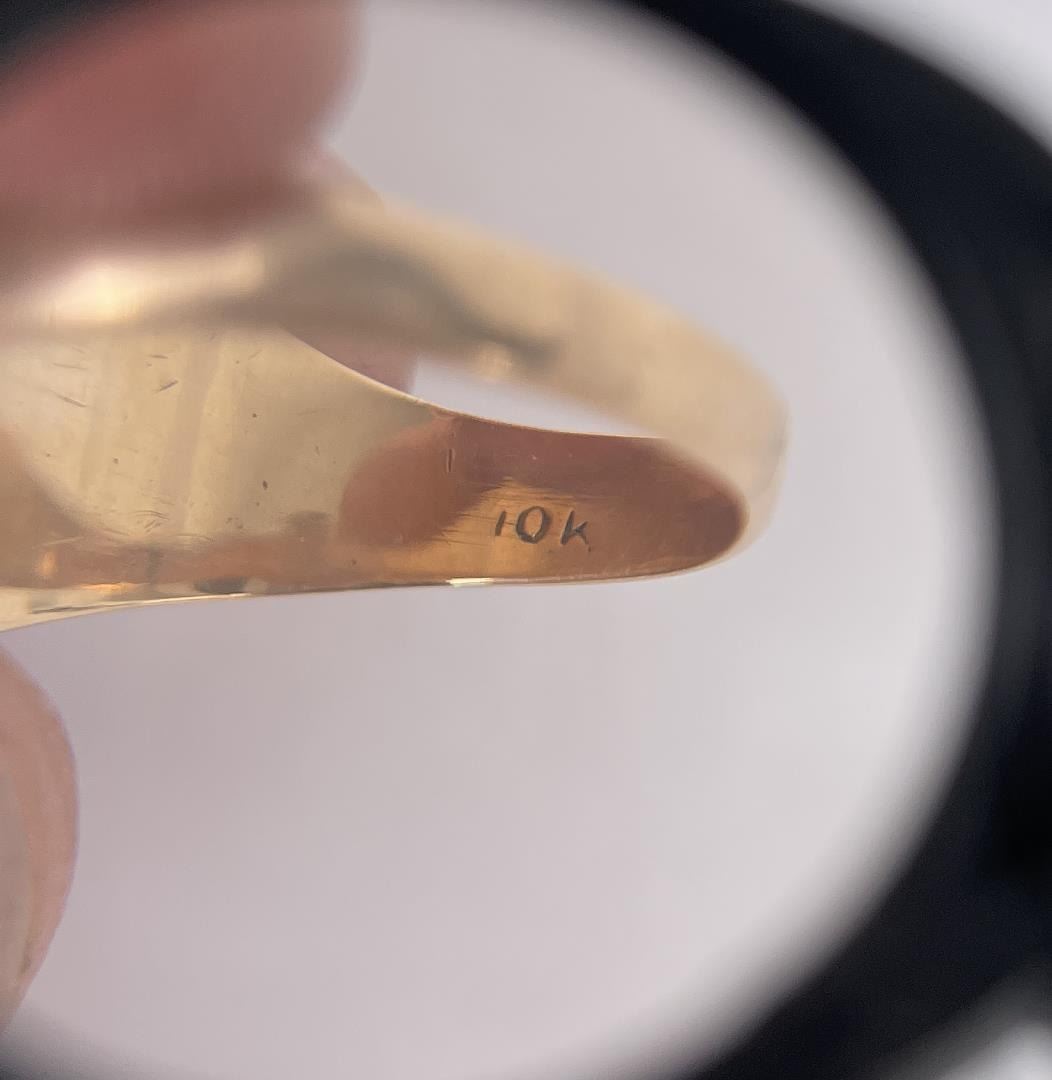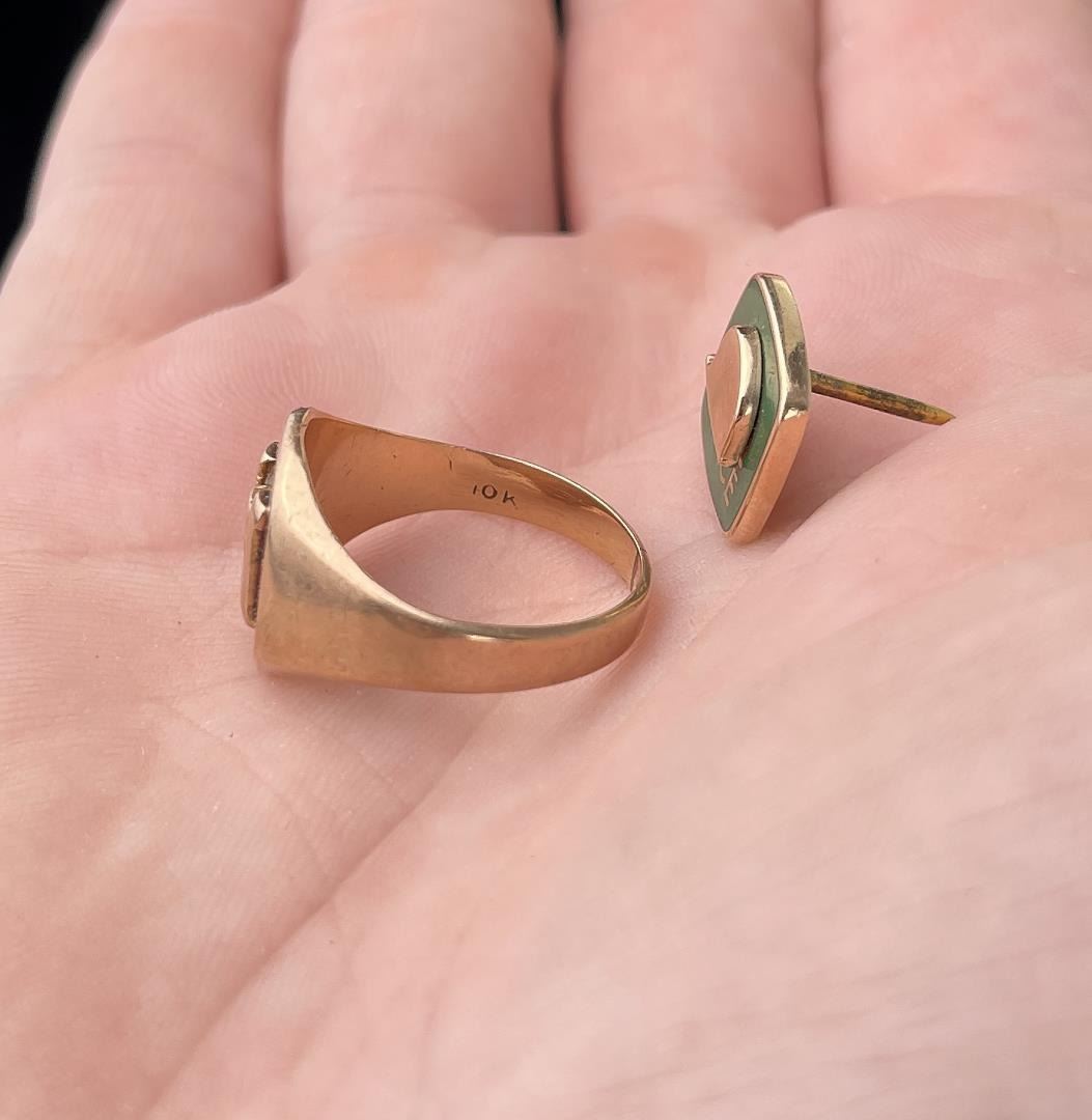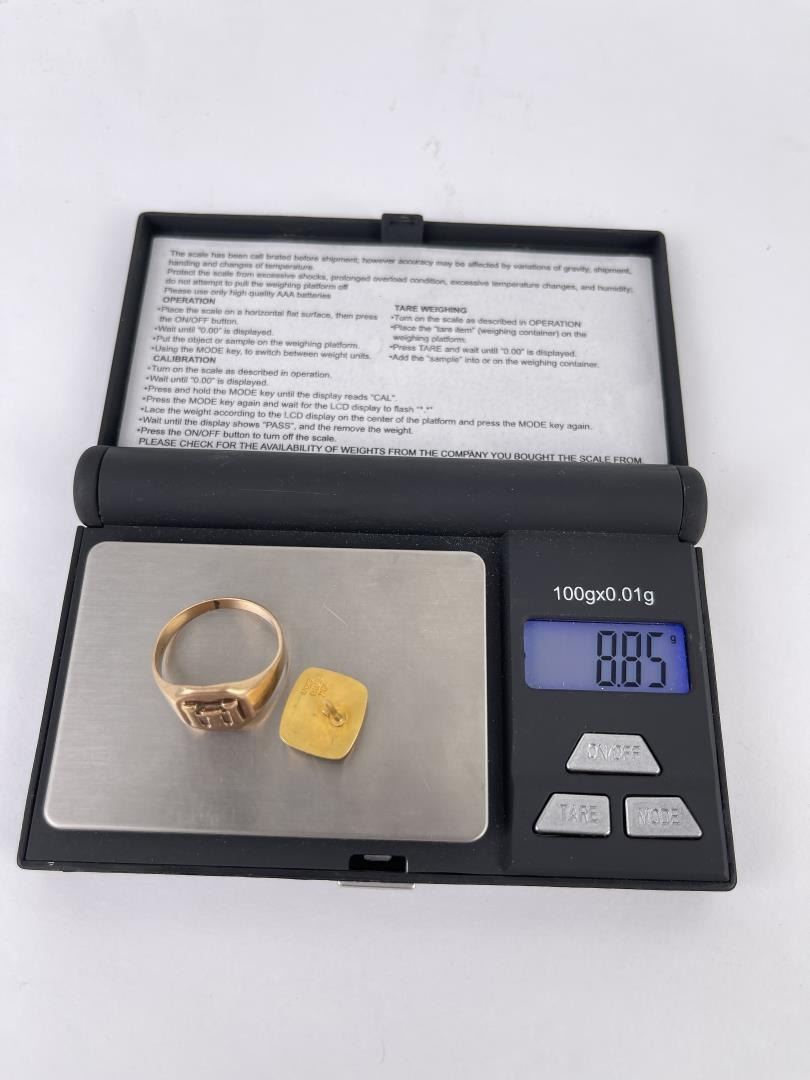 Ring size 8.25. Both are 10k Gold. Total weight is 8.85 grams.