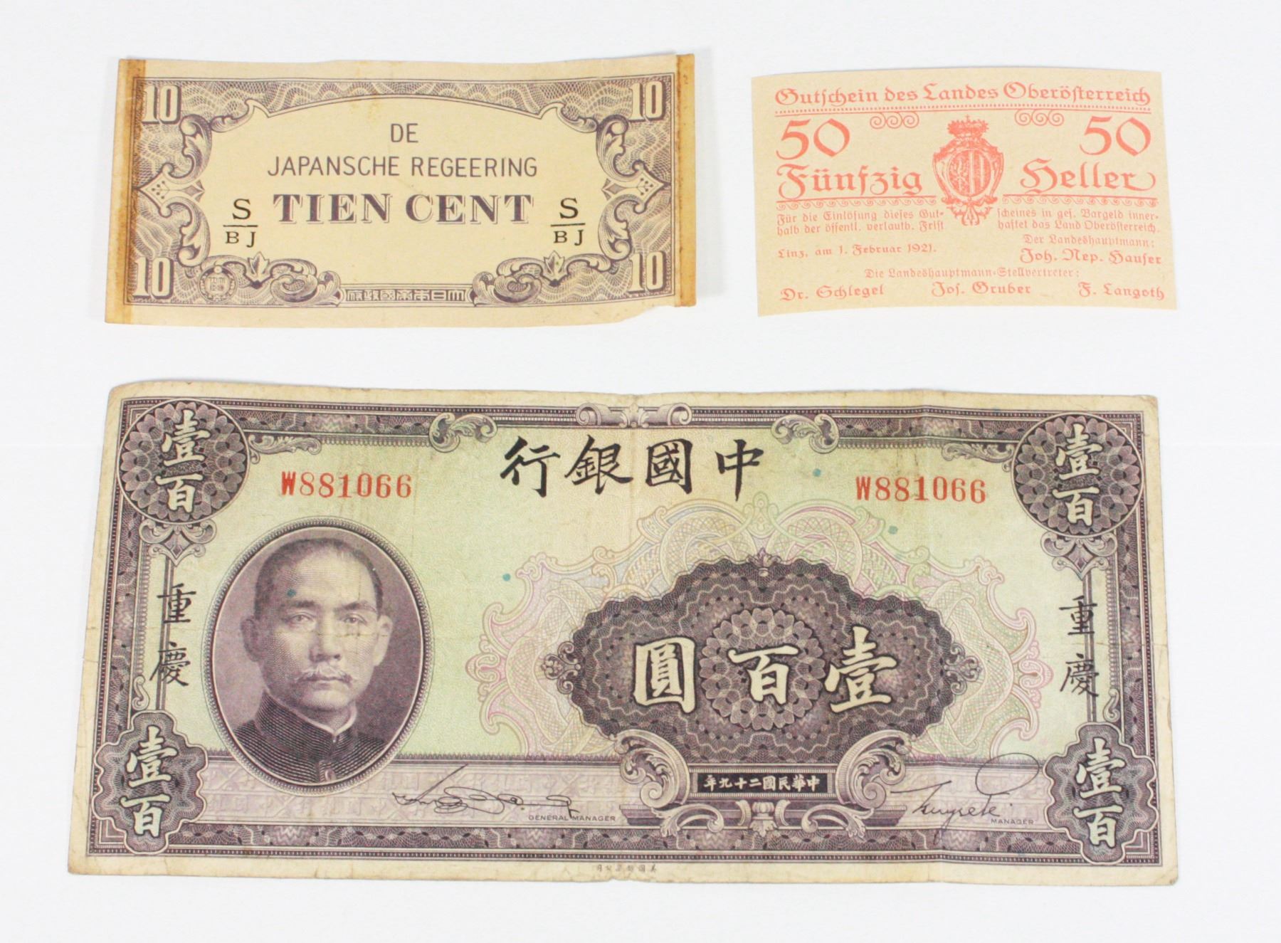 WW2 JAPAN OCCUPATION DUTCH EAST INDIES NOTE, AND 1921 AUSTRIA 50 HELLER PAPER MONEY NOTE