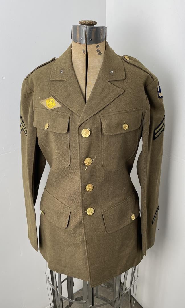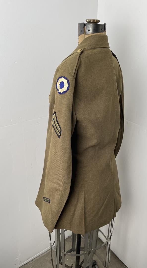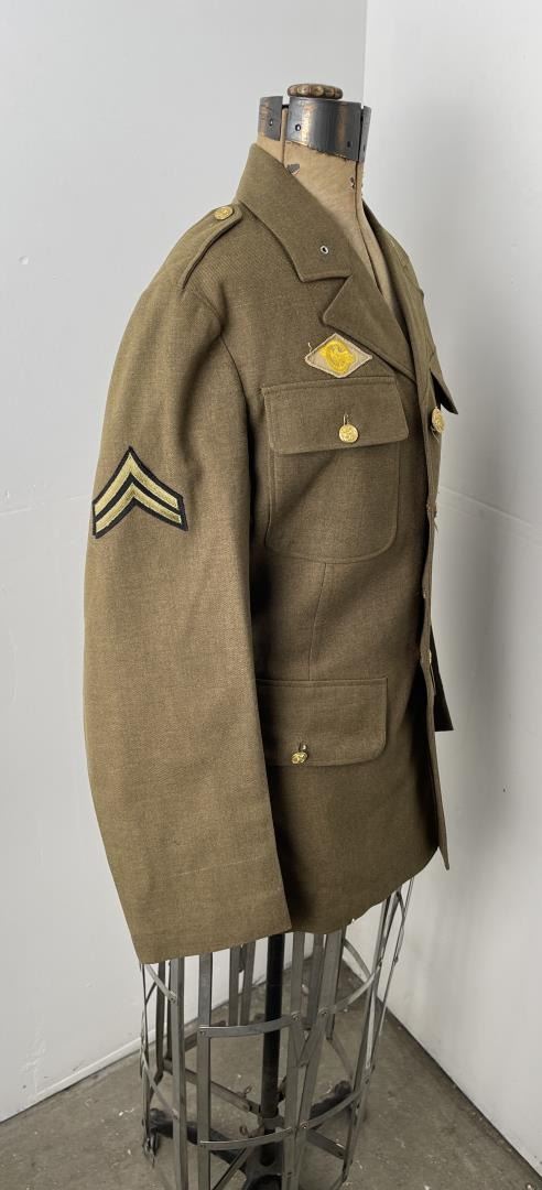 Corporals 4 pocket uniform coat with service stripes and shoulder patch.