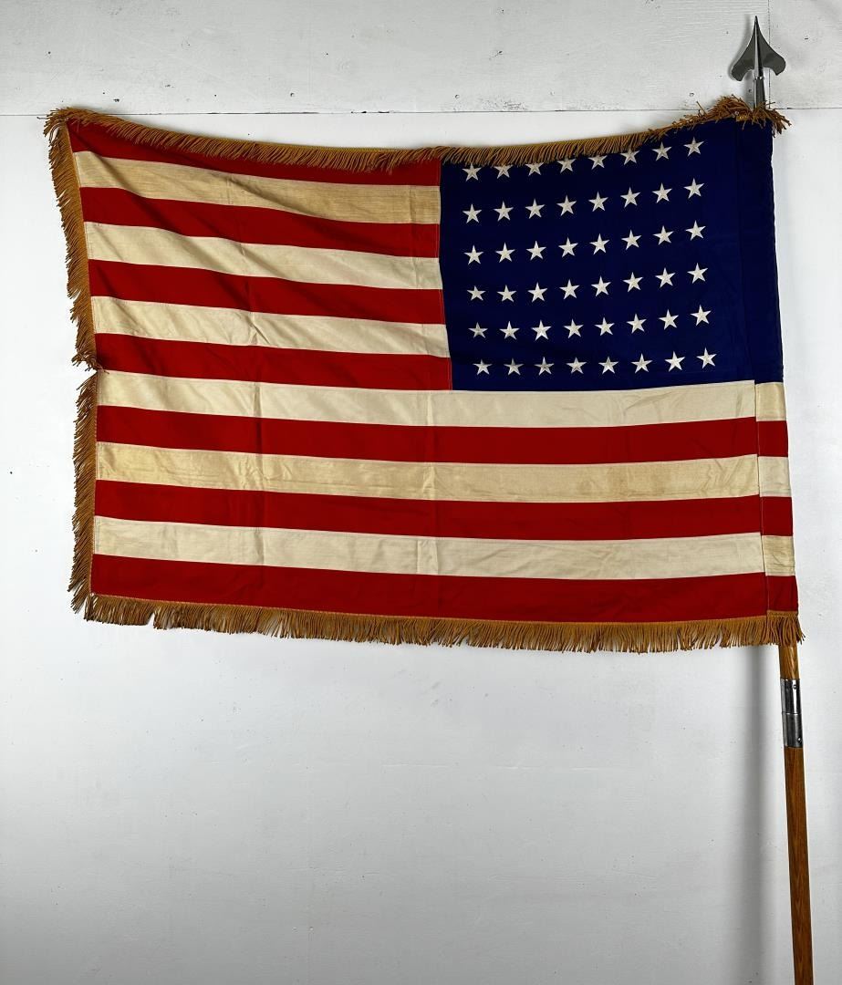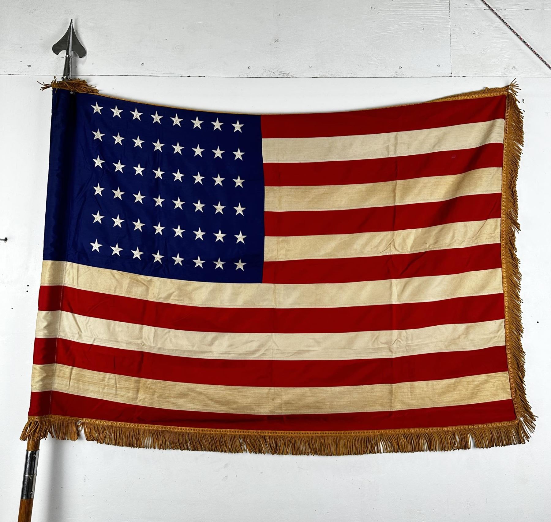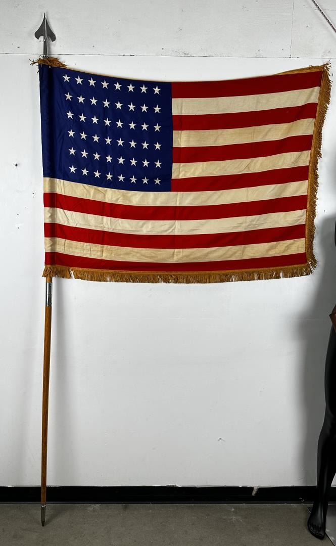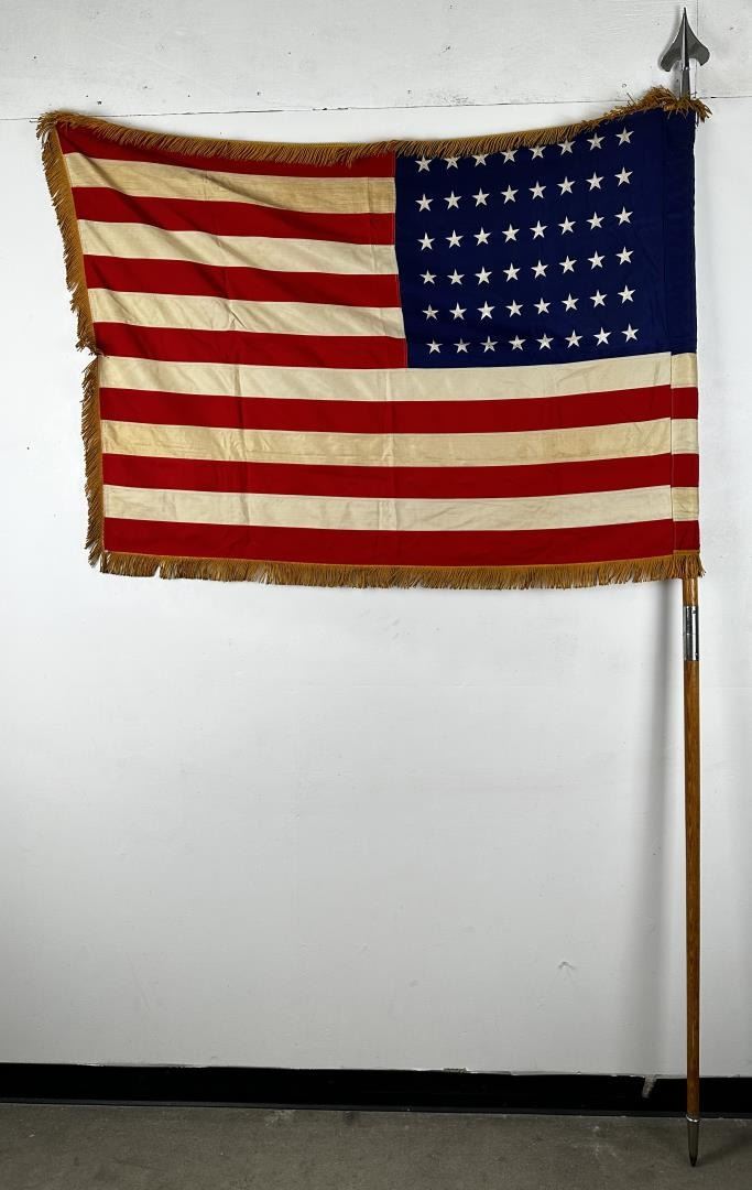 Comes with pole, and shoulder carrier. Bands around the flag pole state Korean War Summer Fall 1952, Korean War CCF , Korean Service Third Korean Winter, Korean Service Korea Summer Fall 1953, World War II AP Theatre Luzon, World War II AP Aleutian Islands. 38" by 51".