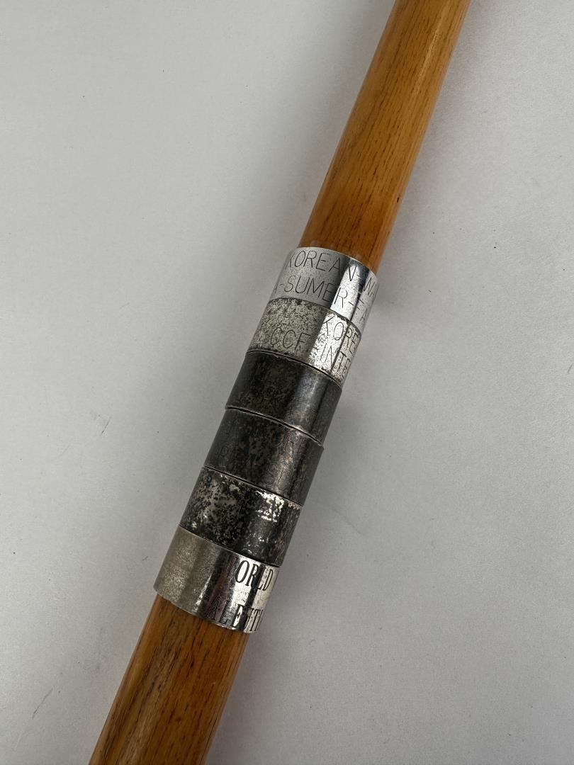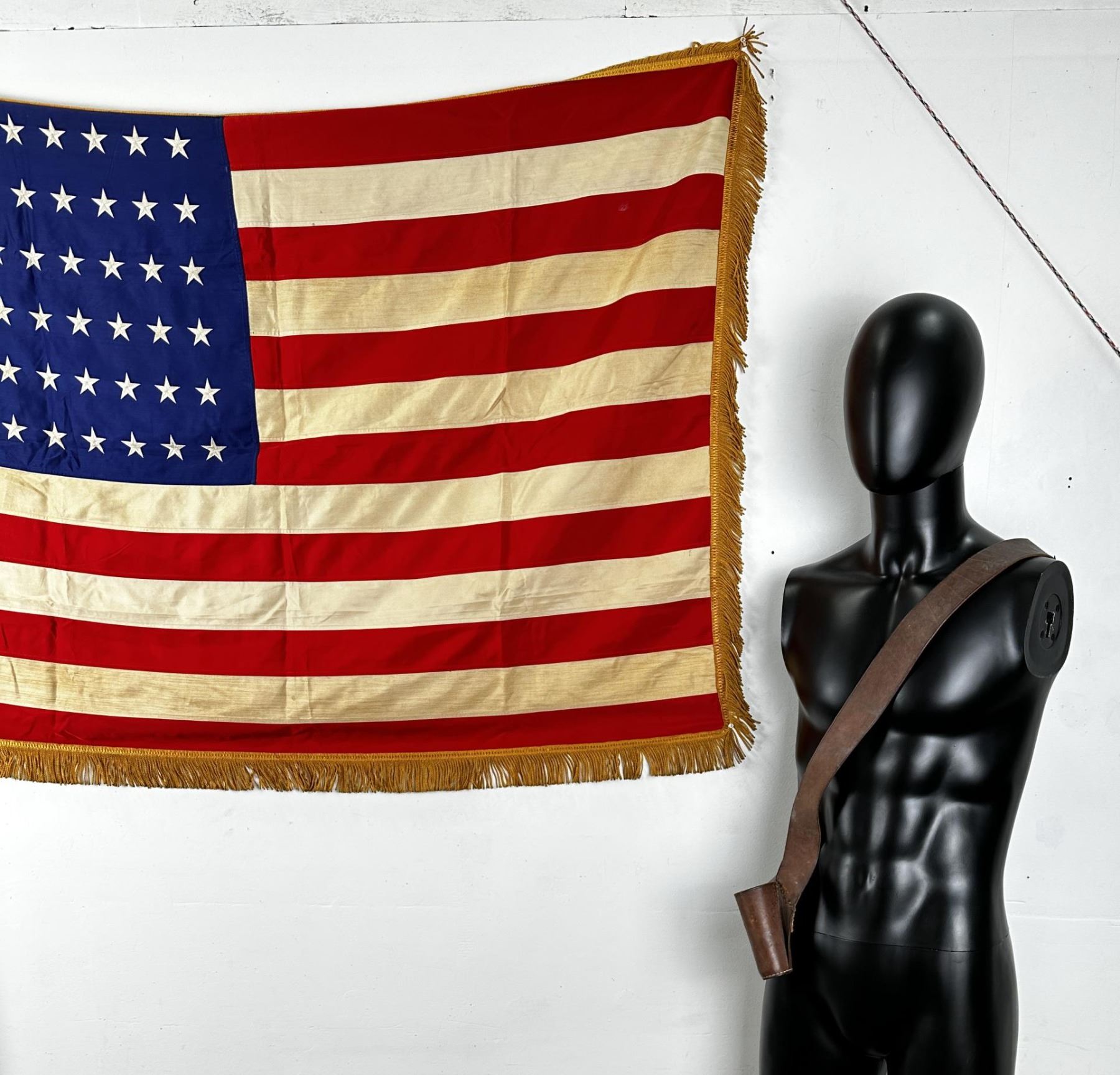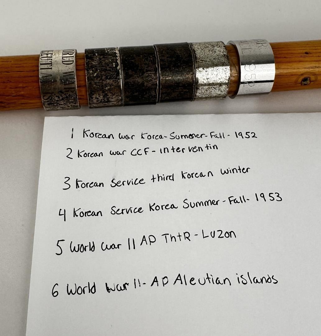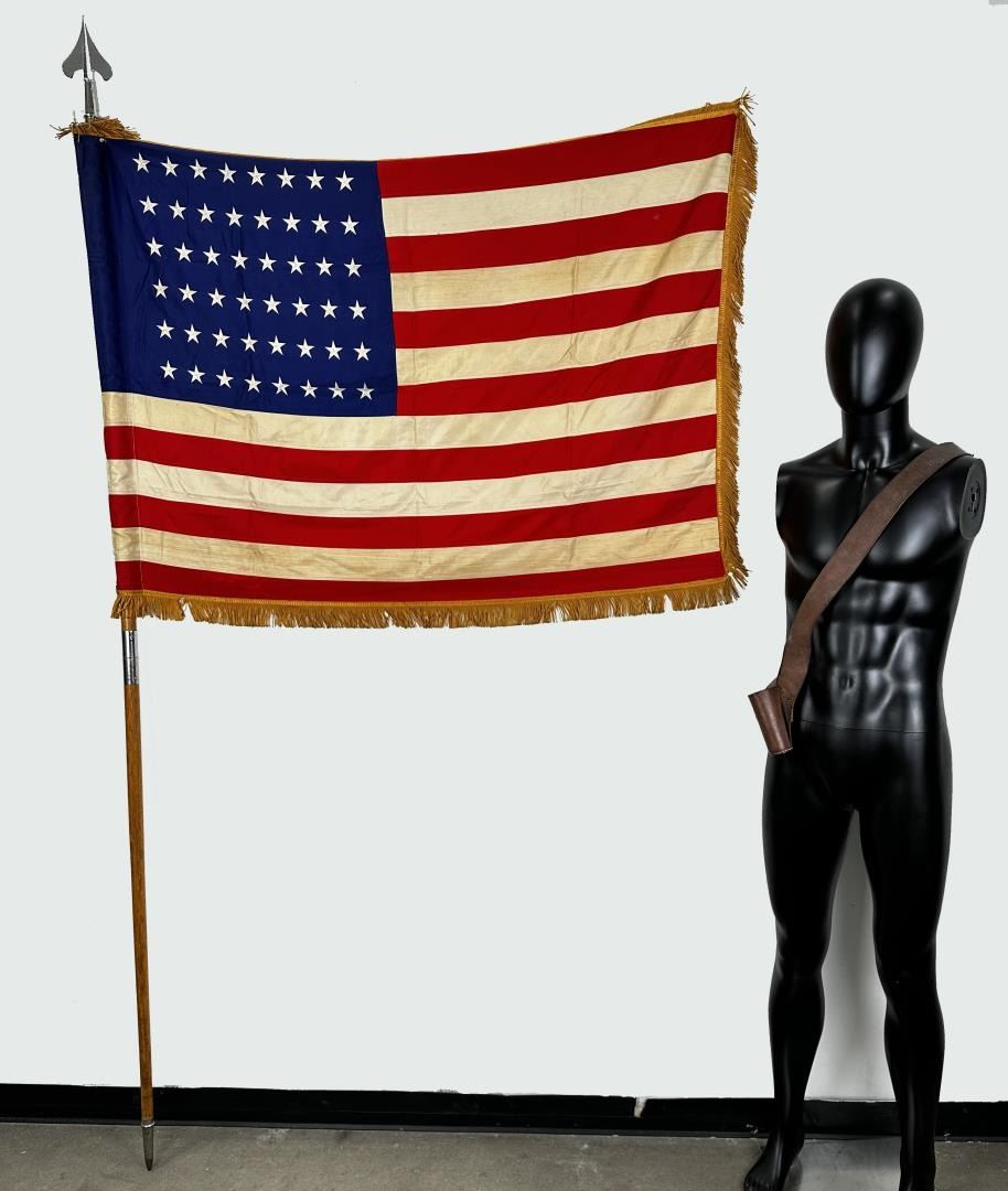 Comes with pole, and shoulder carrier. Bands around the flag pole state Korean War Summer Fall 1952, Korean War CCF , Korean Service Third Korean Winter, Korean Service Korea Summer Fall 1953, World War II AP Theatre Luzon, World War II AP Aleutian Islands. 38" by 51".
