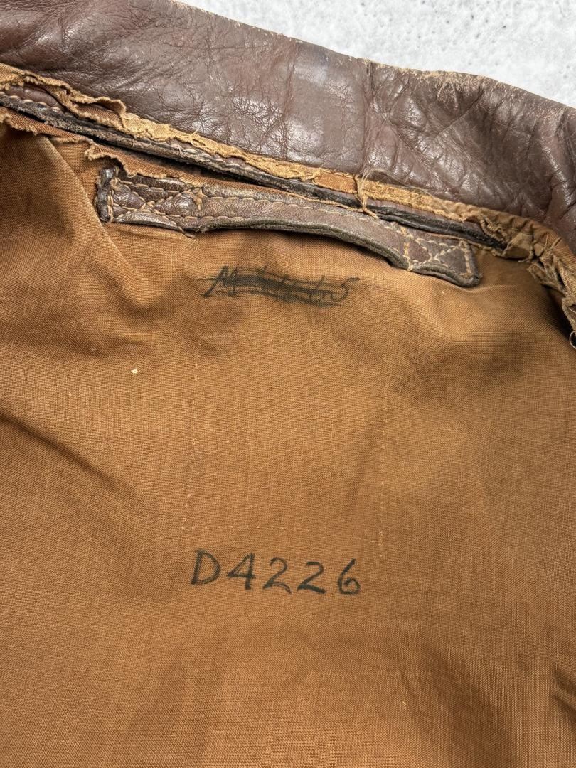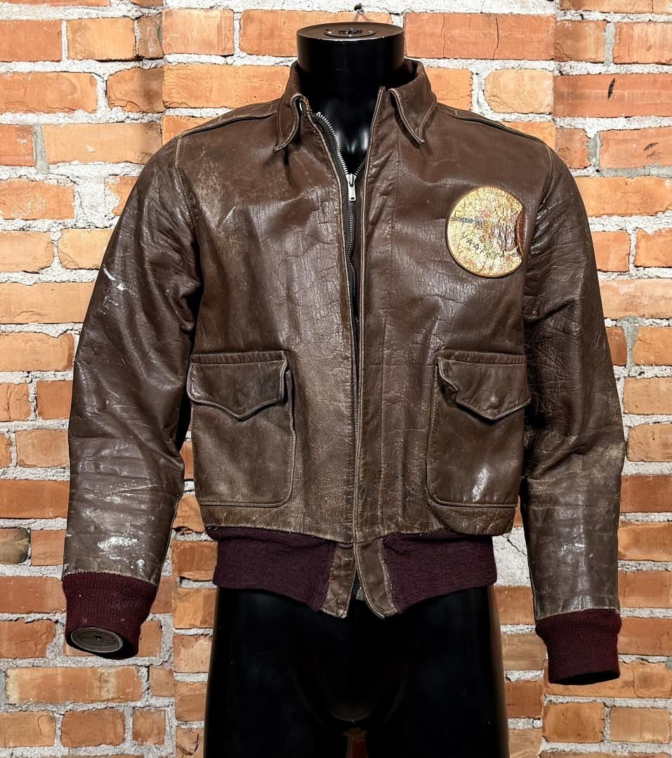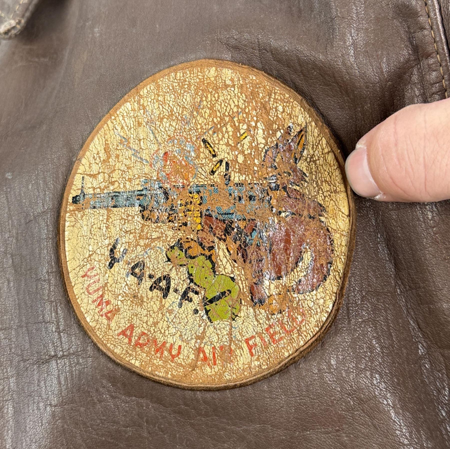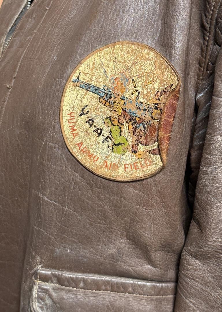 Yuma Army Air Field patch. 22" across the chest by 20" long by 17" shoulder to shoulder. Jacket marked D4226 under the collar. Affixed to the left breast is a painted patch for the Yuma Army Air Field with the iconic Disney pattern logo depicting a furious coyote wielding a machine gun above the war cry Y-A-A-F!, handily translated to YUMA ARMY AIR FIELD in red text along the border. Yuma's Airfield began as a simple dirt field back in the 1920s, but was offered to the United States Government for use during World War II. Graduating its first classes in 1943, the field served as an advanced training ground for a variety of aircraft including multi-engine B-17 pattern and single engine T-6 trainers. After the war, the field served as a Marine Station, Air Force Base, and even an International Airport