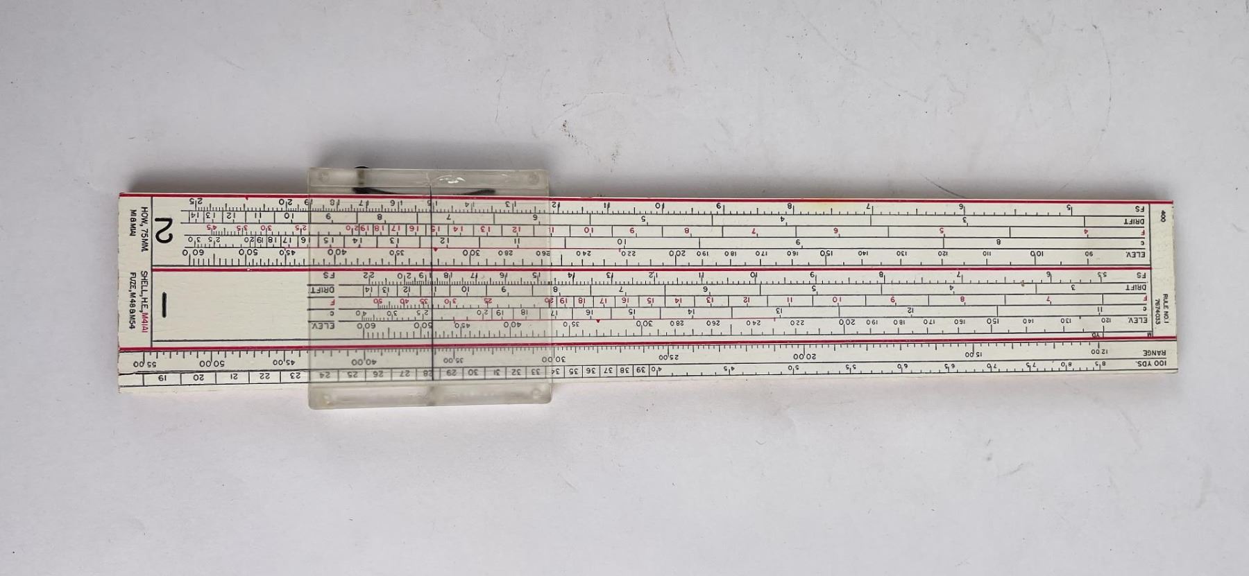 Unissued condition. The slide rule would have been used to make calculations to plot artillery fire for the Howitzer 105mm gun.