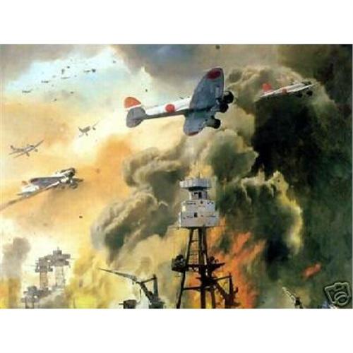 This is a beautiful aviation painting. It is of Japanese planes attacking Pearl Habour. The painting is a modern made piece. It is high quality museum quality oil painting on canvas. It measures 16x20" and comes unstretched and rolled. No artists signature. Buyer pays $16.50 priority airmail postage.