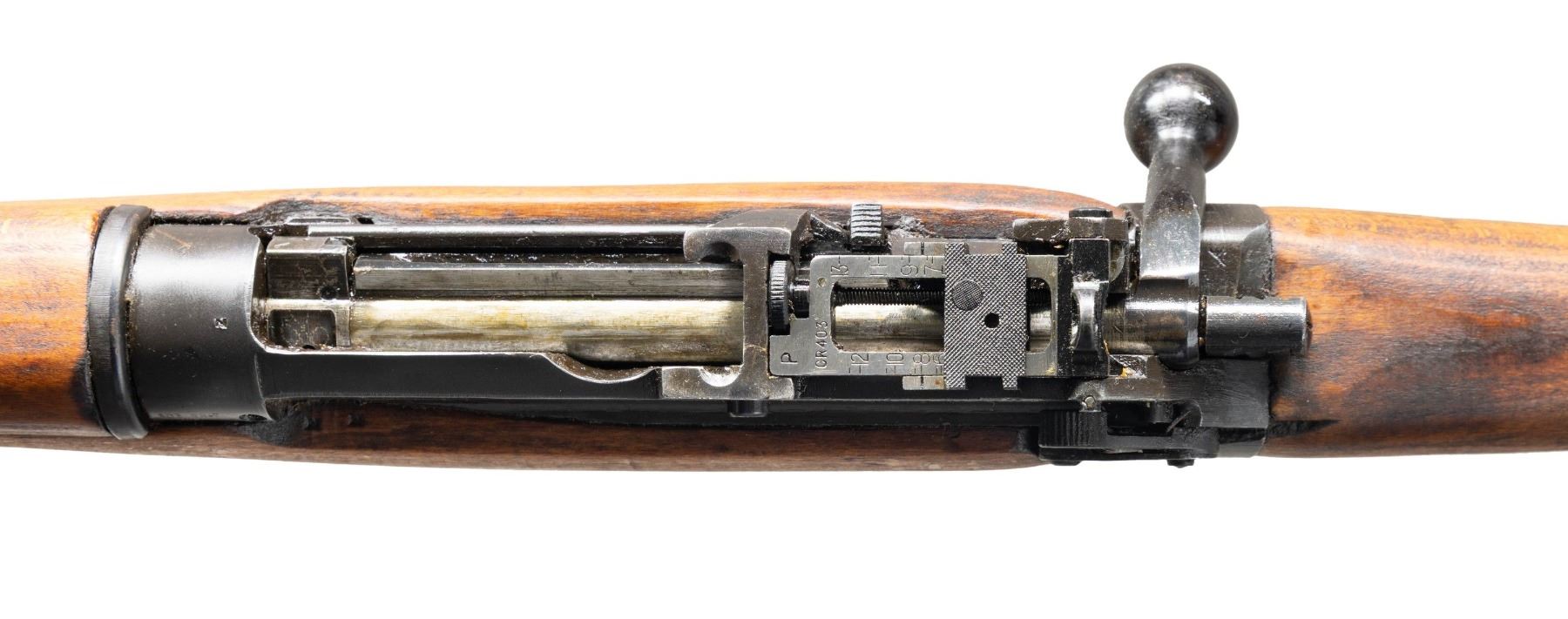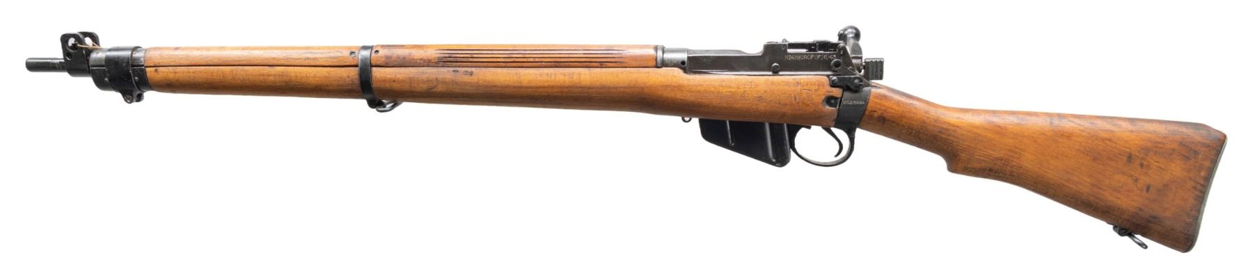 Cal. 303 Brit. S# DC21899A. Bbl. 25 1/5". Standard No. 4 sights with ladder aperture rear. Matching numbers on left side of socket, mag & bolt. Forend is mismatched. Left side of receiver has small import marking. Left side rail has No. 4 MKI markings with 6/43 date. Suncorite finish. Arsenal hang tag present on front sight. Beech stock set with bottom mounted sling swivels. MAGS: 1-10 rd. detachable matching numbered to socket. UNATTACHED ACCESSORIES: importer No. 4 manual. CONDITION: arsenal reworked stock set shows scattered black staining, handling marks & dings. Metal retains 92% arsenal suncorite finish with some cosmoline in action, edge wear, handling wear & flaking. Action functions properly when hand cycled. Bright near excellent bore. (25-2829/MJC). CURIO. $300-500.