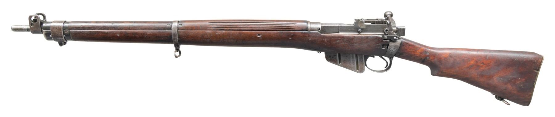 Cal. 303 Brit. S# 26C7635. Bbl. 25 1/5" with British sale proofs. Blade front sight with protective ears. Ladder aperture rear sight graduated to 1300yds. Matching numbers on left side of socket, bolt handle, forend & mag with numbers appearing arsenal force matched. Left side of receiver has "US PROPERTY" & "No4MKI*" markings. Left side of socket has Savage "S" marking & 1942 date. Walnut stock set with bottom mounted sling swivels. Underside of butt has painted "55" rack number. CONDITION: stock set shows scattered staining, handling marks & dings. Metal is mostly a silvery gray color with traces of arsenal blue, a few patches of pitting & scattered oxidation. Action functions properly when hand cycled. Very good plus bright bore. (25-2774/MJC). CURIO. $200-300.
