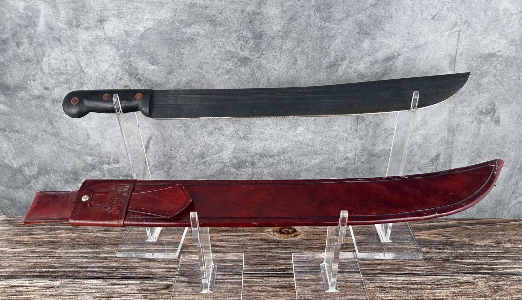 22 1/2" overall length. Includes leather sheath marked El Salvador.