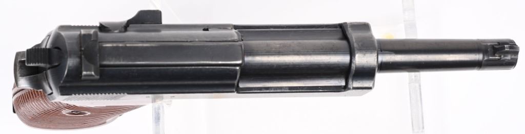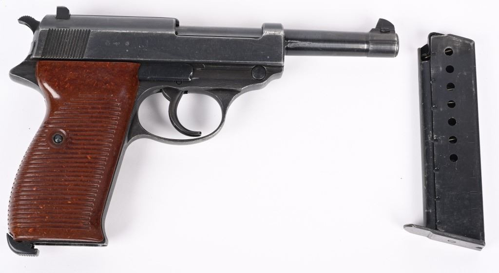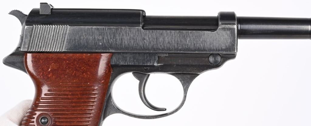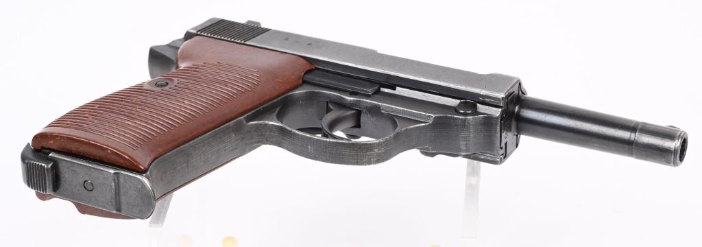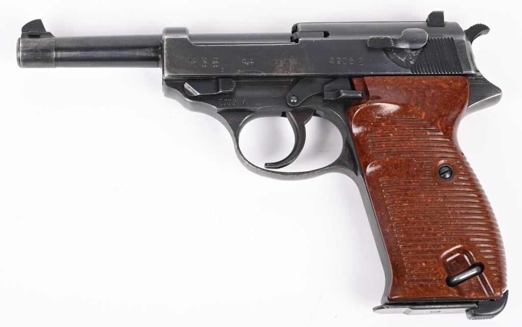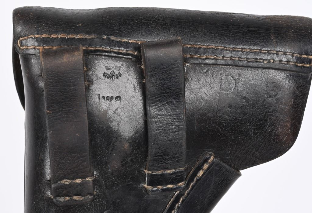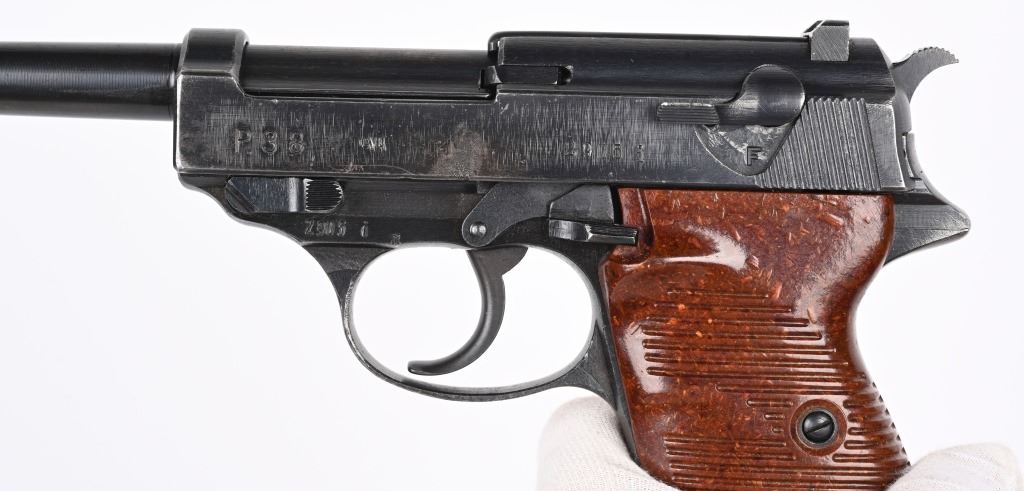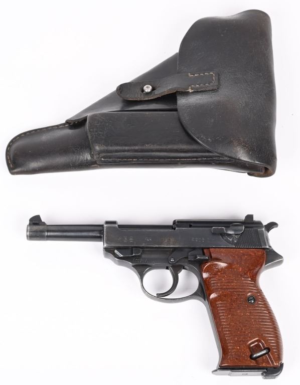 SERIAL NUMBER 2905i BARREL 4 7/8" CALIBER 9MM PARA MANUFACTURED 1943. Produced at Spreewerke under the German code "CYQ" and having German inspections Eagle 88 on frame slide barrel locking block and magazine. Blue finished with brown Bakelite grips. Pistol has all matching numbers and is housed in a soft black leather flap holster marked "P-38" and is inspected Eagle WaA 706" with manufacturers code "jla". CONDITION, Very good with excellent bright bore and pistol retains over 90% blue finish with thinning on grips straps and slight edge wear. Grips are excellent and action operates properly. Holster is very good with solid stitching and supple leather. NON-IMPORT C&R