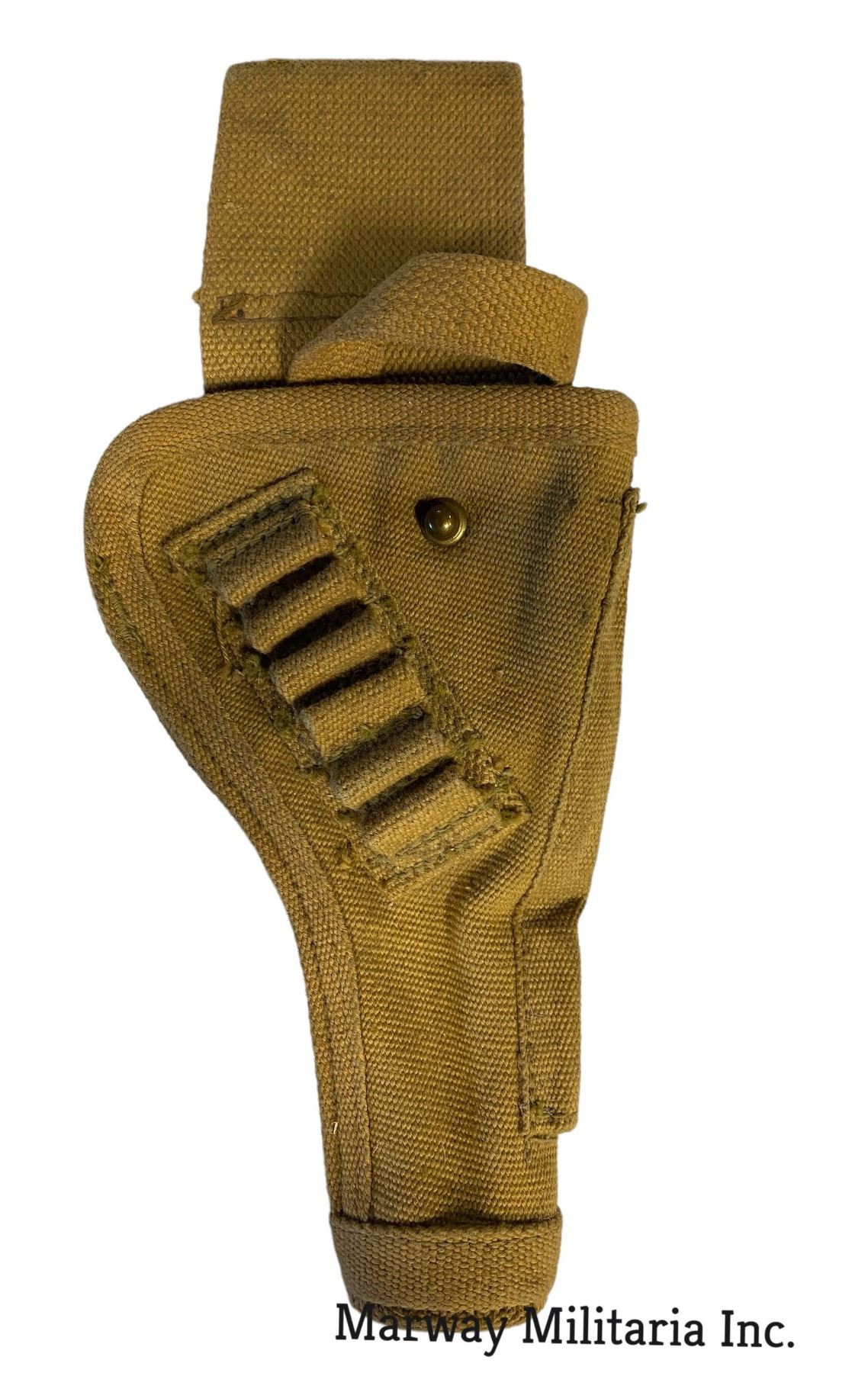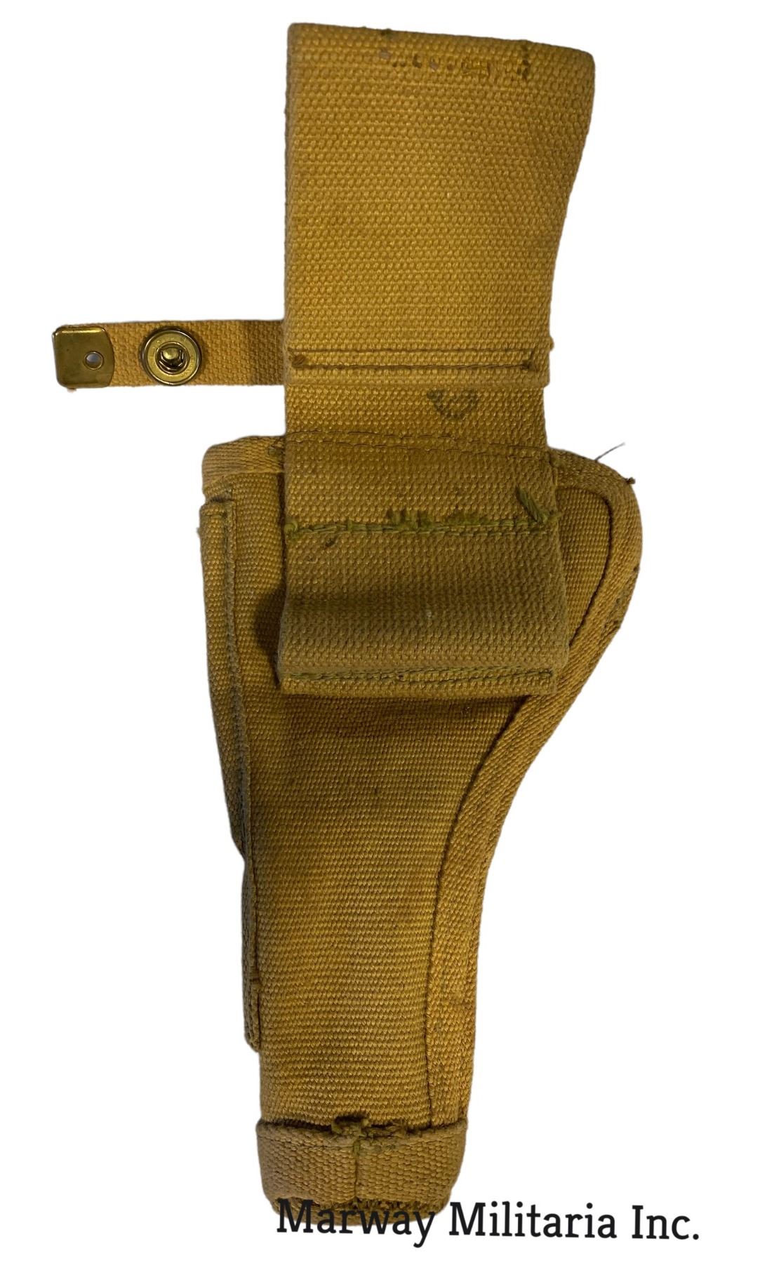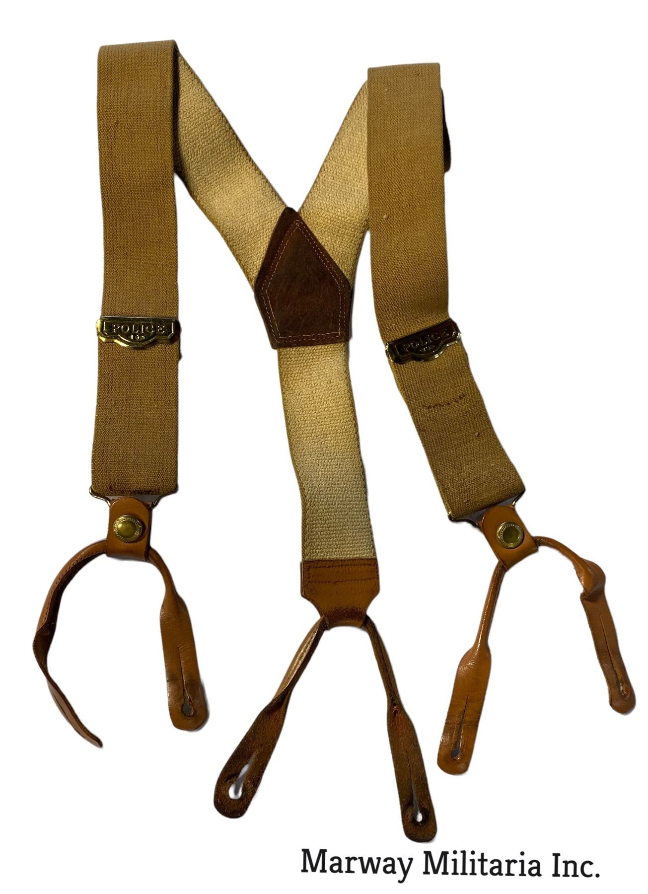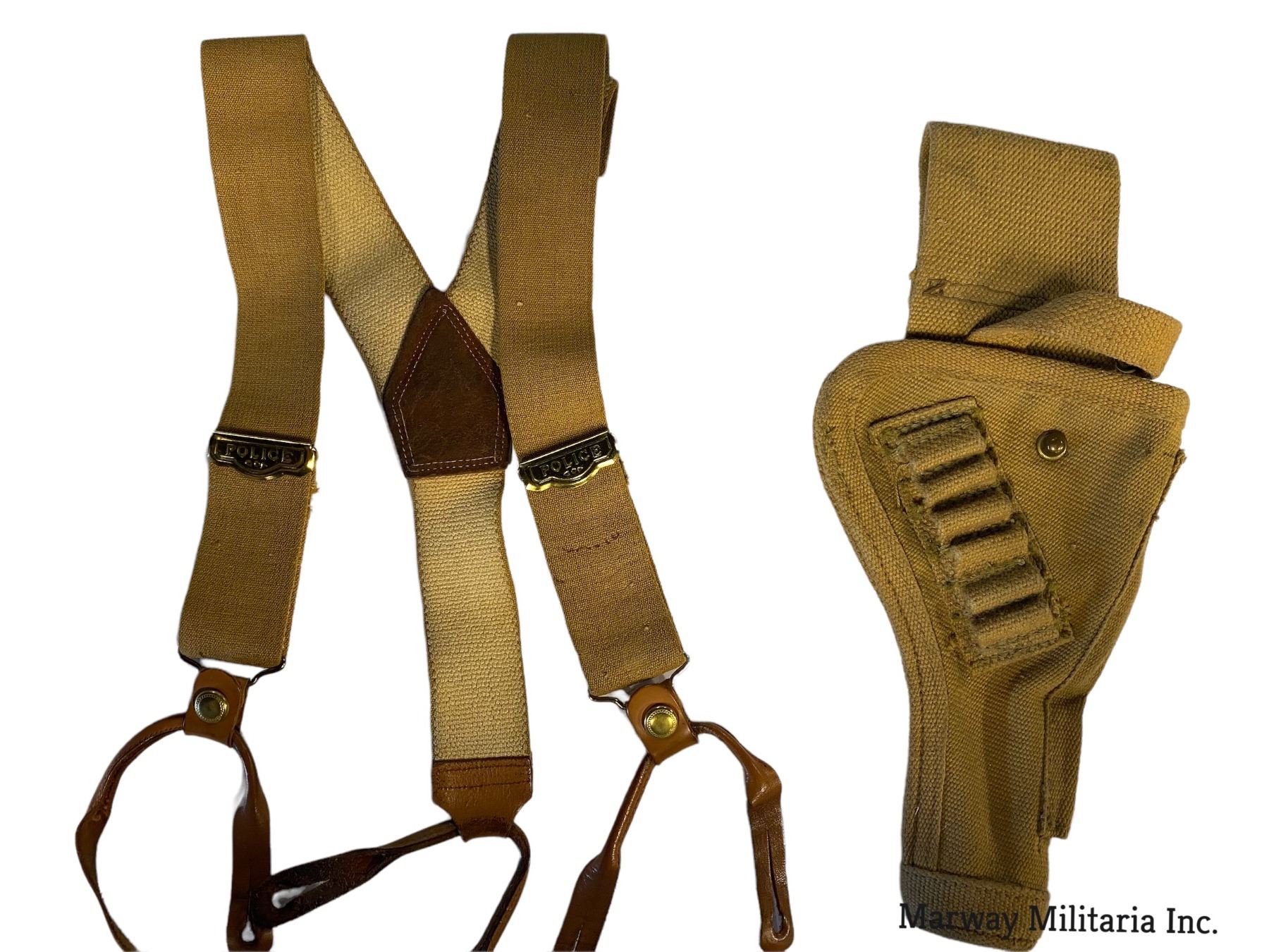 Lot of 2. Holster shows some wear and use, marked with the Canadian Broad Arrow. Police marked Khaki suspenders, with leather tabs.
