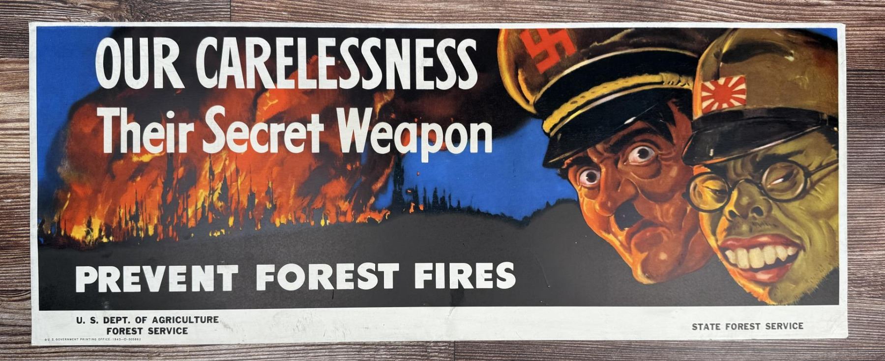 11" by 28". Sign variant printed by the US Government Printing Office for the US Dept. of Agriculture. Sign shows Adolf Hitler and Hideki Tojo. Produced by the US Forest Service. 1943 dated.