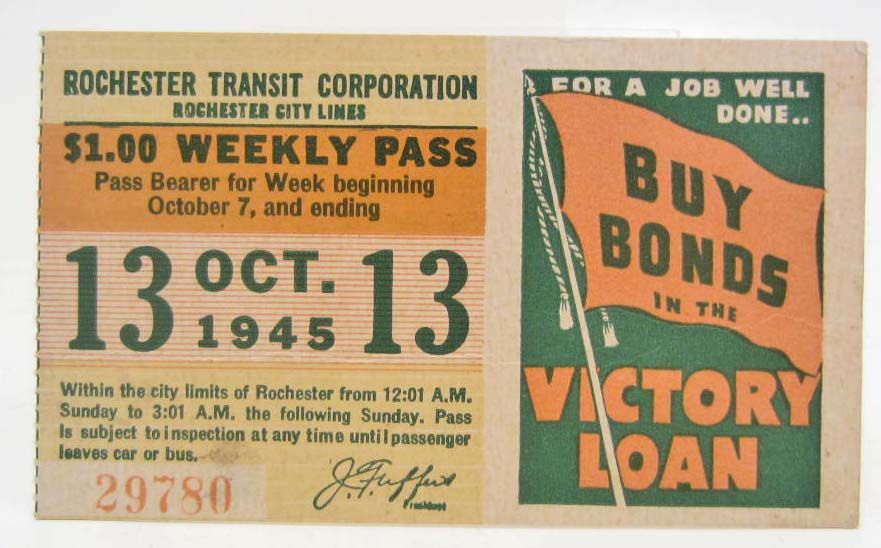 WW2 ERA 1945 ROCHESTER TRANSIT TICKET WITH BOND AD