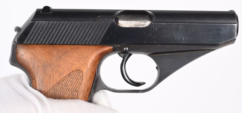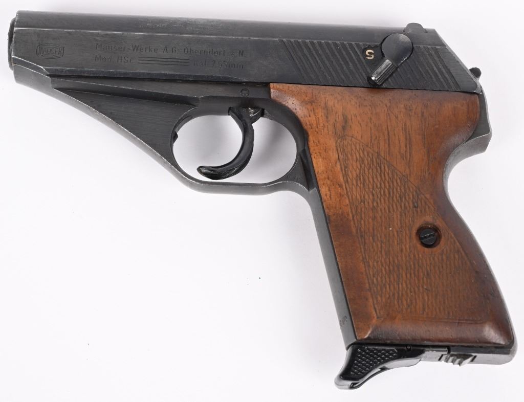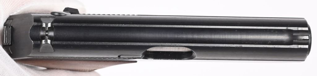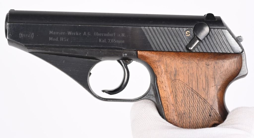SERIAL NUMBER 941640 BARREL 3 3/8" CALIBER 7.65 / 32 ACP MANUFACTURED LATE WW2. Very late production with blue finished frame and slide with checkered wood grips. Smooth sight channel in slide and plastic finger rest magazine Eagle "N" proofs on trigger guard and German military inspections Eagle WaA135 on right trigger guard. Frame, slide and barrel are matching numbers. Grips not numbered. Pistol is housed in leather flap holster marked "MAUSER 7.65" on internal of flap . Maker mark is not legible . CONDITION. Pistol is very fine with excellent bore and retains over 97% blue finish and action operates properly. Grips screws are replacements. Holster is supple with slight scuffing and tear on closure strap. C&R
