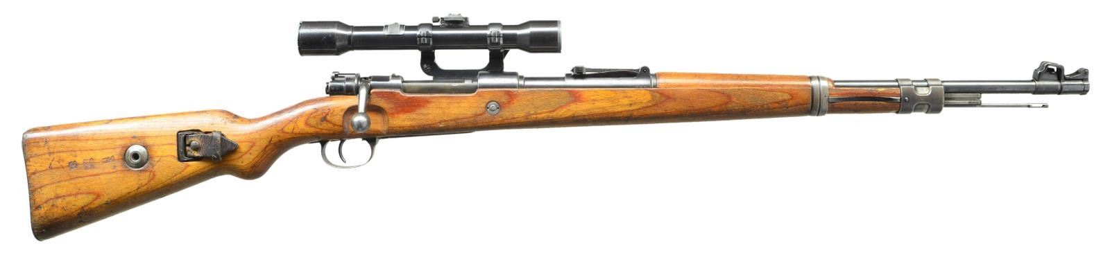 BOLT ACTION SNIPER RIFLE. Cal. 8mm Mauser. S#1632k. Bbl. 23-5/8". J.P. Sauer model 98k rifle assembled to short rail sniper configuration using an original early mount with a commercial unmarked telescopic sight and a replica base. All visible numbers match except bolt assembly, which is numbered 8931. Tangent rear sight graduated to 2000 meters. Inverted v front sight. Receiver ring is marked on top "147" & "1939". Marked on right side w/ "eagle 359" & two "eagle 37". Receiver ring and barrel marked on left side with German eagle proofs. All milled furniture. Bands are retained by single spring. Cleaning rod and bayonet bar are present. Laminated stock set w/ flat buttplate and steel take down hole. Buttstock is marked on right side with "eagle" "H" and two "WaA37". Marked at bottom with two" WaA37" and S#. Correct brown leather sling. Rifle is fitted with a replica mount base attached with three screws, which are staked by a single center punch strike. The serial # is hand stamped. There is also an "eagle 359" which appears to be from an aftermarket stamp. The screw ends viewed inside the receiver rail do not match, one is not blued, and they are staked by a single center punch strike. The scope mount appears original. It is marked in the center on top with the HZW logo which is the Hermann Weihrauch Waffenfabrik of Zella-Mehlis. The inside of the dovetail has a tiny encircled "2". Mount is numbered 1146 at bottom outside. 26mm scope w/ blued steel tube. Scope is adjustable for elevation and focus. Pointed vertical post w/ horizontal crossbar reticle. Scope has S# under elevation knob and "43" at bottom forward end of tube. UNATTACHED ACCESSORIES: Blued steel sight protector and muzzle cover. CONDITION: original finish stock set has moderate wear, staining, and handling marks through out. Inletting for mount base has neat appearance. Metal retains 75% of its original blue finish with thinning, wear, and handling marks. Mount base has thinning and wear. Mount has very good appearance, with light high point wear. Scope has arsenal rework blue finish w/ thinning and moderate wear. Optics appear cloudy. Post is not centered between crossbars. Bore turning dark with moderately worn lands. (22-4780/RW). $2,000-3,500.