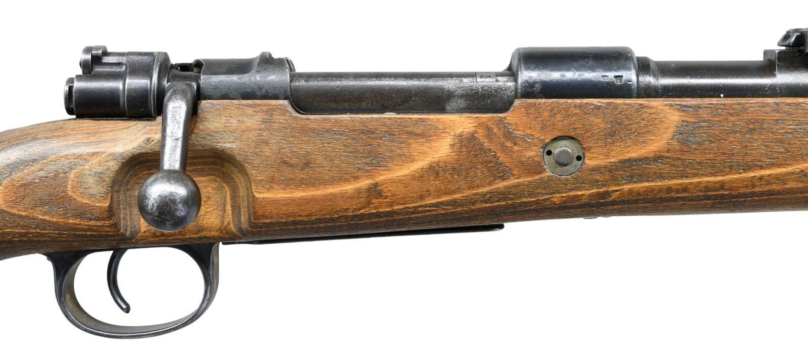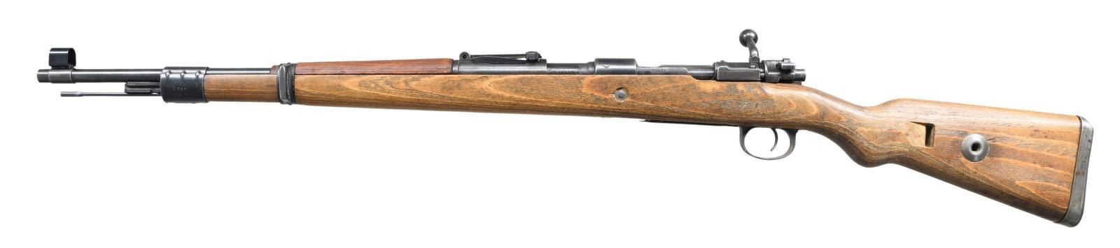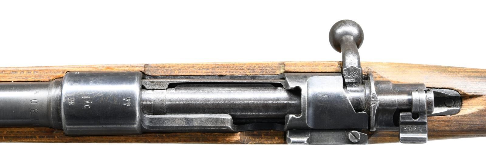 Cal. 8mm Mauser. S# 17349. Bbl. 23 1/2". Matching numbers on stock, rear band & floorplate. Other parts unnumbered or mismatched. Right side of receiver has two Waffenamts. Top of receiver is marked "byf 44" denoting Mauser Oberndorf mfg. in 1944. Tangent rear sight graduated to 2000m. Blade front sight w/ hood. Laminated stock set w/ faint WaA135 eagle on right side of butt & unrepaired duffel cut at lower band. Left side sling provisions. Cleaning rod present. CONDITION: stock set shows some dings, staining & handling marks. Metal retains 60% original blue w/ scattered thinning & light oxidation. Very good bore w/ some light frosting. (23-2020/MJC). CURIO. $500-800.