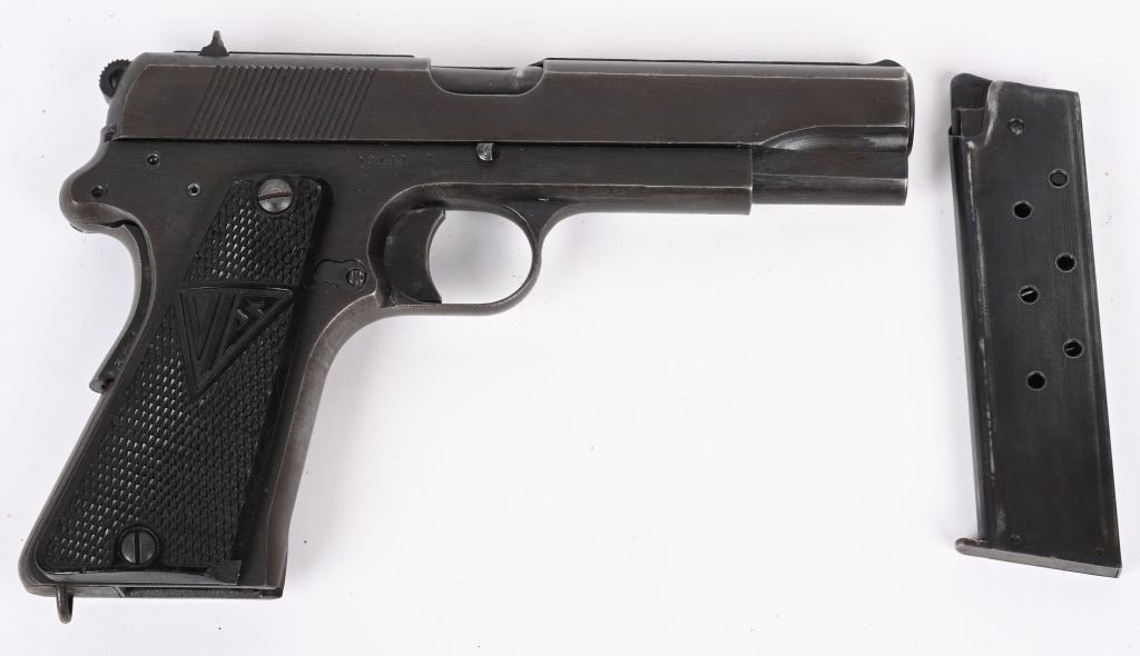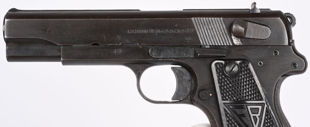 SERIAL NUMBER D3199 BARREL 4 5/8" CALIBER 9MM PARA MANUFACTURED WW2. Produced in Poland at Radom under German occupation. Blue finished with checkered black plastic grips. Dual lever model with 3 rivets at rear of frame. Eagle 77 & Eagle WaA 623 inspection on slide frame and barrel. Produced in the fist alphabet serial number series. CONDITION, Very good with pistol retaining over 70% blue finish with grips straps and edges turning plum. Bore is very fine. All numbers are matching. C&R