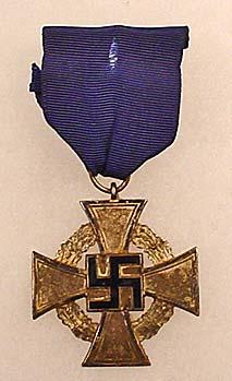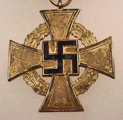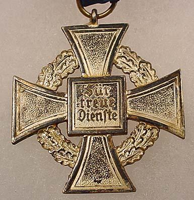 WW2 GERMAN NAZI 10 YEAR FAITHFUL SERVICE CROSS W/ BLUE RIBBON - Has black enameled swastica.