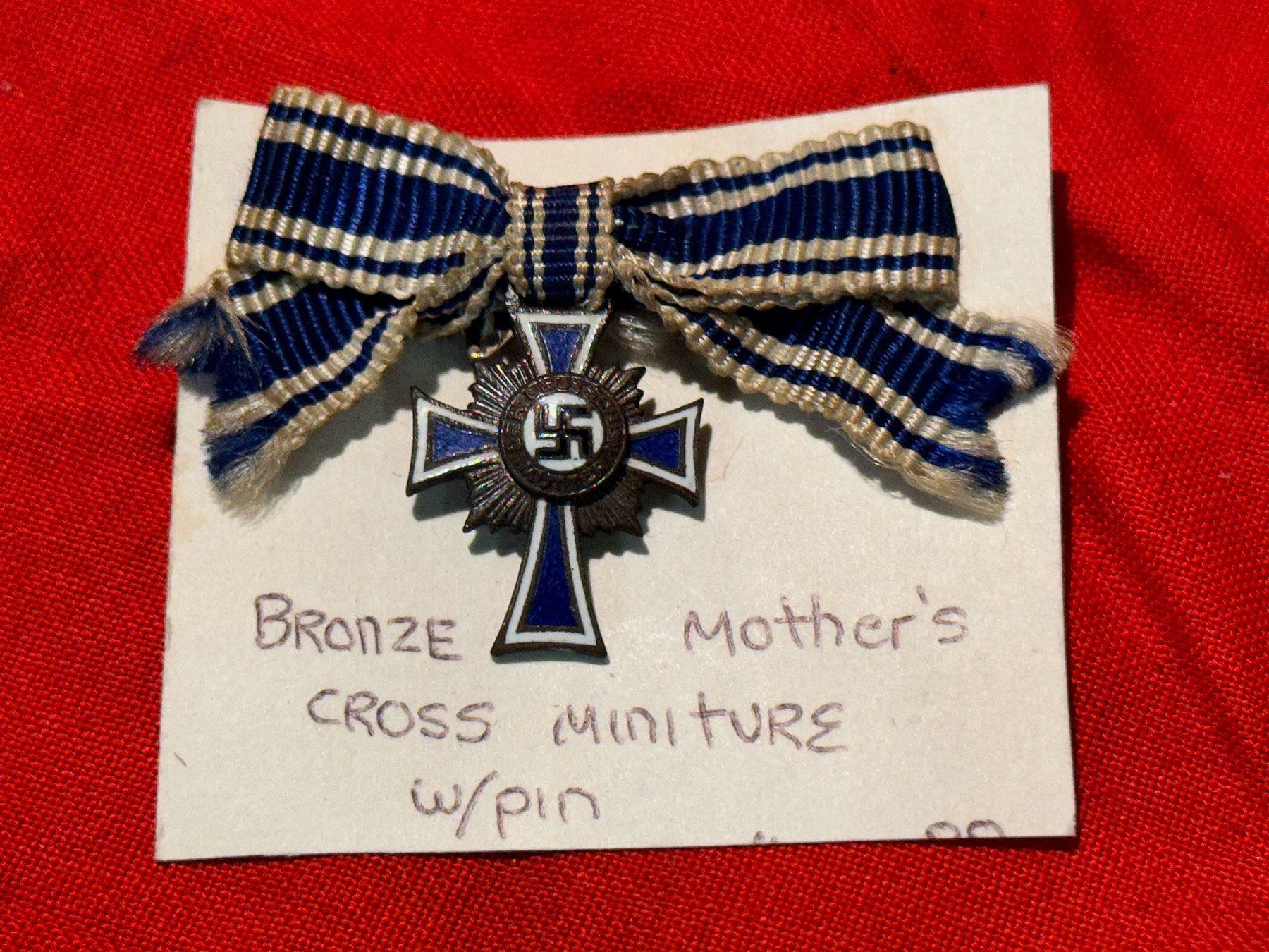 WW2 GERMAN NAZI BRONZE MINIATURE MOTHERS CROSS WITH PIN. IT IS IN MINT OVERALL SHAPE AND CONDITION WITH A BEAUTIFUL OVERALL PATINA. SHOWS GOOD WEAR AND USE. PLEASE VIEW ALL DETAILED PICTURES. A GREAT FIND AND AN EXCELLENT ADDITION TO YOUR COLLECTION.