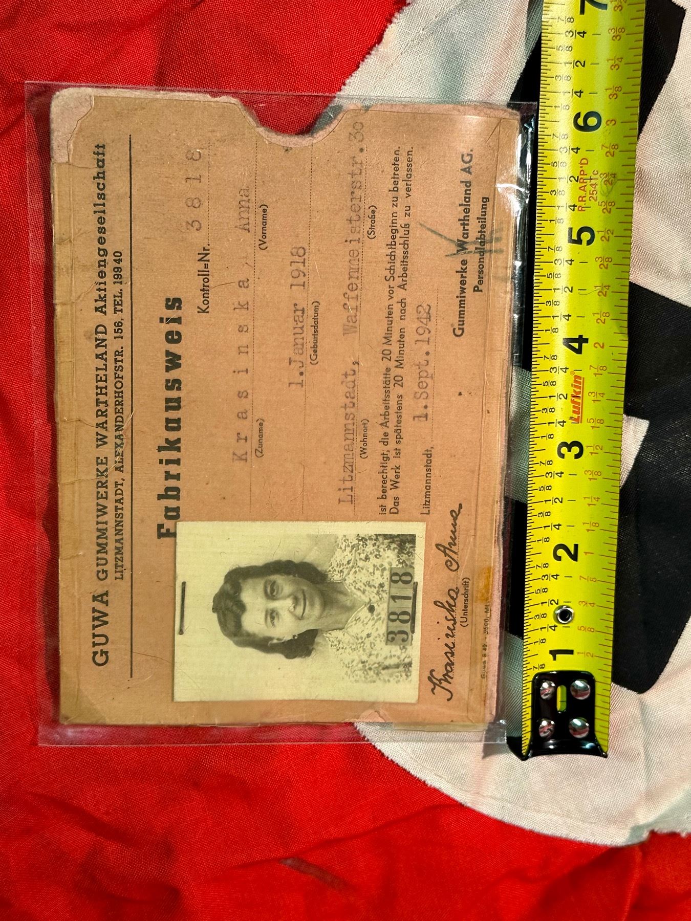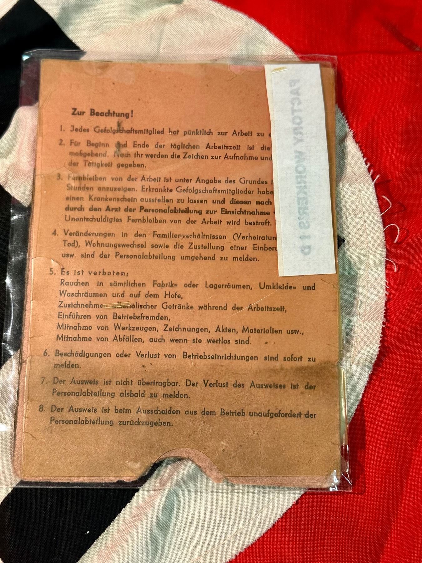 WW2 GERMAN NAZI DEMOCRATIC ID CARD - FABRIKAUSWEIS. A RARE FIND. IT IS IN MINT OVERALL SHAPE AND CONDITION WITH A BEAUTIFUL OVERALL PATINA. SHOWS GOOD WEAR AND USE. PLEASE VIEW ALL DETAILED PICTURES. A GREAT FIND AND AN EXCELLENT ADDITION TO YOUR COLLECTION.