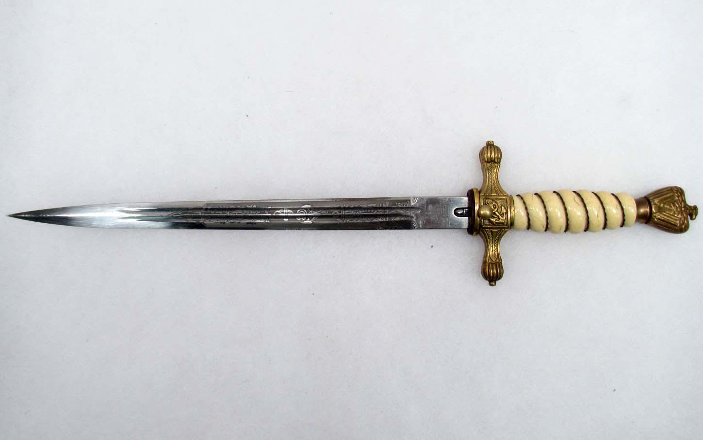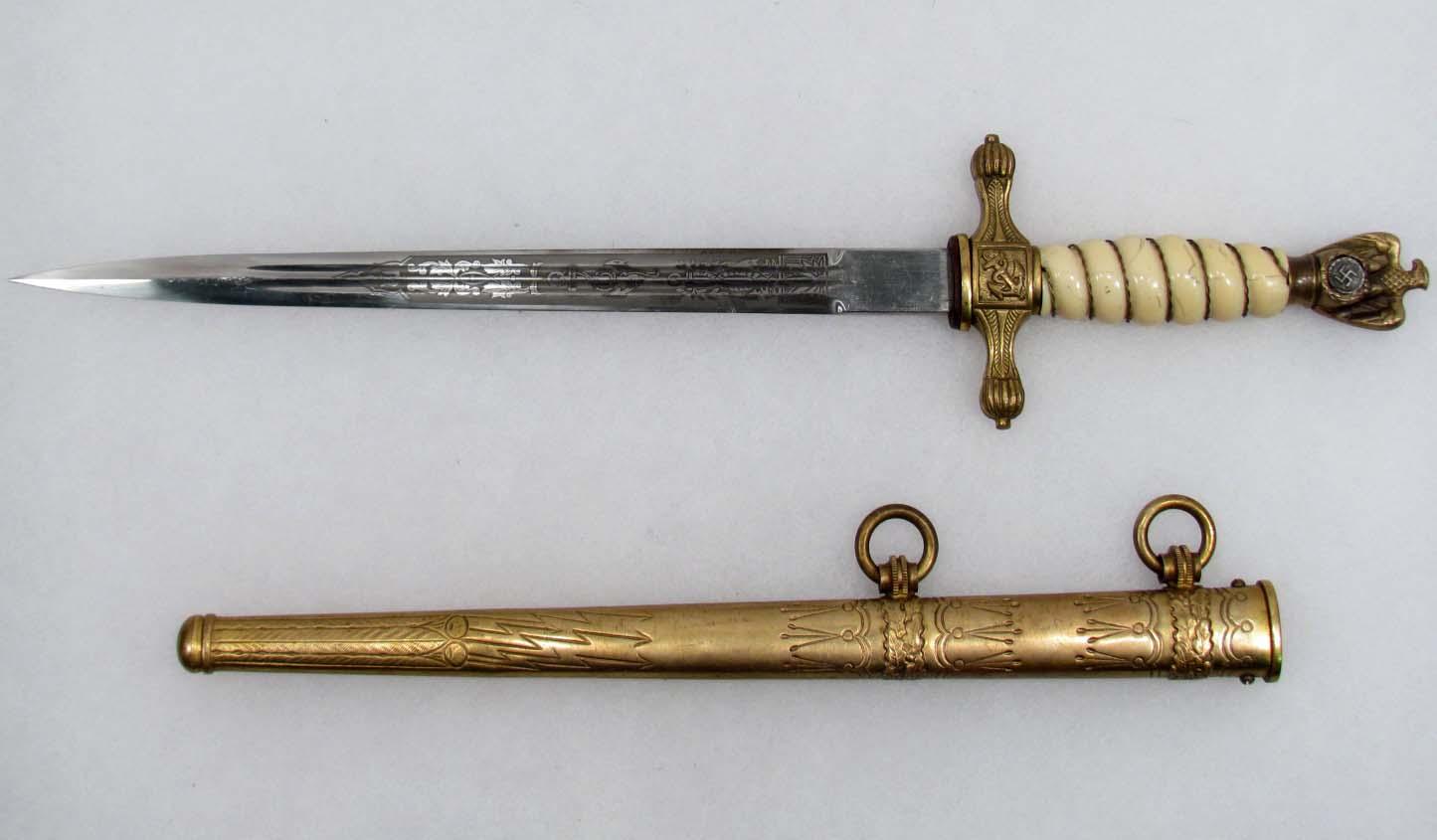 Blade is maker marked Eickhorn Solingen Original w/ Squirrel logo. Double engraved w an anchor motif and floral pattern. Brass lightning bolt scabbard. Approx 16.5" long overall.