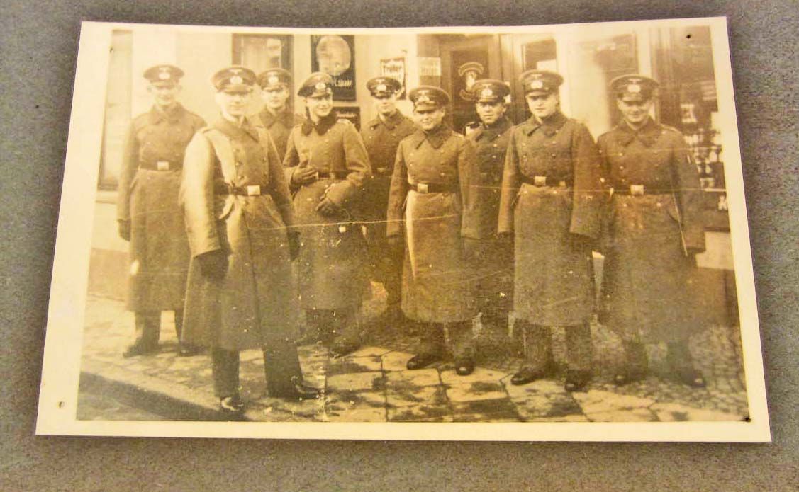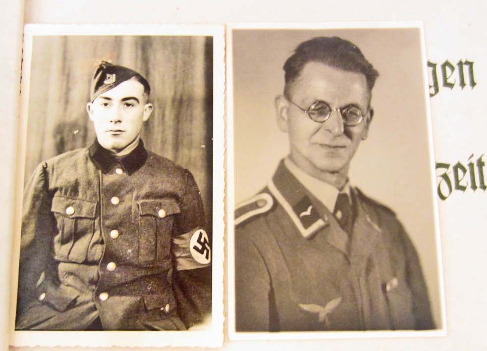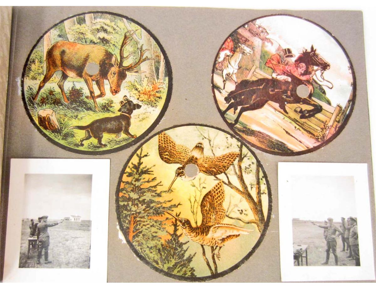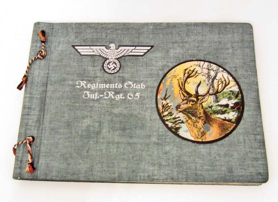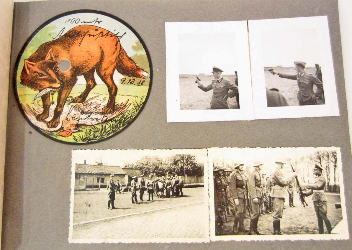 This is a very interesting photo album w/ approx. 38 photos of Nazi German Soldiers. It also has Targets that he has shot and some are signed with the dates on them. Photos include Soldier firing pistol, Soldiers in line formation, Soldiers in front of a store, Soldiers & Civilians waiting for a Train, Soldiers outside a Train & appear to be Bathing - they are shirt-less and have towels, Soldiers cutting a log, Soldiers outside a Bunker, Soldiers lined up to get food, Soldiers at ease resting on the ground outside, Soldiers talking to another soldier w/ Aviator goggles on and arm in a splint, Soldiers looking for something in the trees, more. Very, Very Amazing Photo Album.