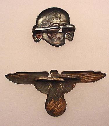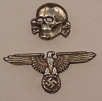 WW2 GERMAN NAZI WAFFEN SS VISOR CAP EAGLE AND SKULL - Both have 2 flat prons on reverse. Eagle is maker marked RZM 52 and Skull is maker marked RZM M1/52.