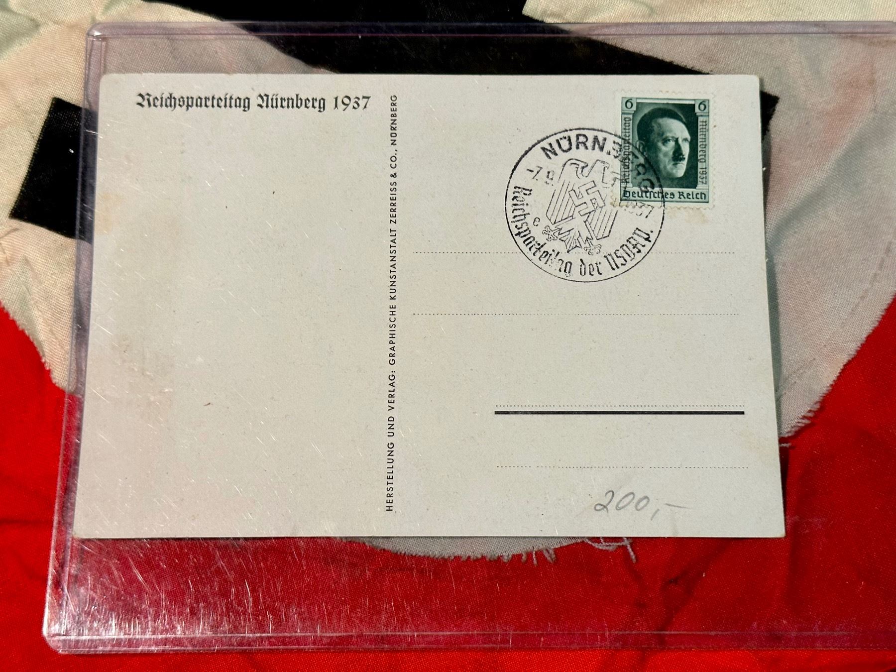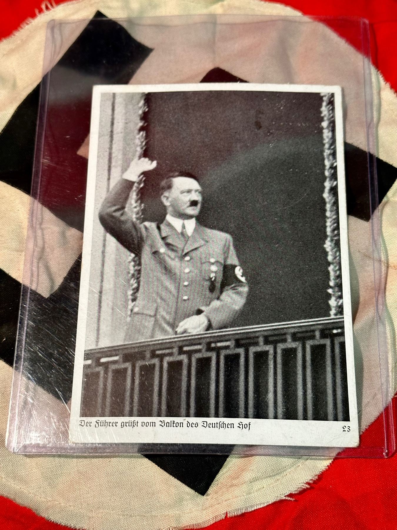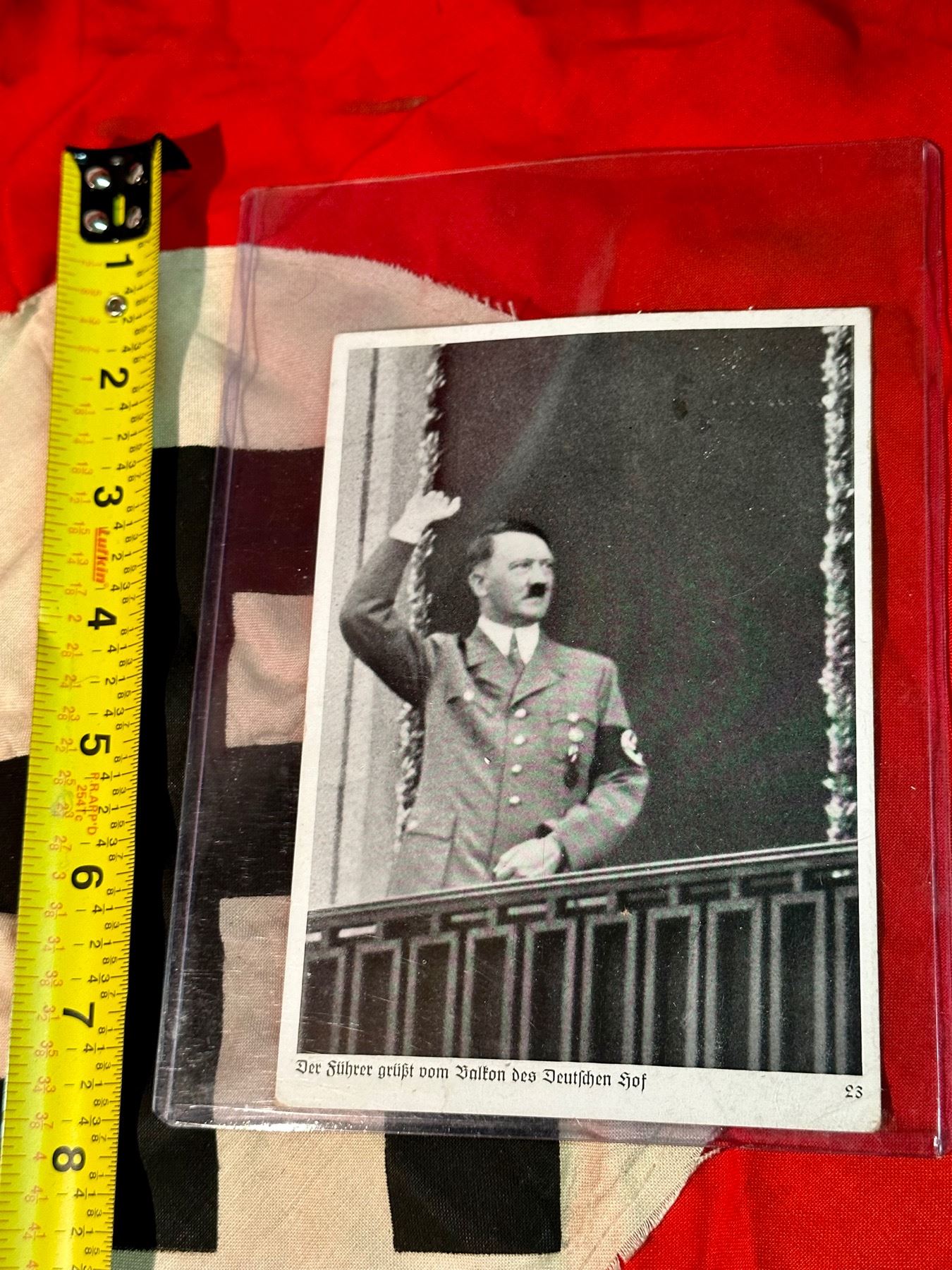 WW2 GERMAN POSTCARD WITH STAMP OF ADOLF HITLER SALUTING FROM BALCONY. A RARE FIND. IT IS IN MINT OVERALL SHAPE AND CONDITION WITH A BEAUTIFUL OVERALL PATINA. SHOWS GOOD WEAR AND USE. PLEASE VIEW ALL DETAILED PICTURES. A GREAT FIND AND AN EXCELLENT ADDITION TO YOUR COLLECTION.
