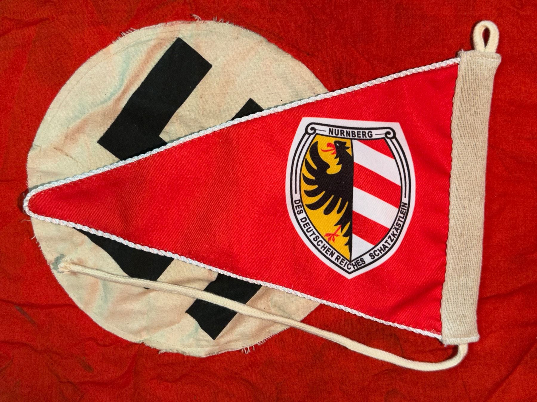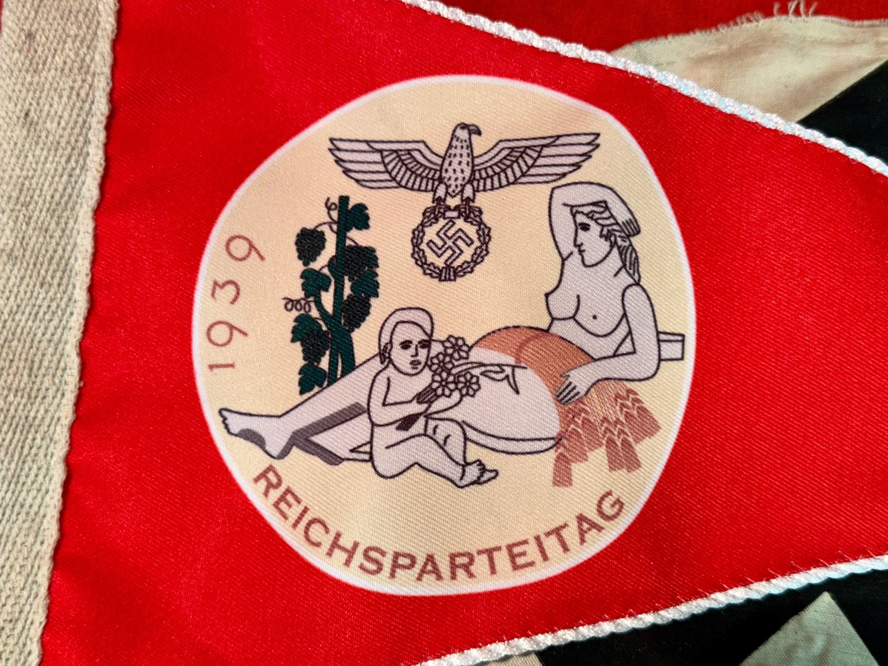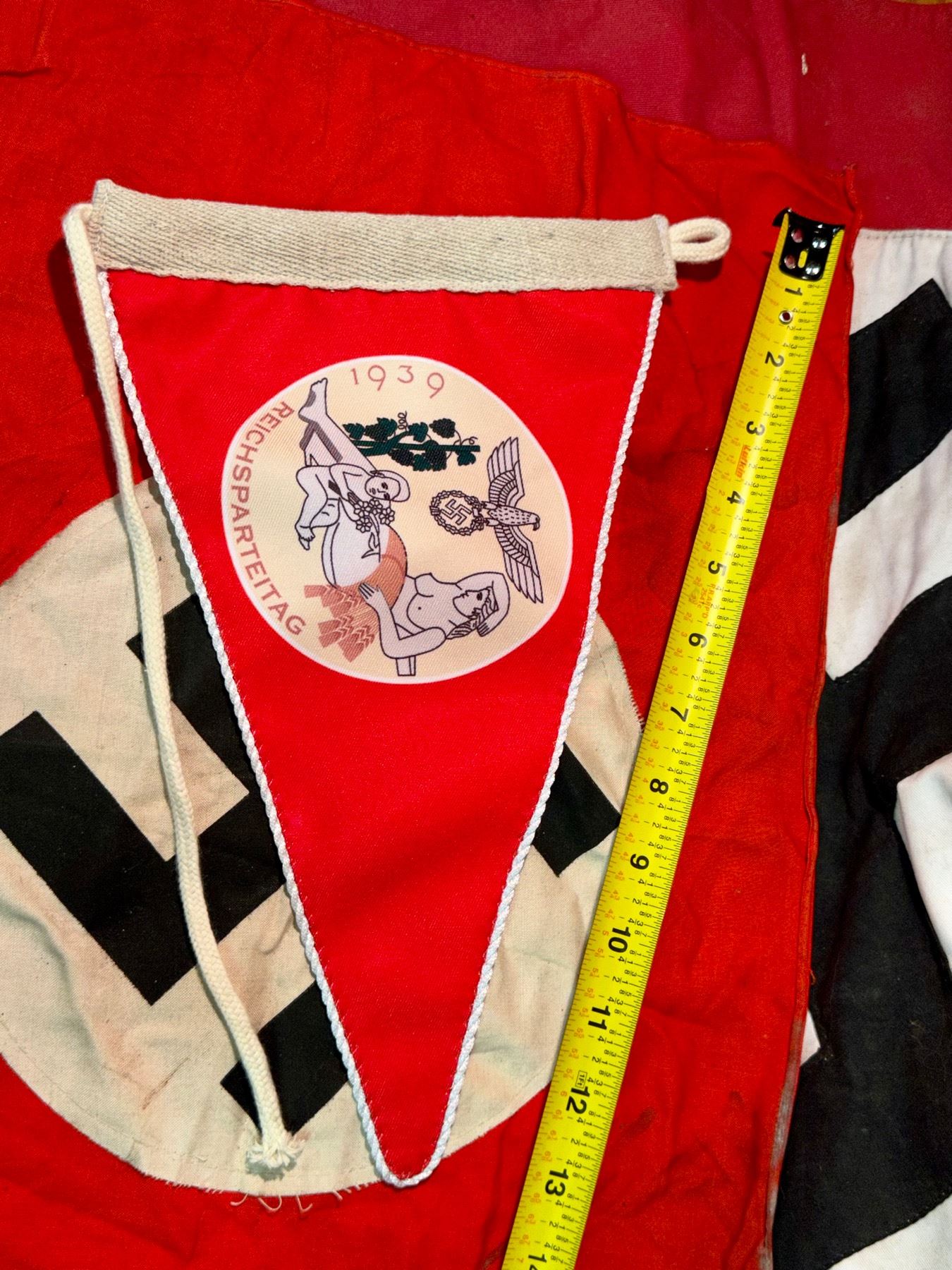 WW2 GERMAN REICHSPARTEITAG PENNANT 1939. A RARE FIND. IT IS IN MINT OVERALL SHAPE AND CONDITION WITH A BEAUTIFUL OVERALL PATINA. SHOWS GOOD WEAR AND USE. PLEASE VIEW ALL DETAILED PICTURES. A GREAT FIND AND AN EXCELLENT ADDITION TO YOUR COLLECTION.
