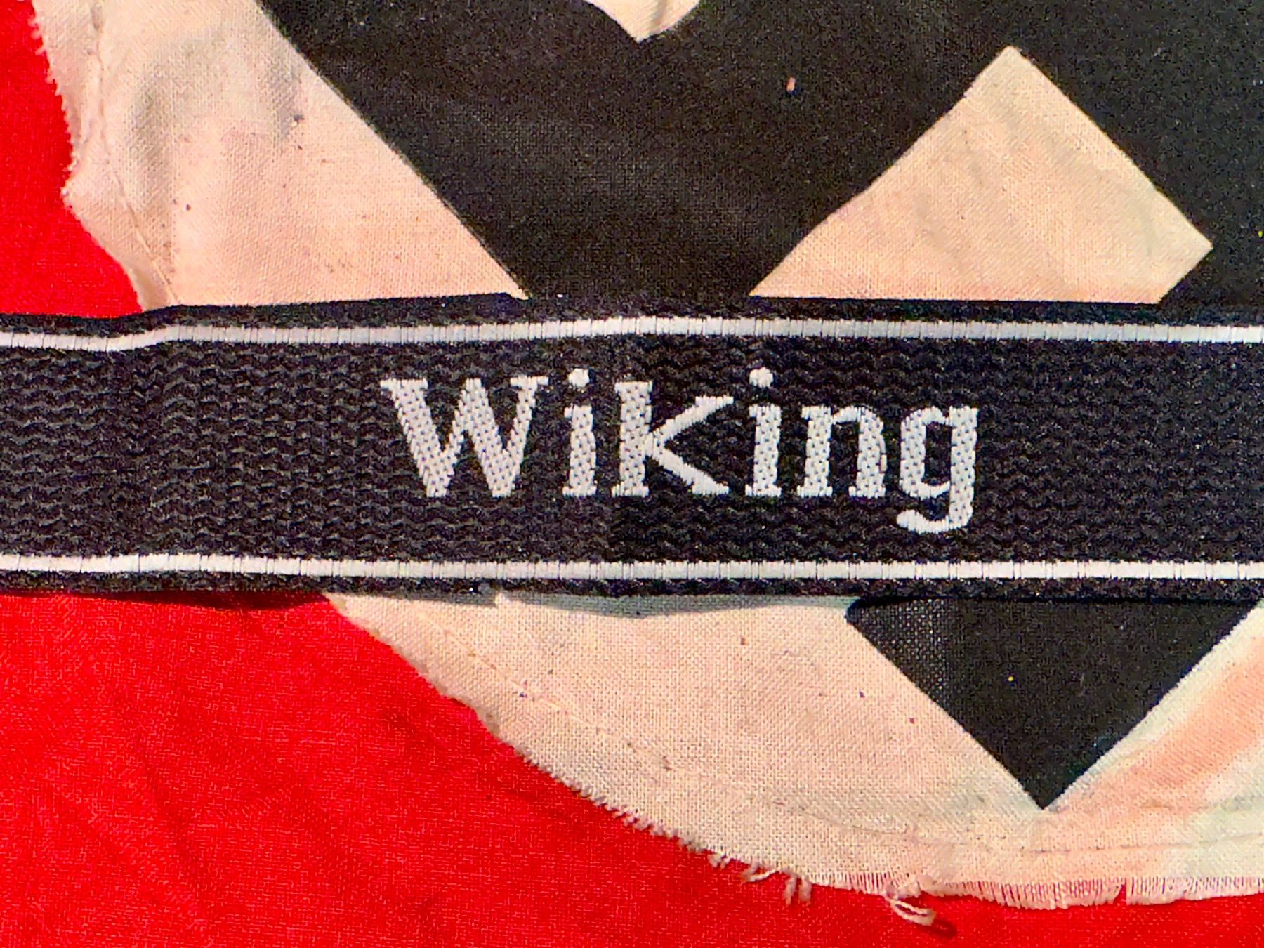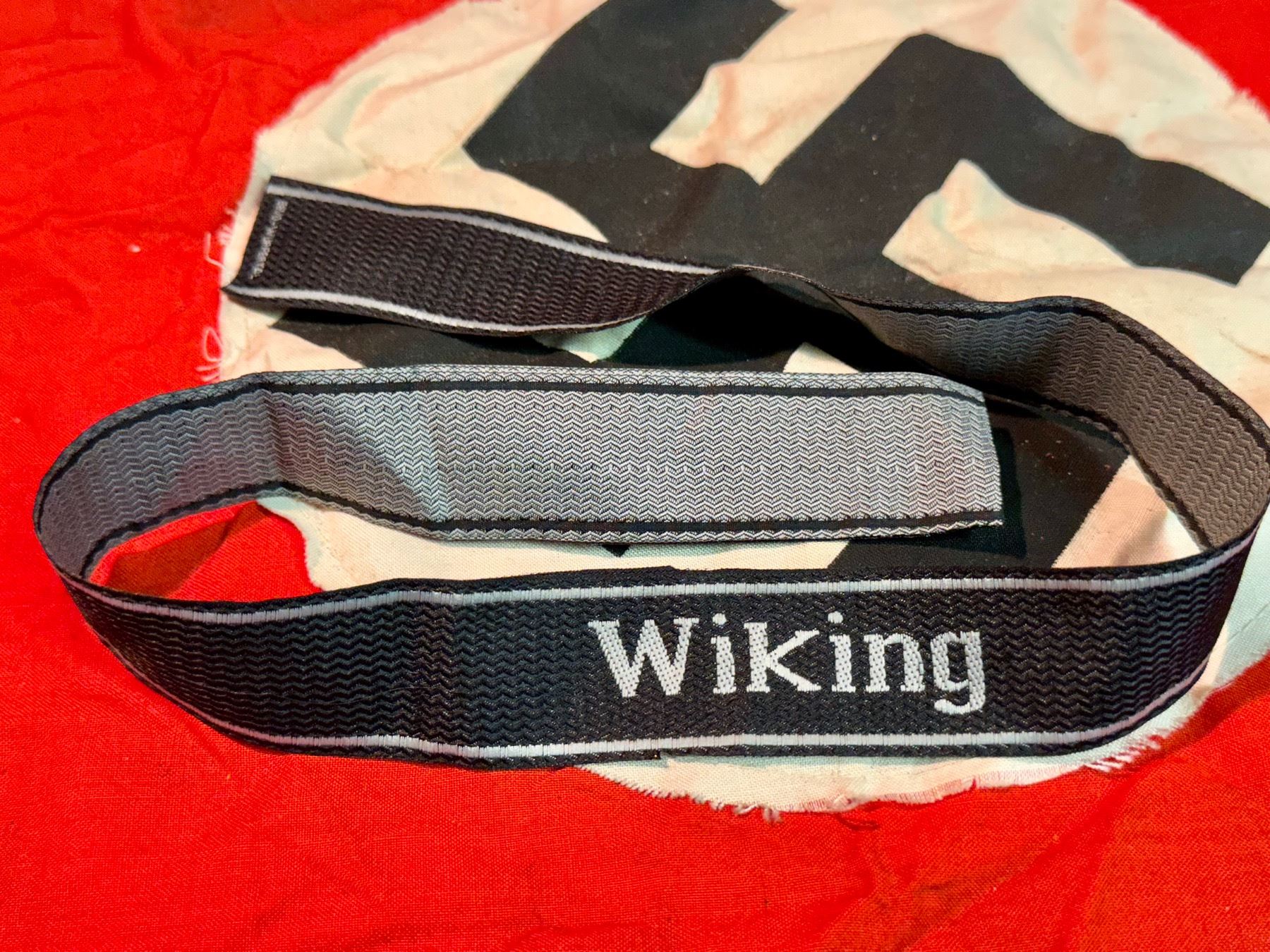 WW2 GERMAN WAFFEN SS WIKING CUFF TITLE. A RARE FIND. IT IS IN MINT OVERALL SHAPE AND CONDITION WITH A BEAUTIFUL OVERALL PATINA. SHOWS GOOD WEAR AND USE. PLEASE VIEW ALL DETAILED PICTURES. A GREAT FIND AND AN EXCELLENT ADDITION TO YOUR COLLECTION.