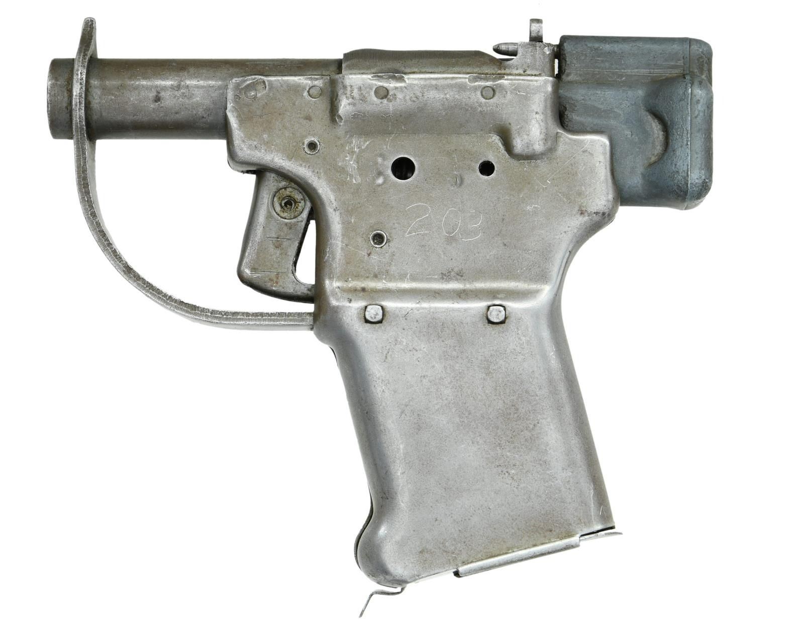 Cal. 45 ACP. NSN. Bbl. 4". Crude fixed sights. Covertly mfg. during WW2 by the Guide Lamp division of General Motors. The gun was given the name "FP-45" to be deceptive implying the gun was a flare projector. The guns saw use by Chinese & Filipino guerillas against the Japanese. The intent was to use this crude weapon to get a better weapon from an enemy soldier. The gun operates by pulling back the cocking piece, rotate it 90 degrees in either direction, left the loading gate, insert a rd of 45 ACP, close the gate pull back the striker, rotate into firing position & then fire. Most of these Liberator pistols were destroyed post-WW2. Floorplate present. CONDITION: left side of frame has electro pencil number "203" & both seams are coming loose. Metal otherwise shows scattered oxidation, dings & handling wear. Smoothbore shows scattered light pitting. PROVENANCE: From the estate collection of Thomas J. Mulligan. (23-2201/MJC). CURIO. $1000-1500.