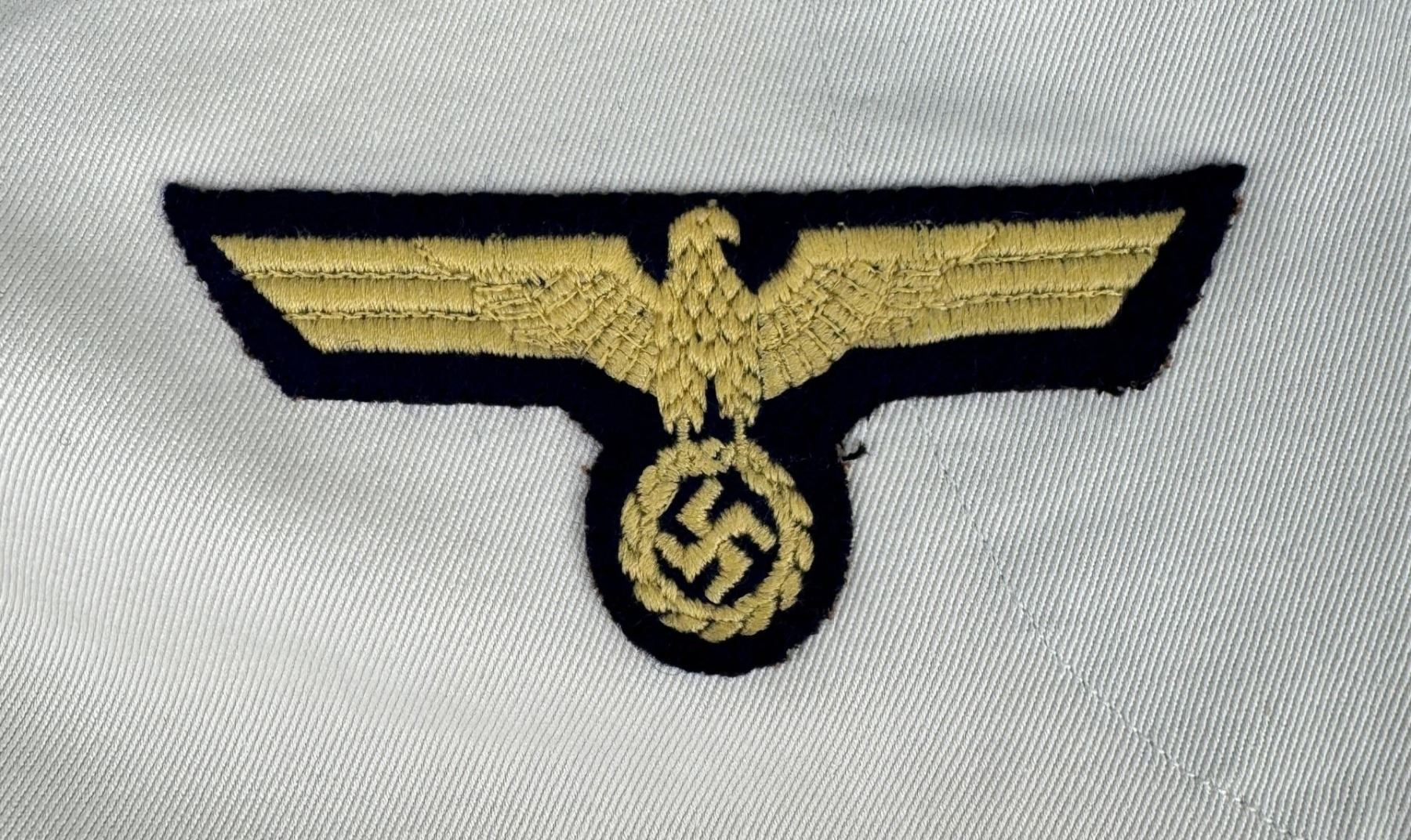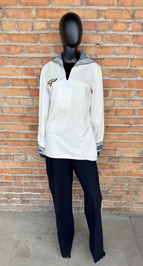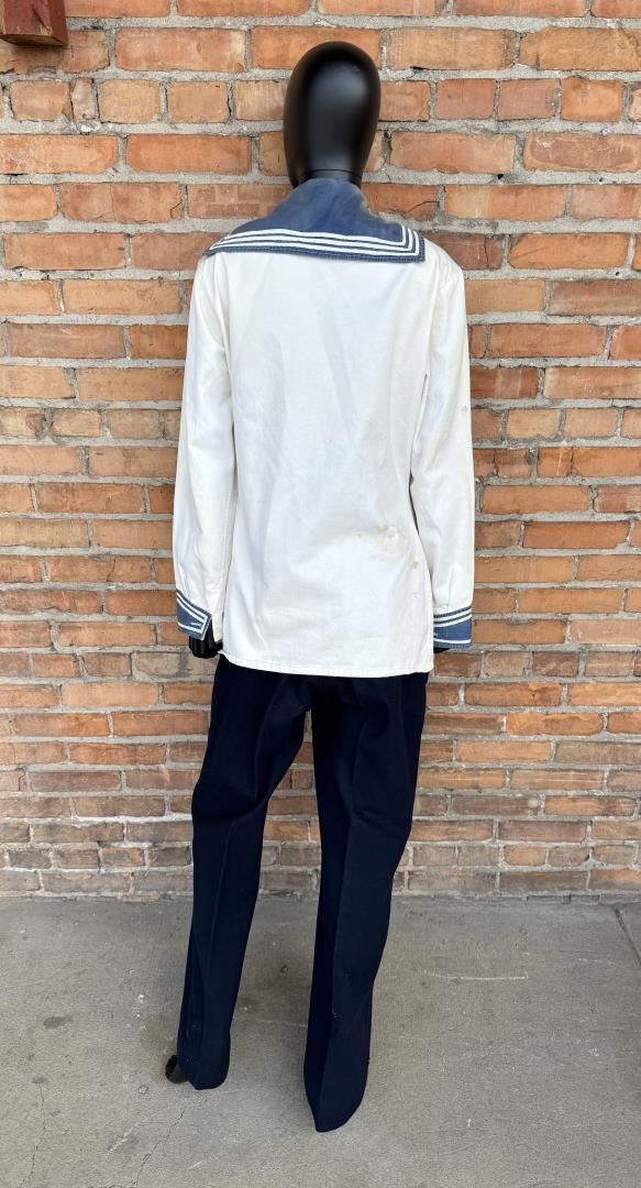 White enlisted naval jumper with blue cuffs and bib. Blue wool naval trousers with a bib front. Jumper measures 19" pit to pit by 32" long. Trousers have a 33" waist and 43" total length.