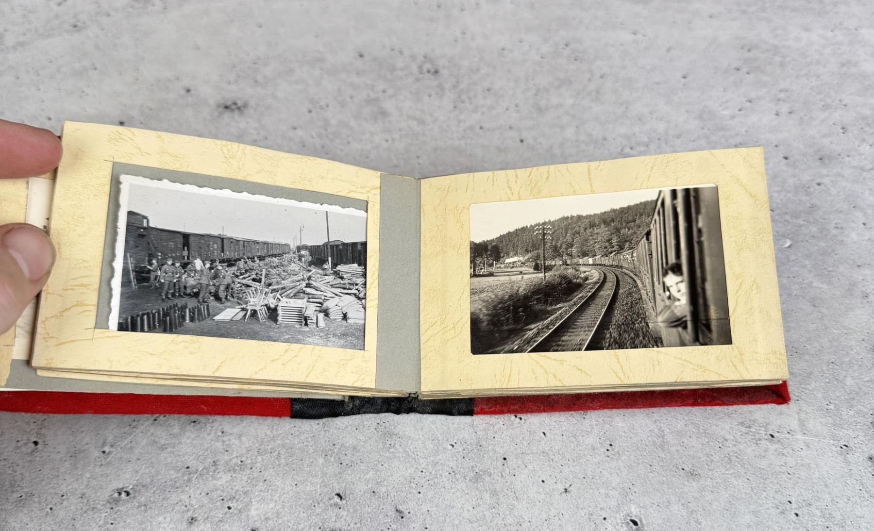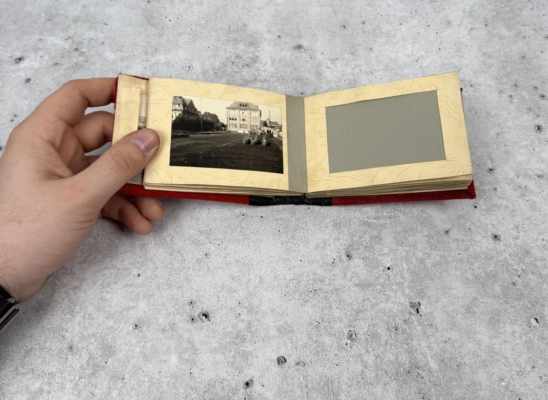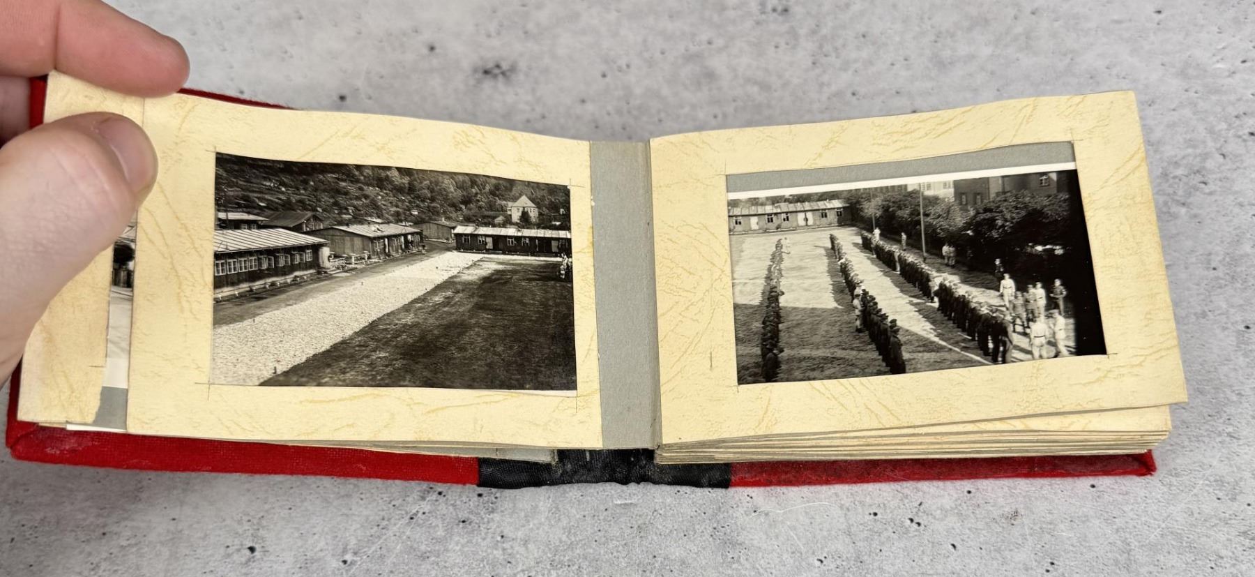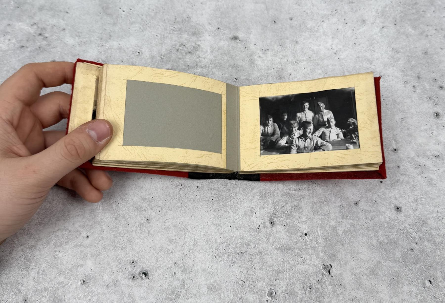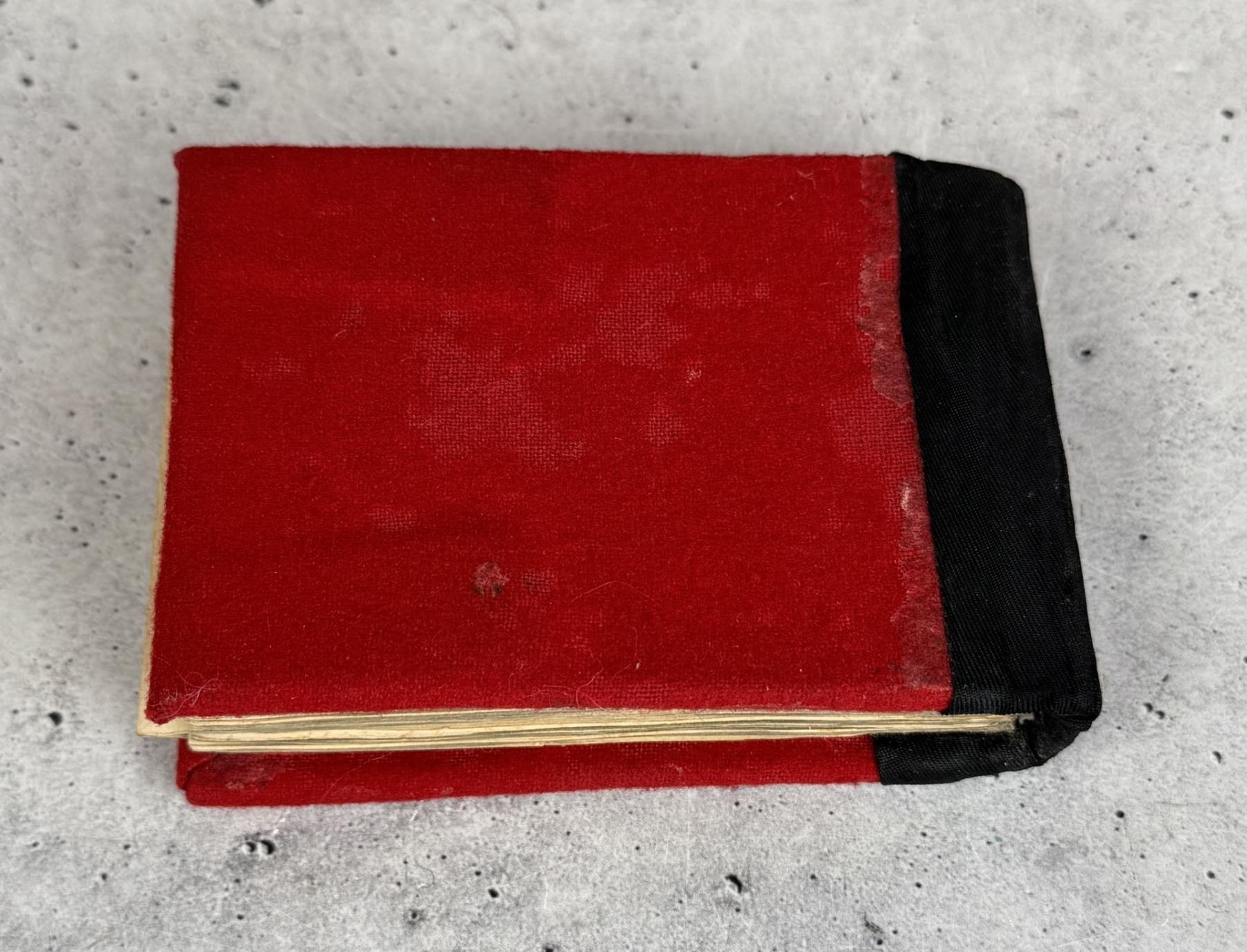 Contains 33 war time photos. Neat album, made from a wool banner or flag. 50 pages total. 5" by 3 3/8" by 1 7/8".
