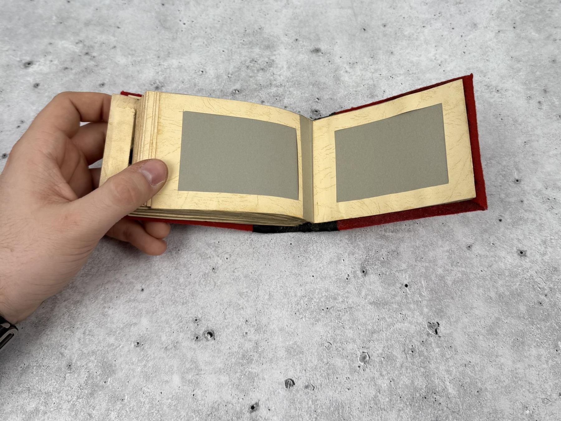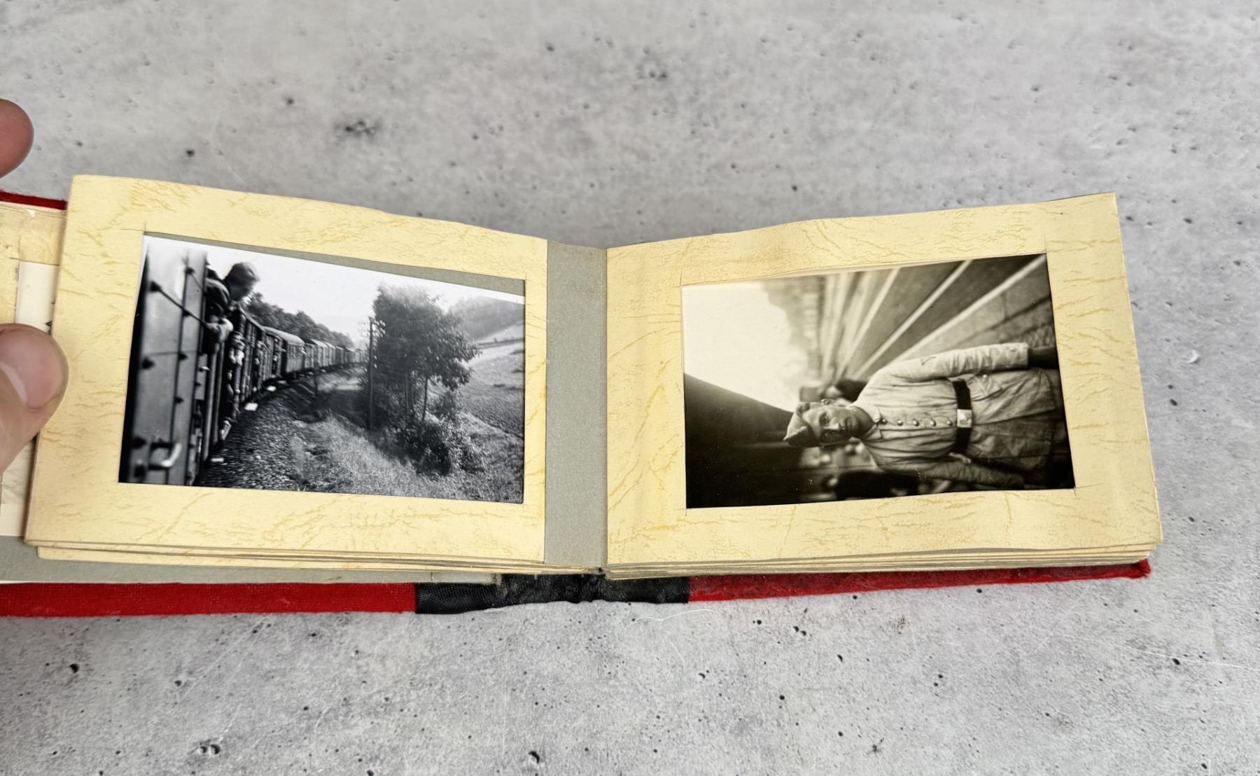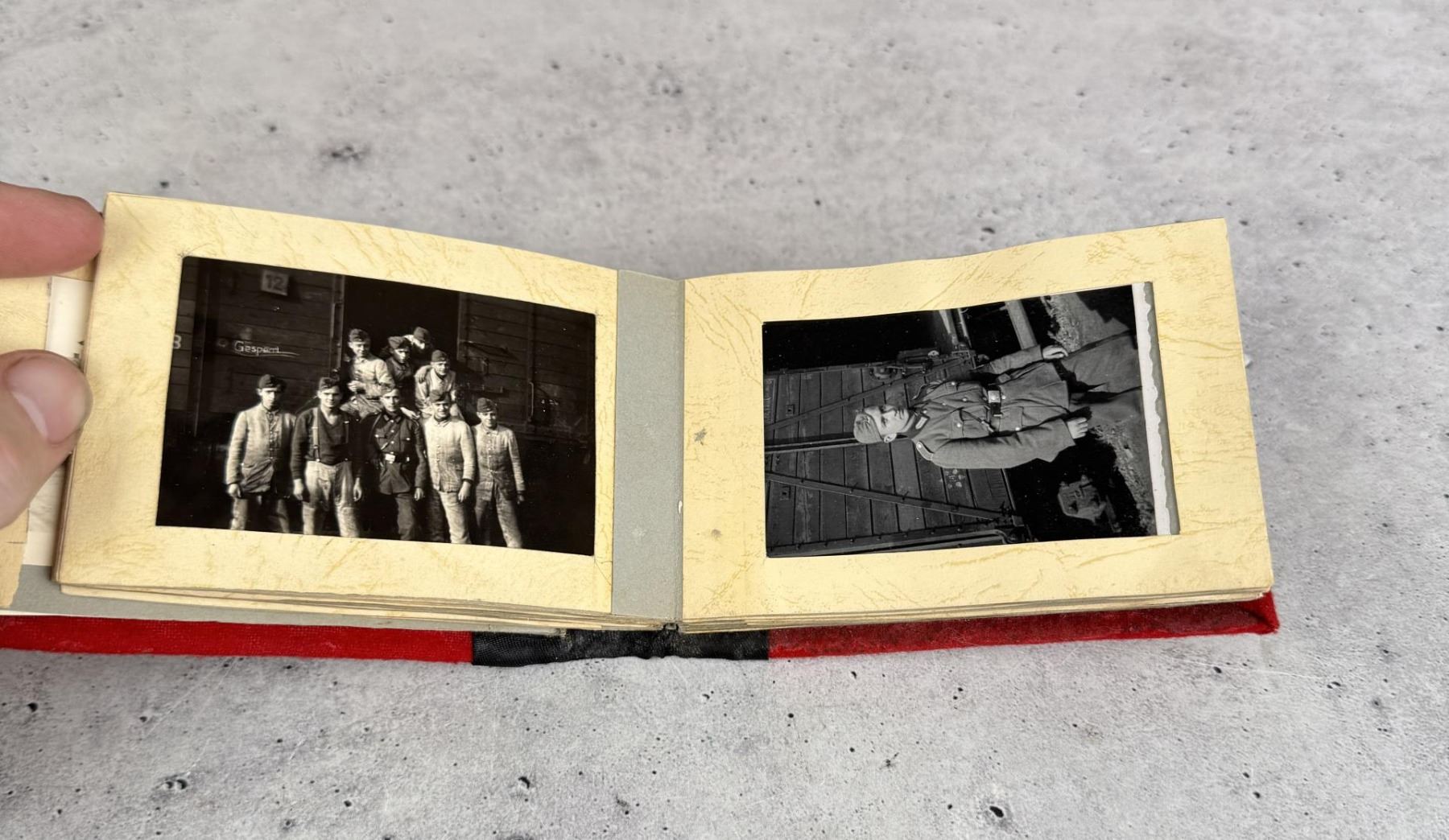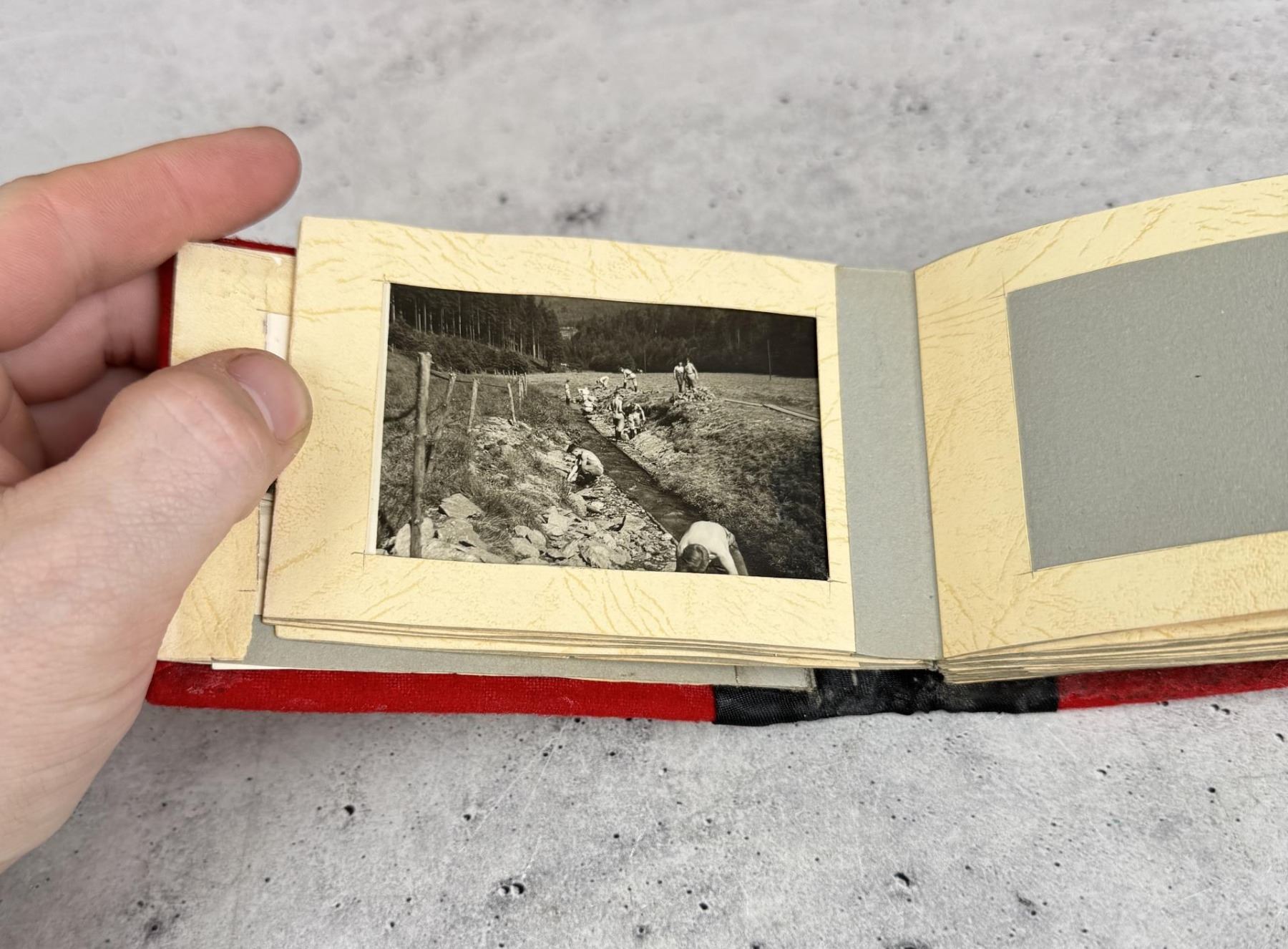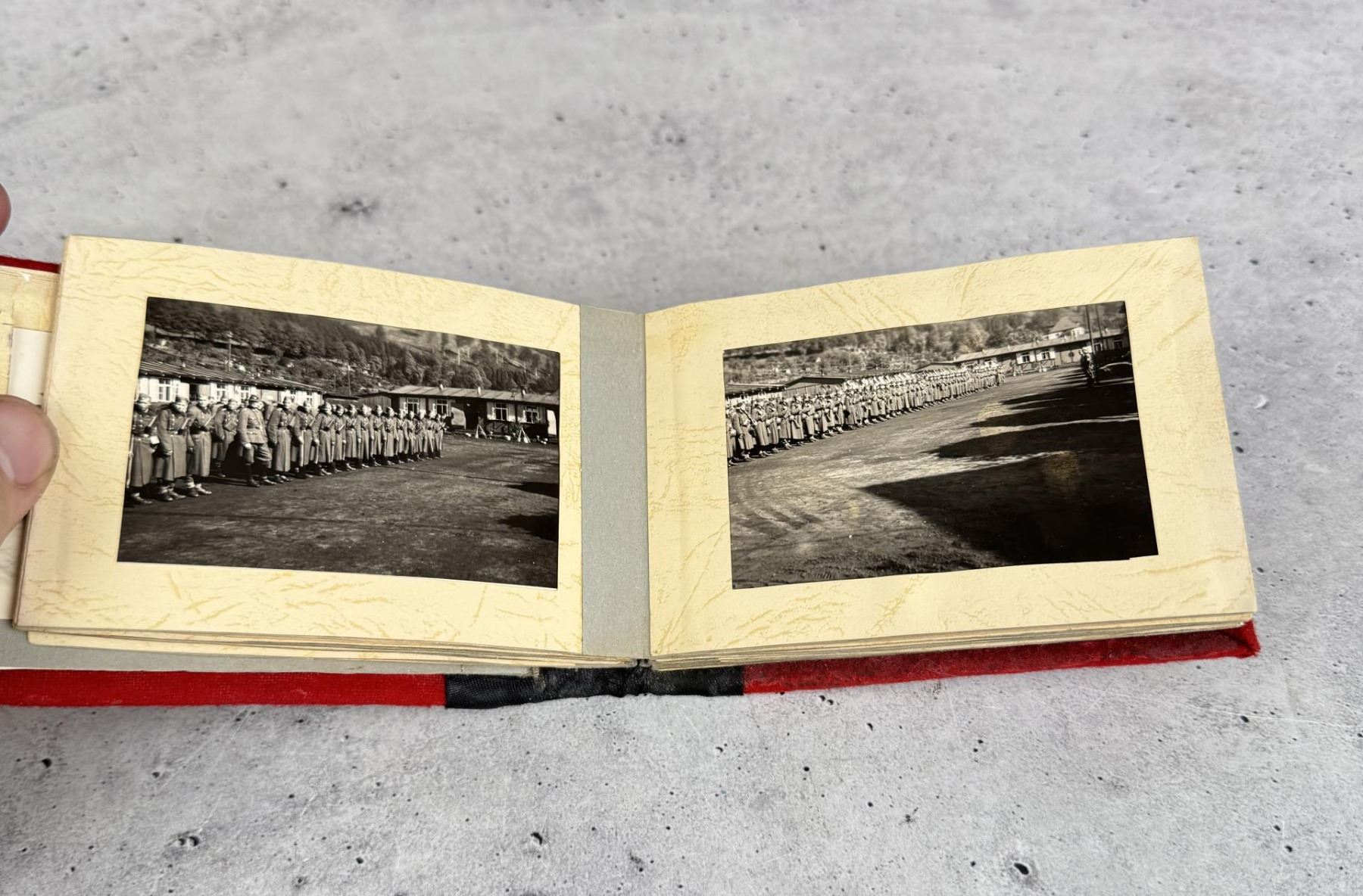 Contains 33 war time photos. Neat album, made from a wool banner or flag. 50 pages total. 5" by 3 3/8" by 1 7/8".