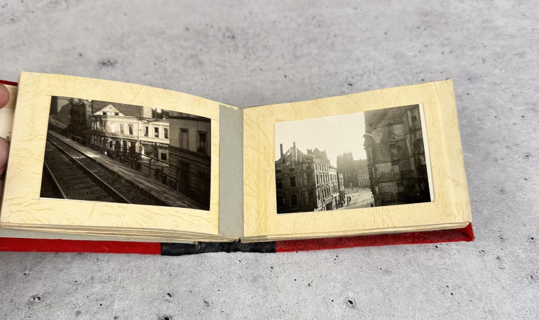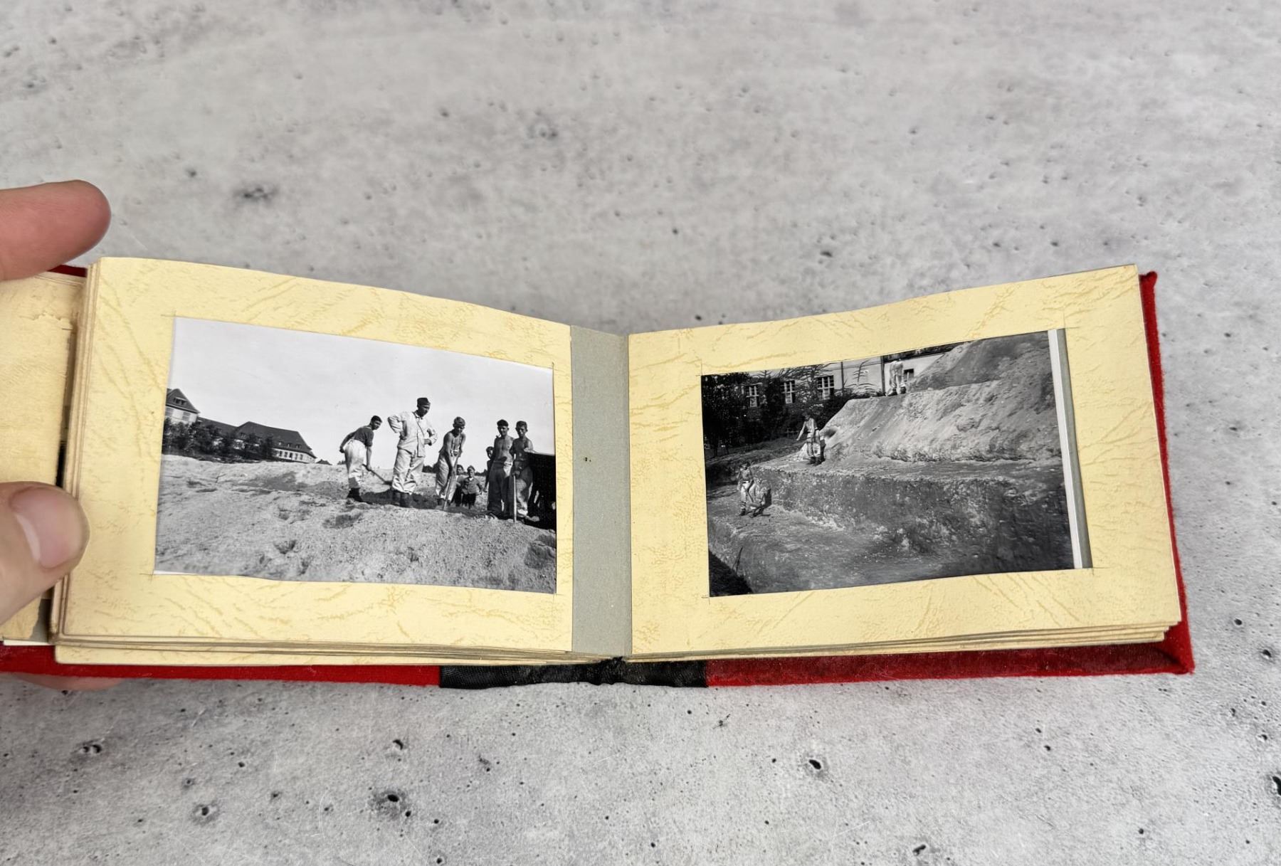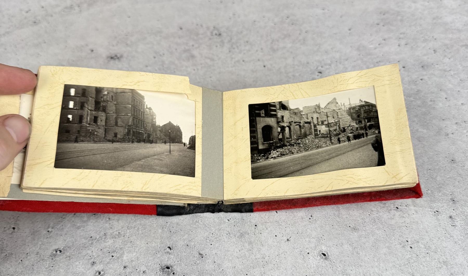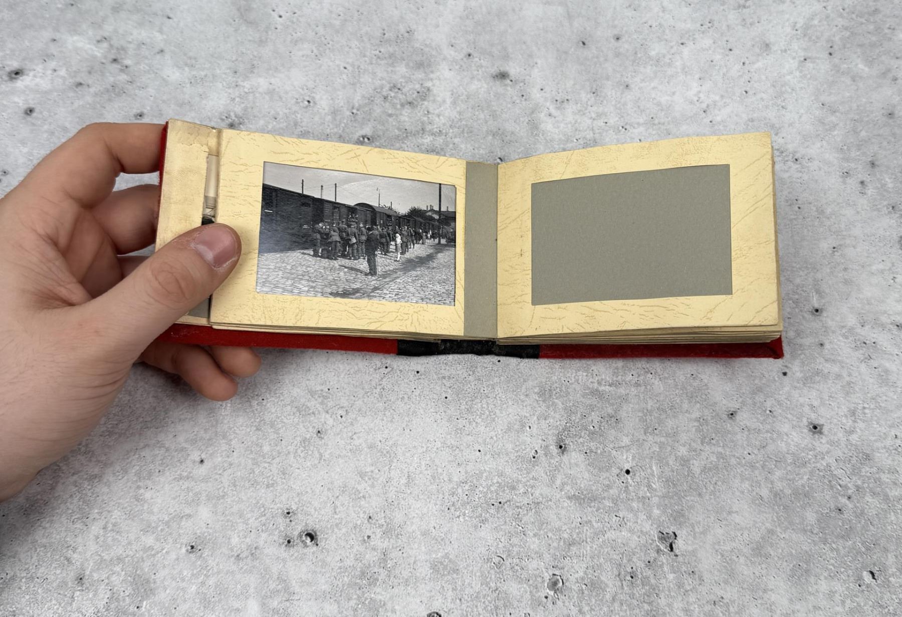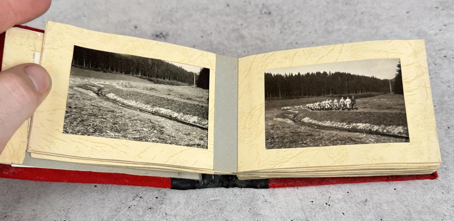 Contains 33 war time photos. Neat album, made from a wool banner or flag. 50 pages total. 5" by 3 3/8" by 1 7/8".