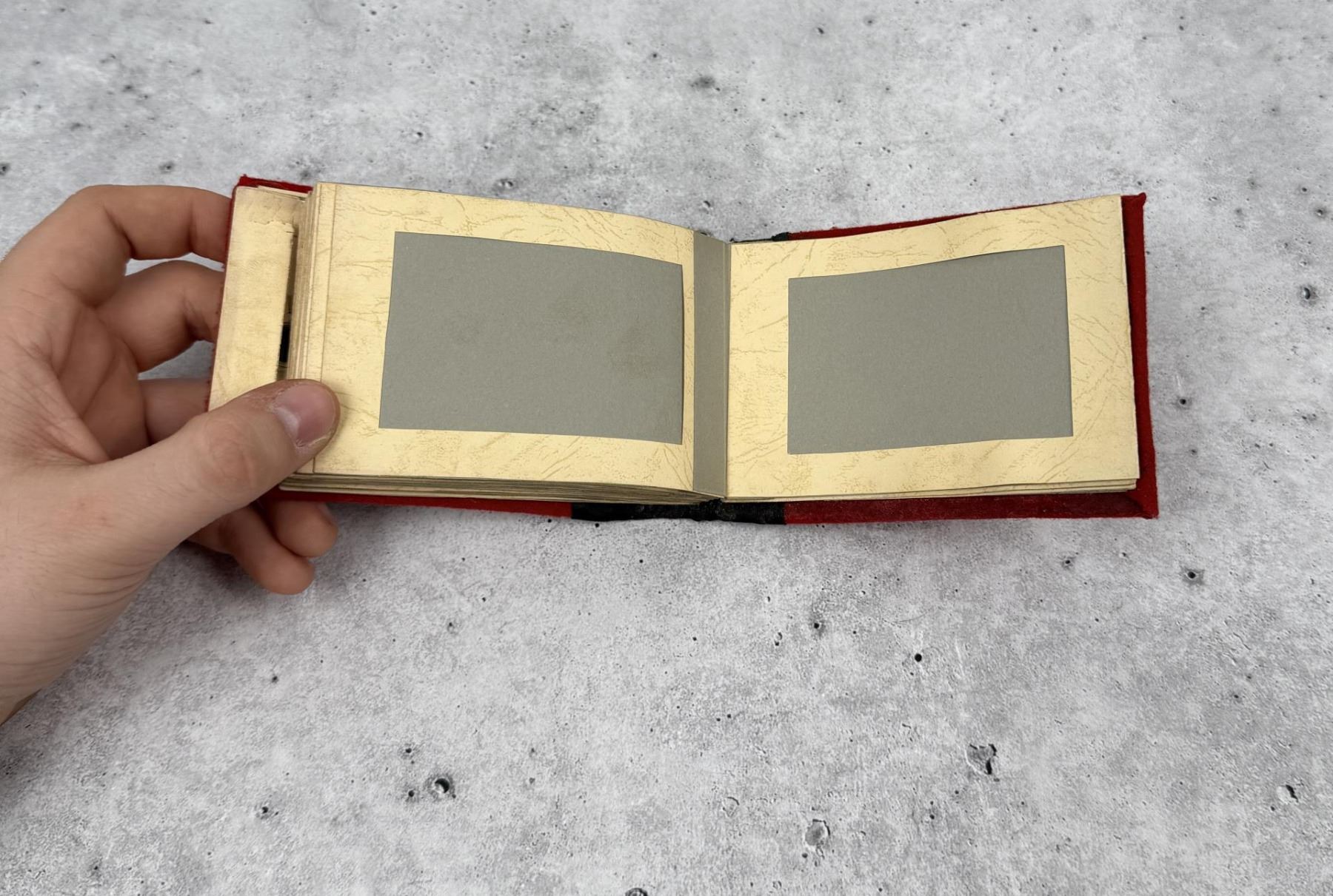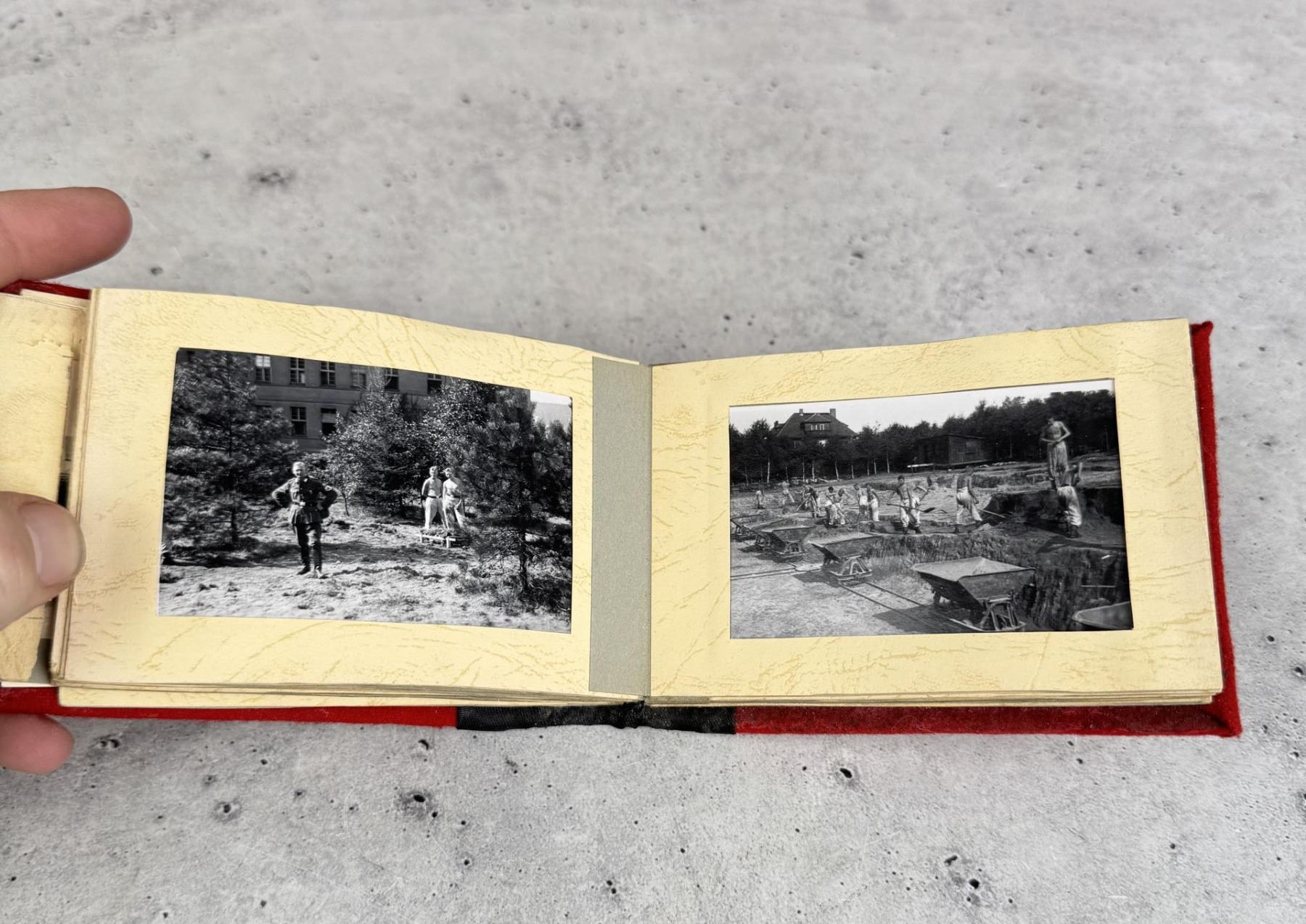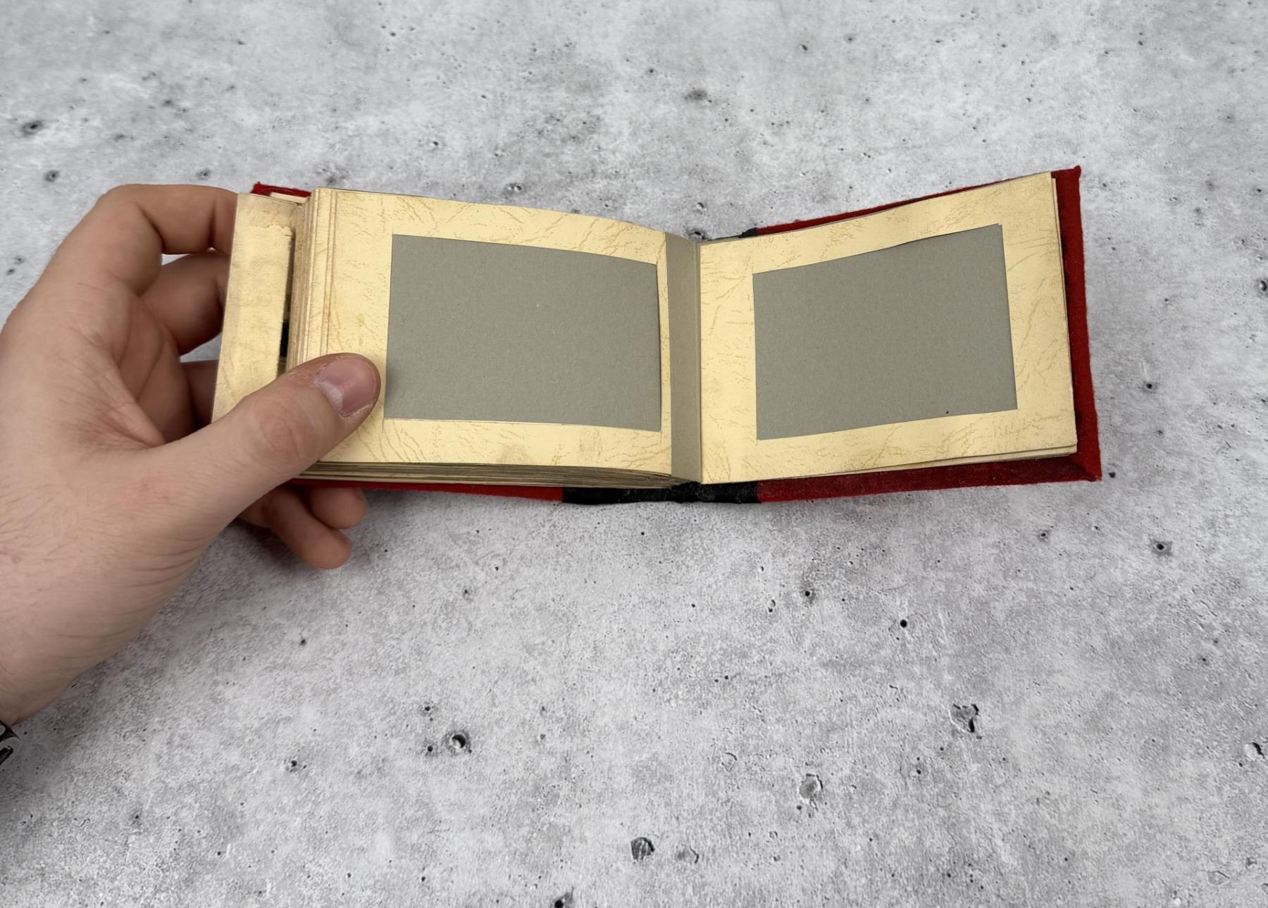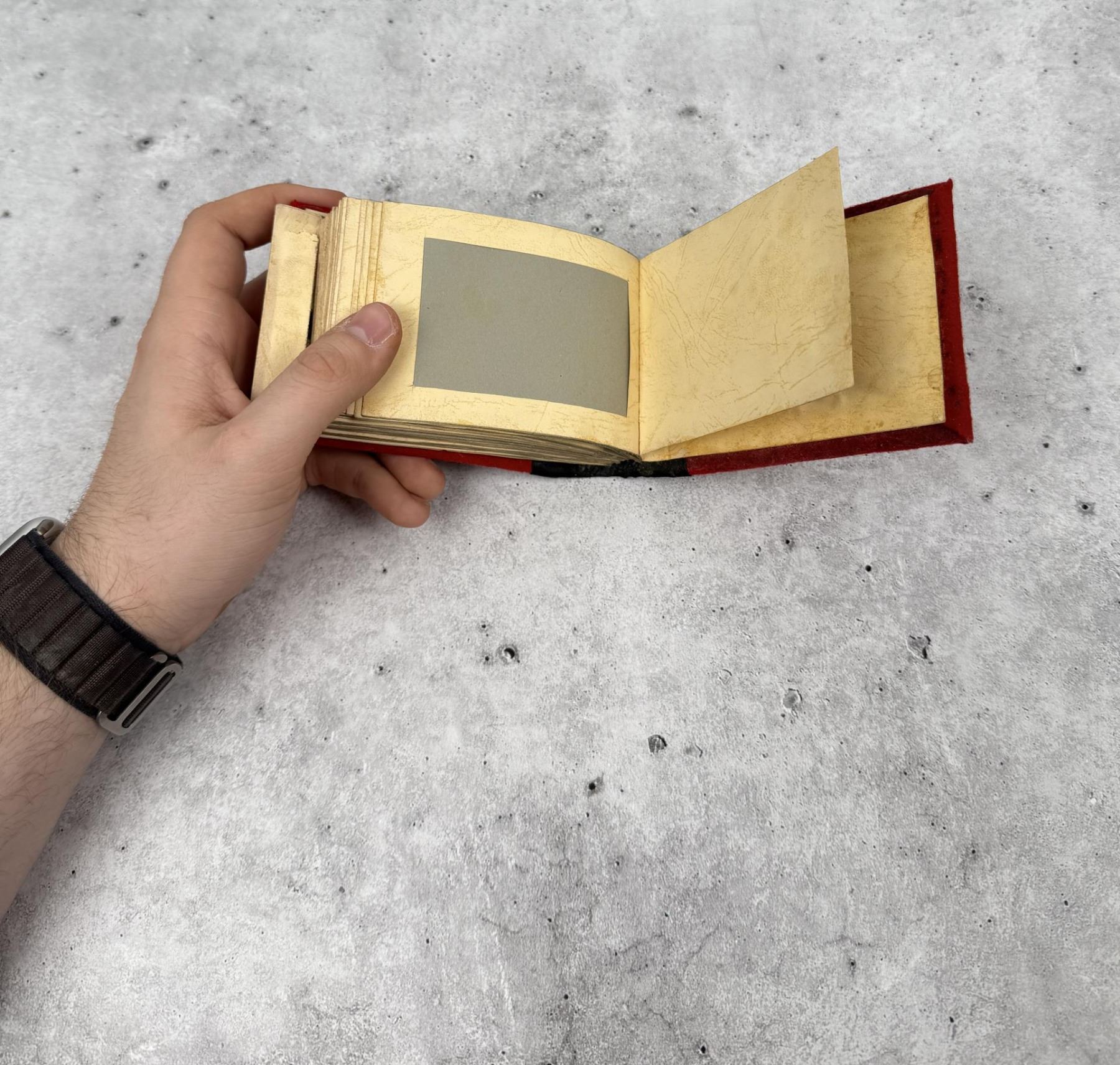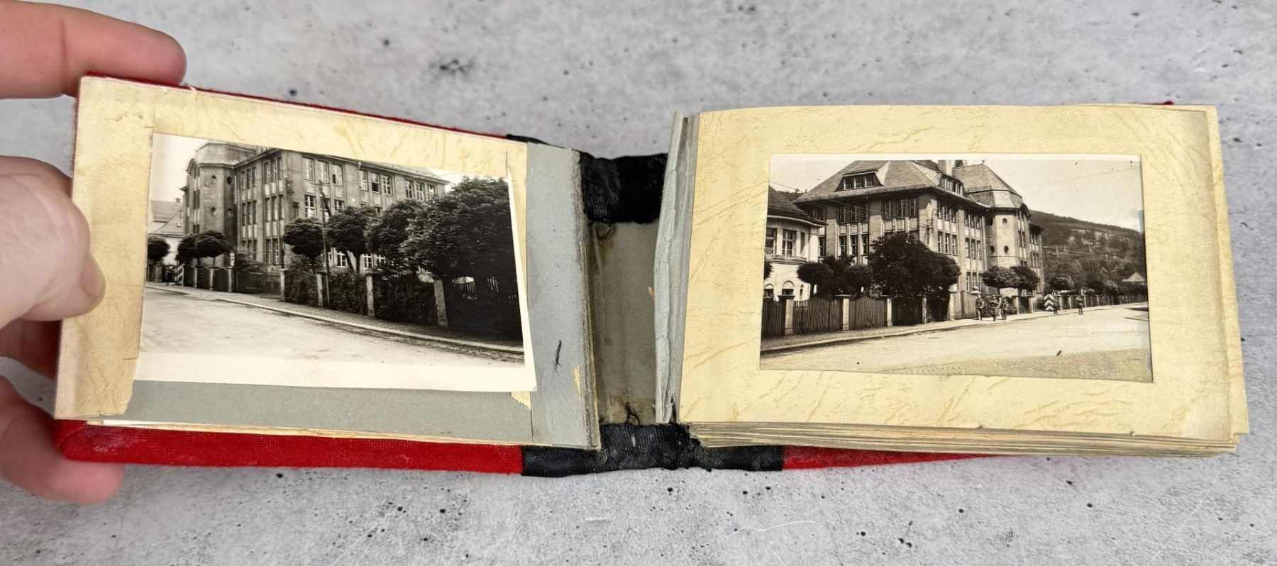 Contains 33 war time photos. Neat album, made from a wool banner or flag. 50 pages total. 5" by 3 3/8" by 1 7/8".