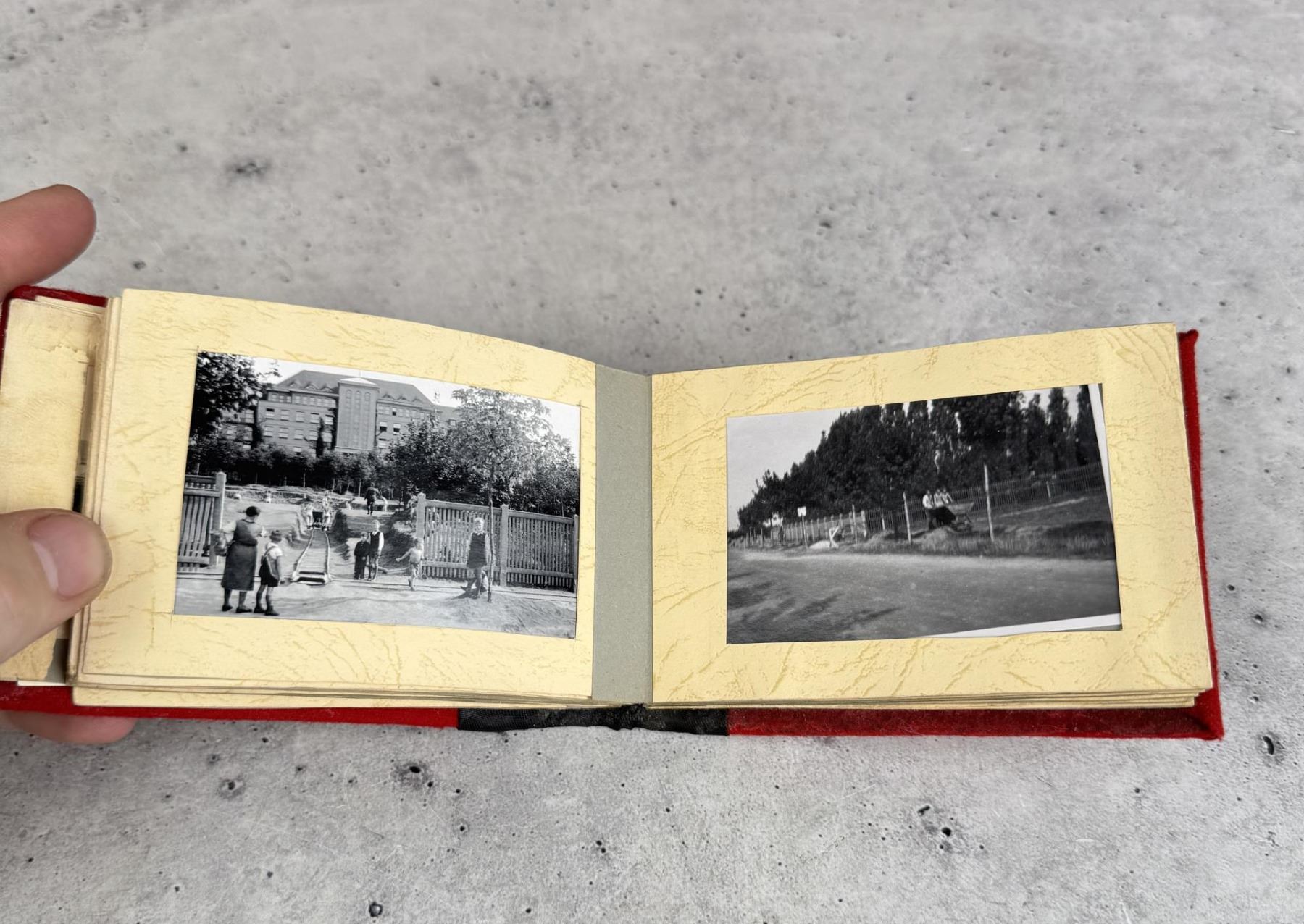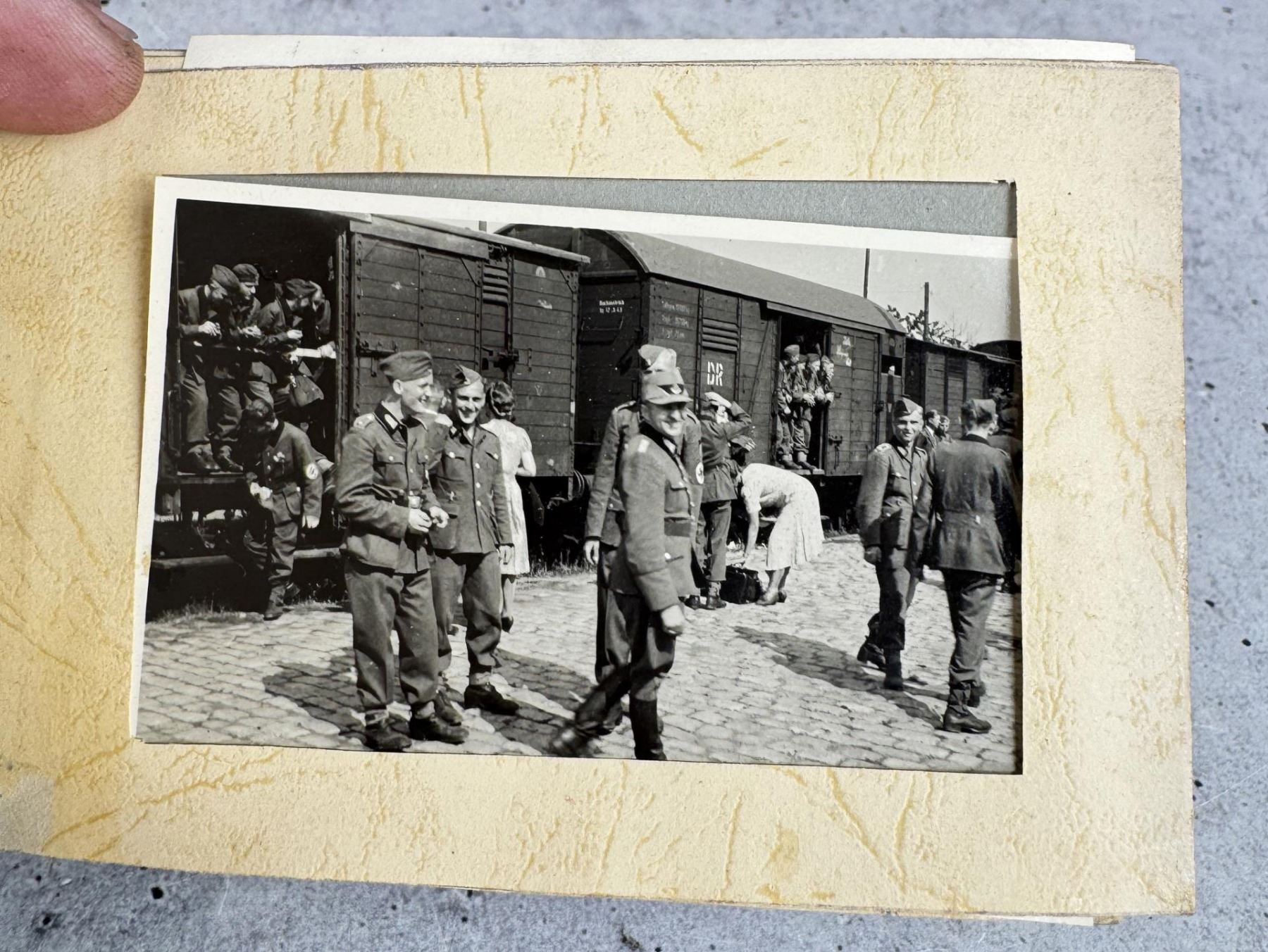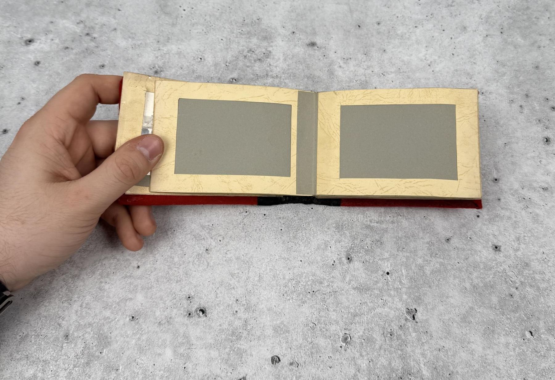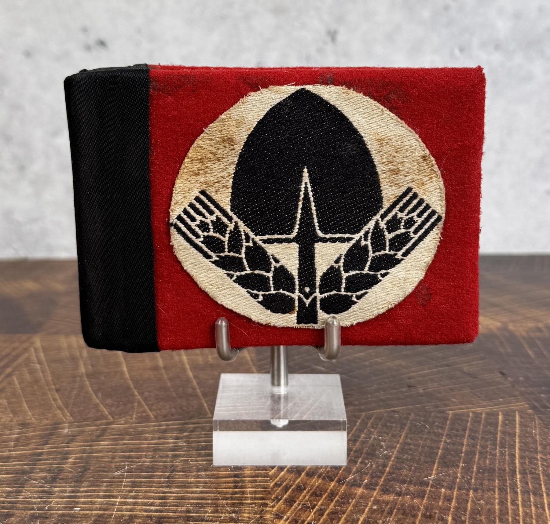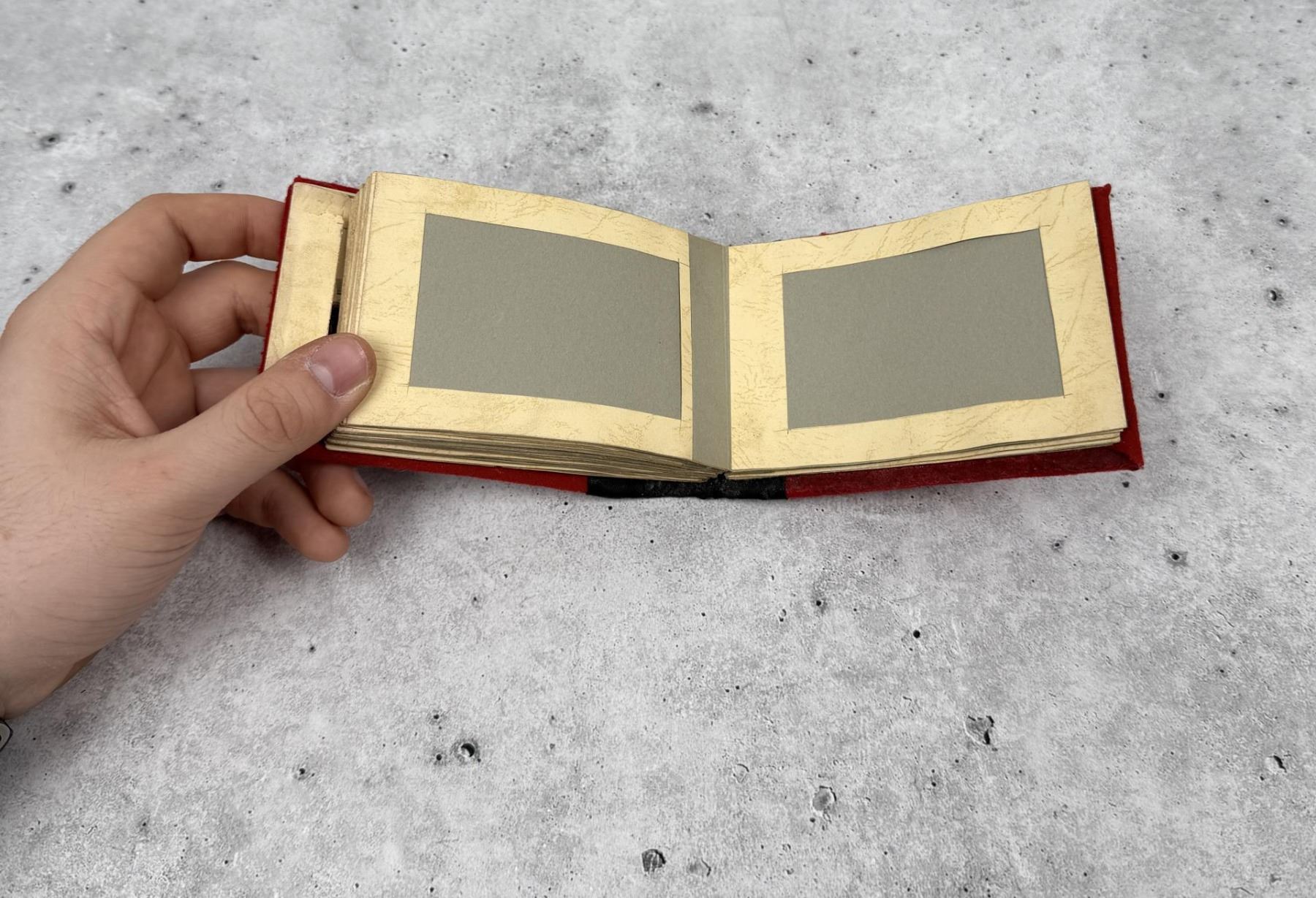 Contains 33 war time photos. Neat album, made from a wool banner or flag. 50 pages total. 5" by 3 3/8" by 1 7/8".